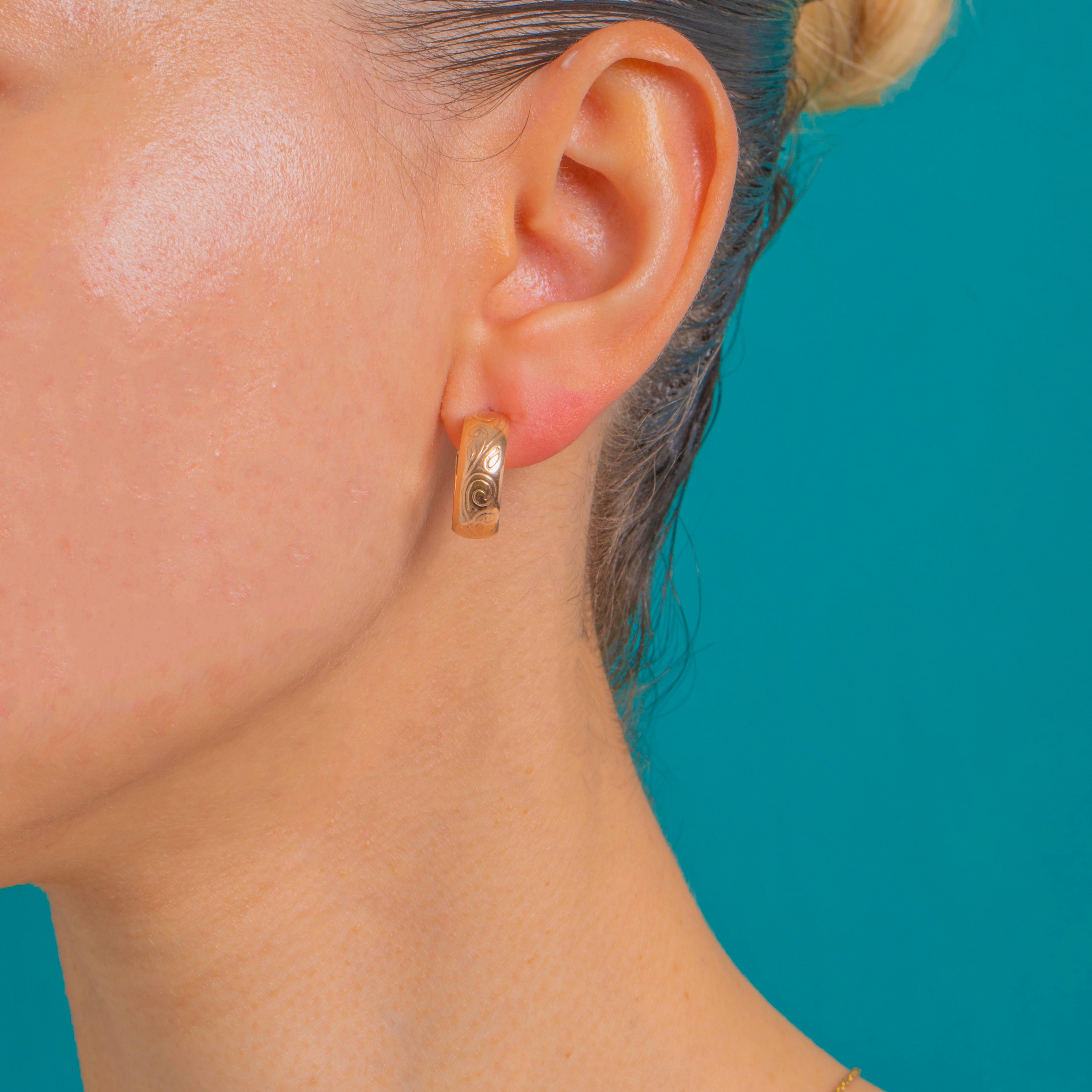 Crafted as compact half hoops that sit close to the ear, the low-relief engraving lends texture and light-play. A timeless pair—these are the kind of earrings you’ll reach for again and again.