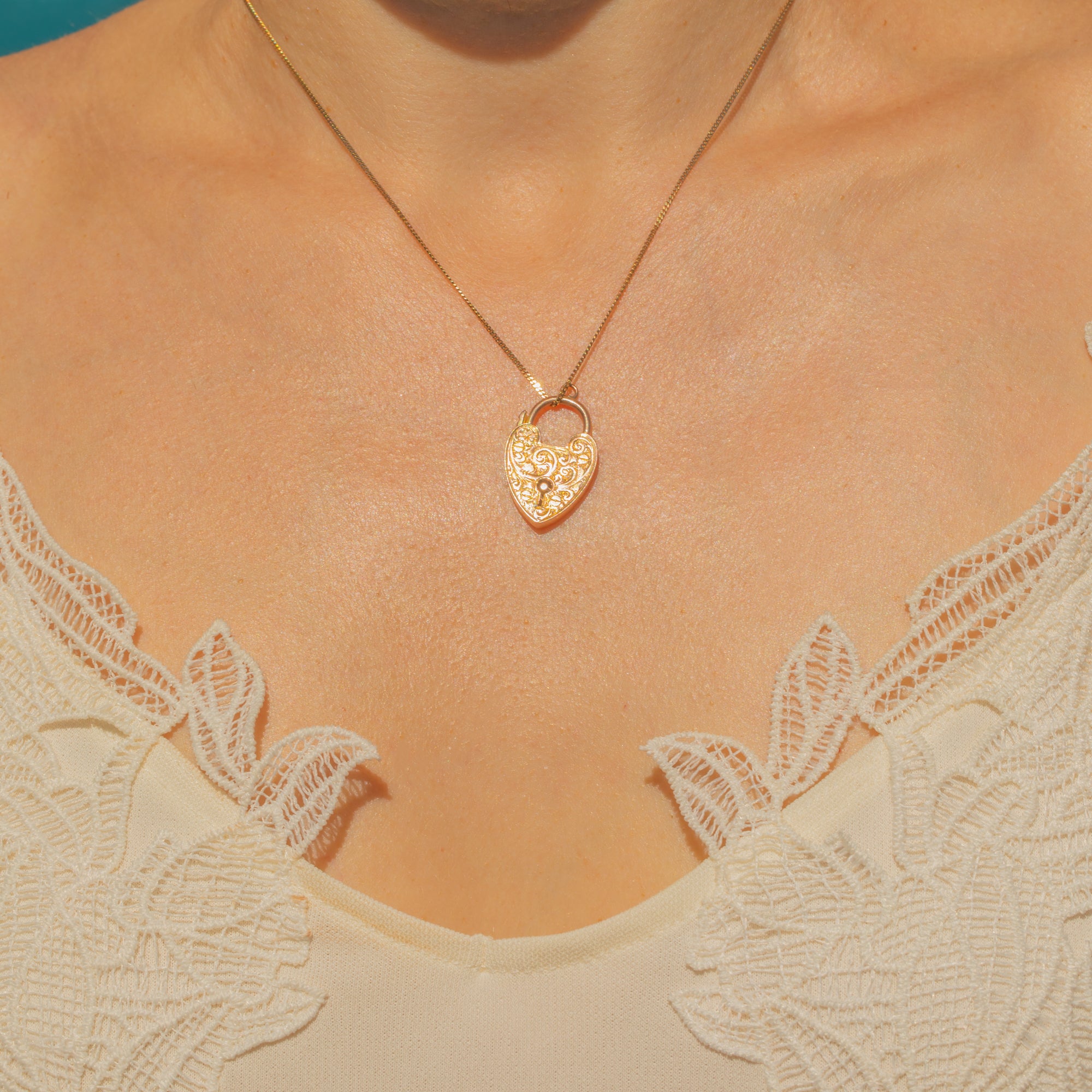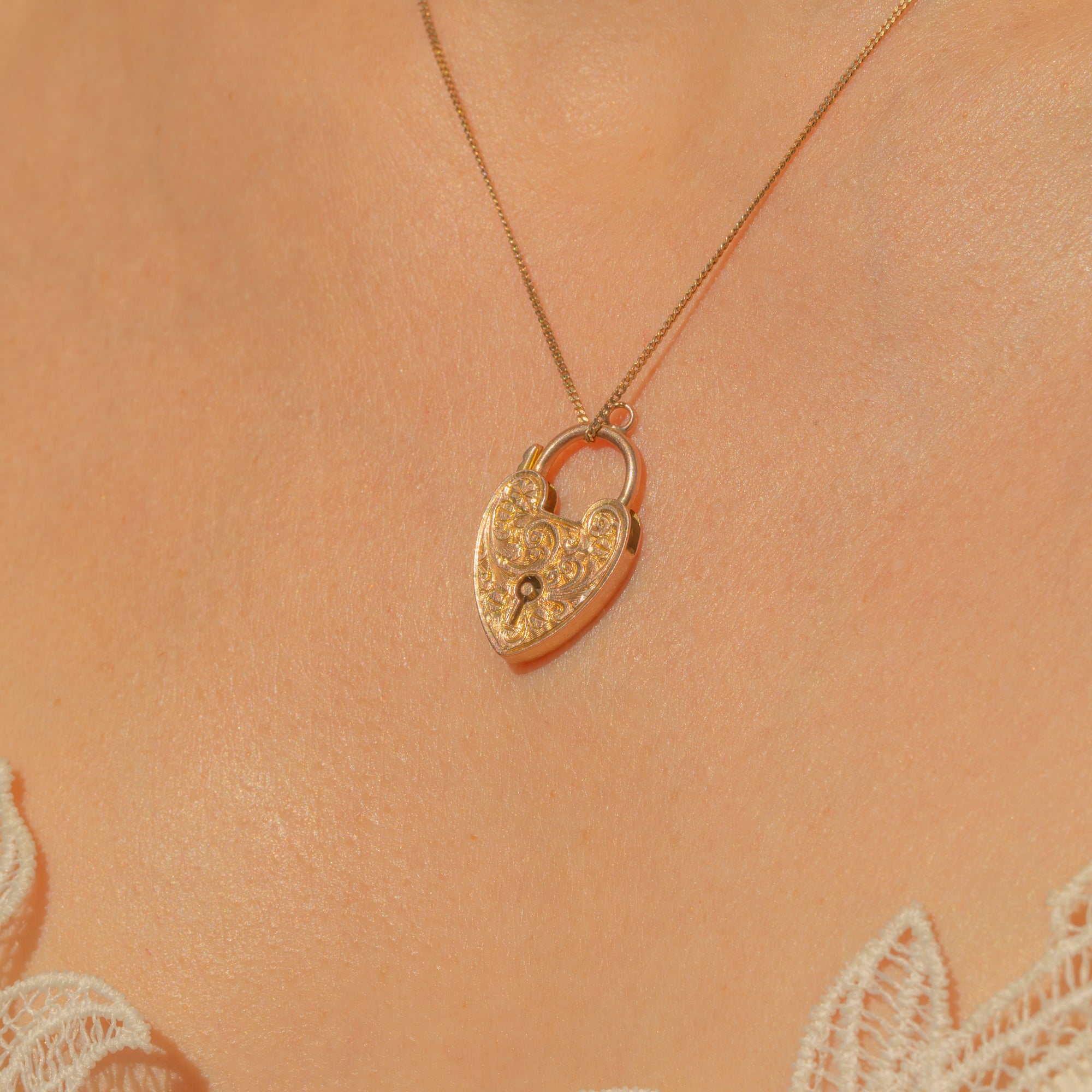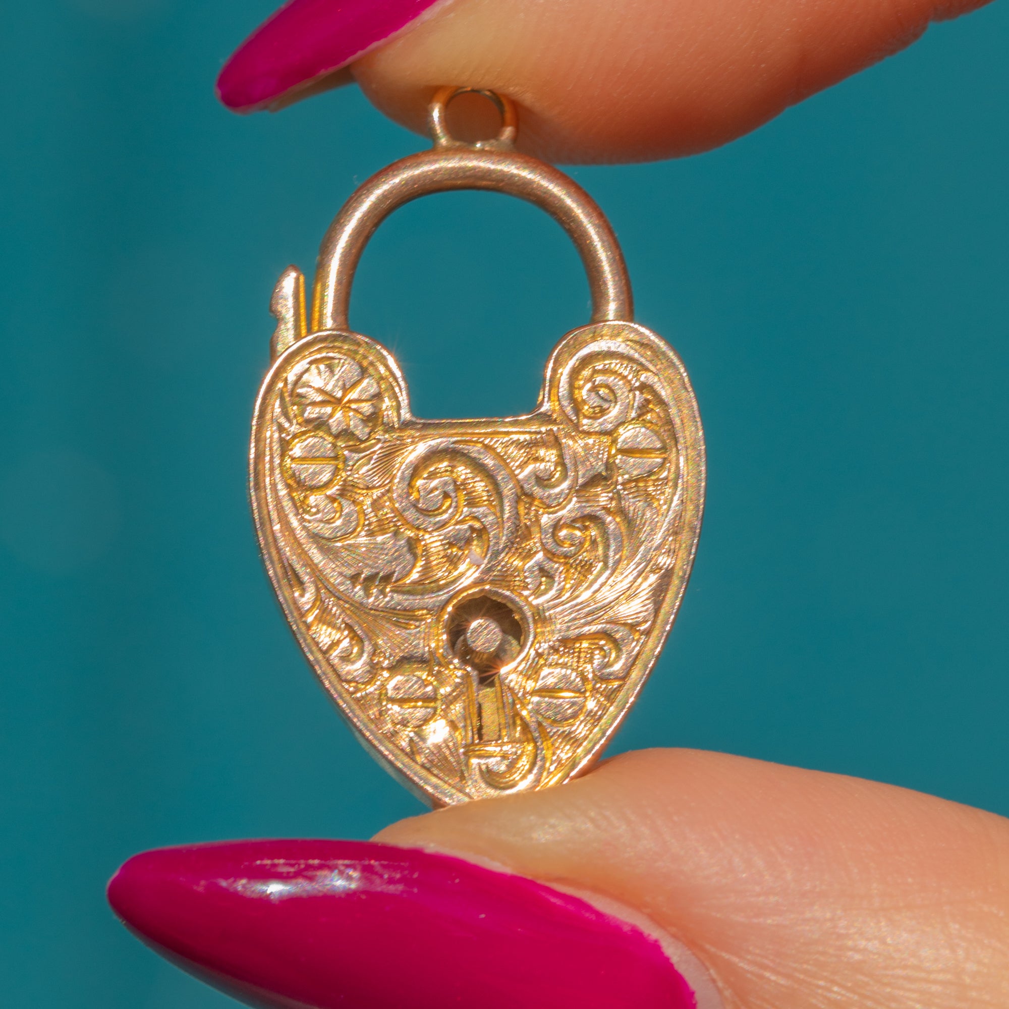 This Victorian heart padlock pendant is a lovely piece of chunky Gold. Beautifully engraved with foliate details, this antique padlock charm will bring a sentimental sweetness to your necklace stack or charm bracelet.