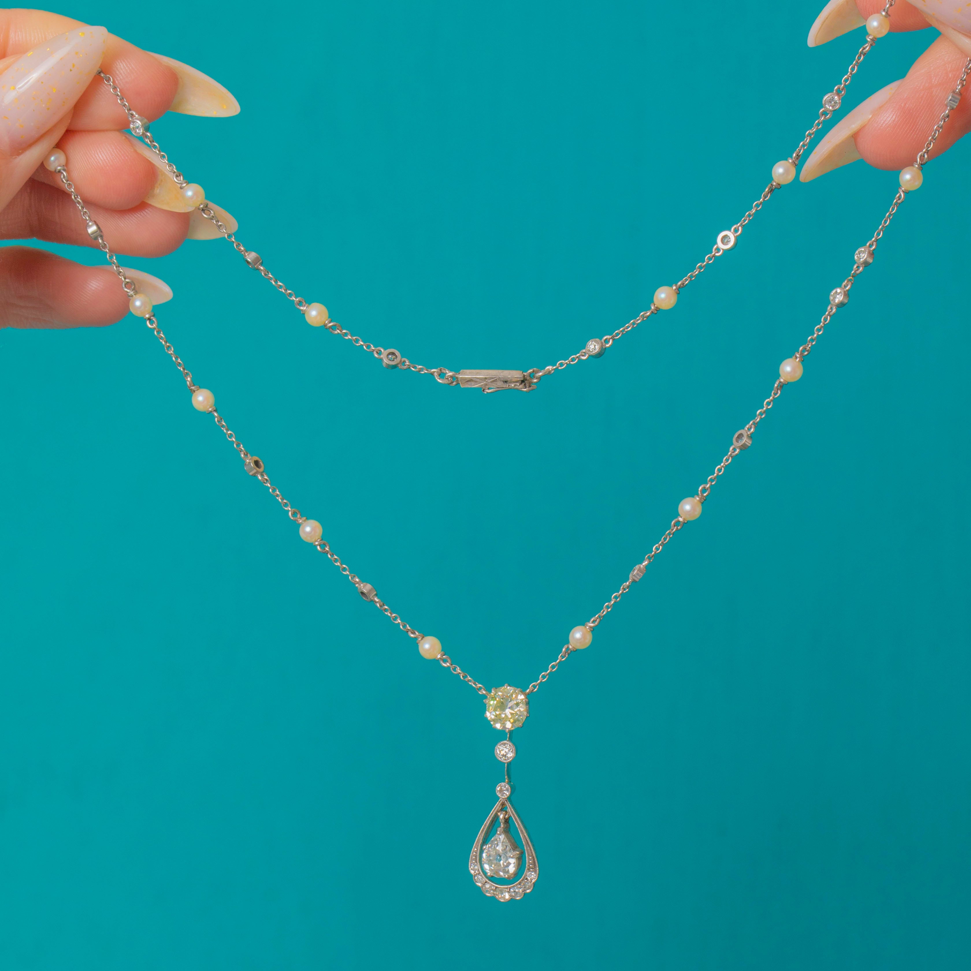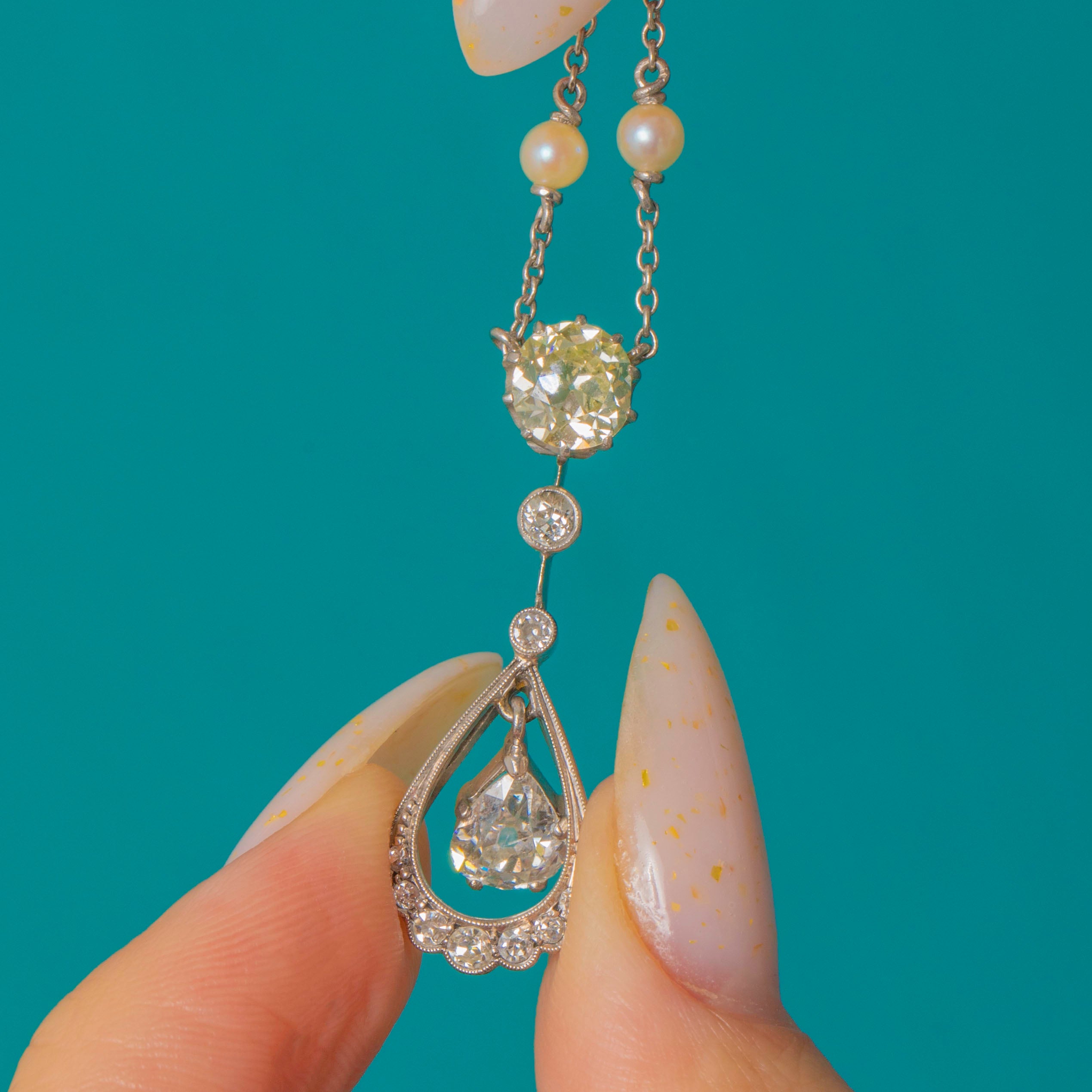 Antique 14ct Gold 1.70ct Old-Cut Diamond & Pearl Drop Necklace