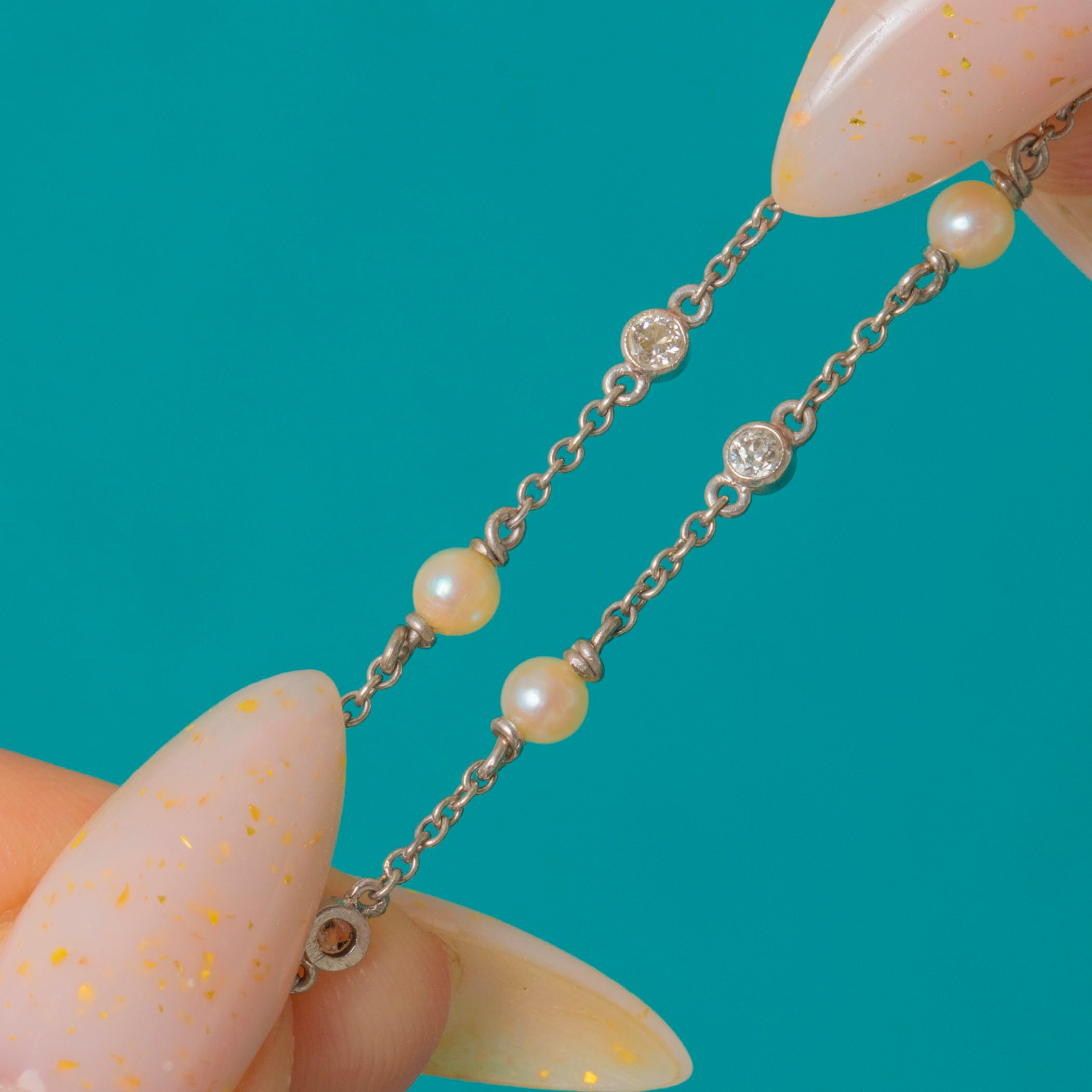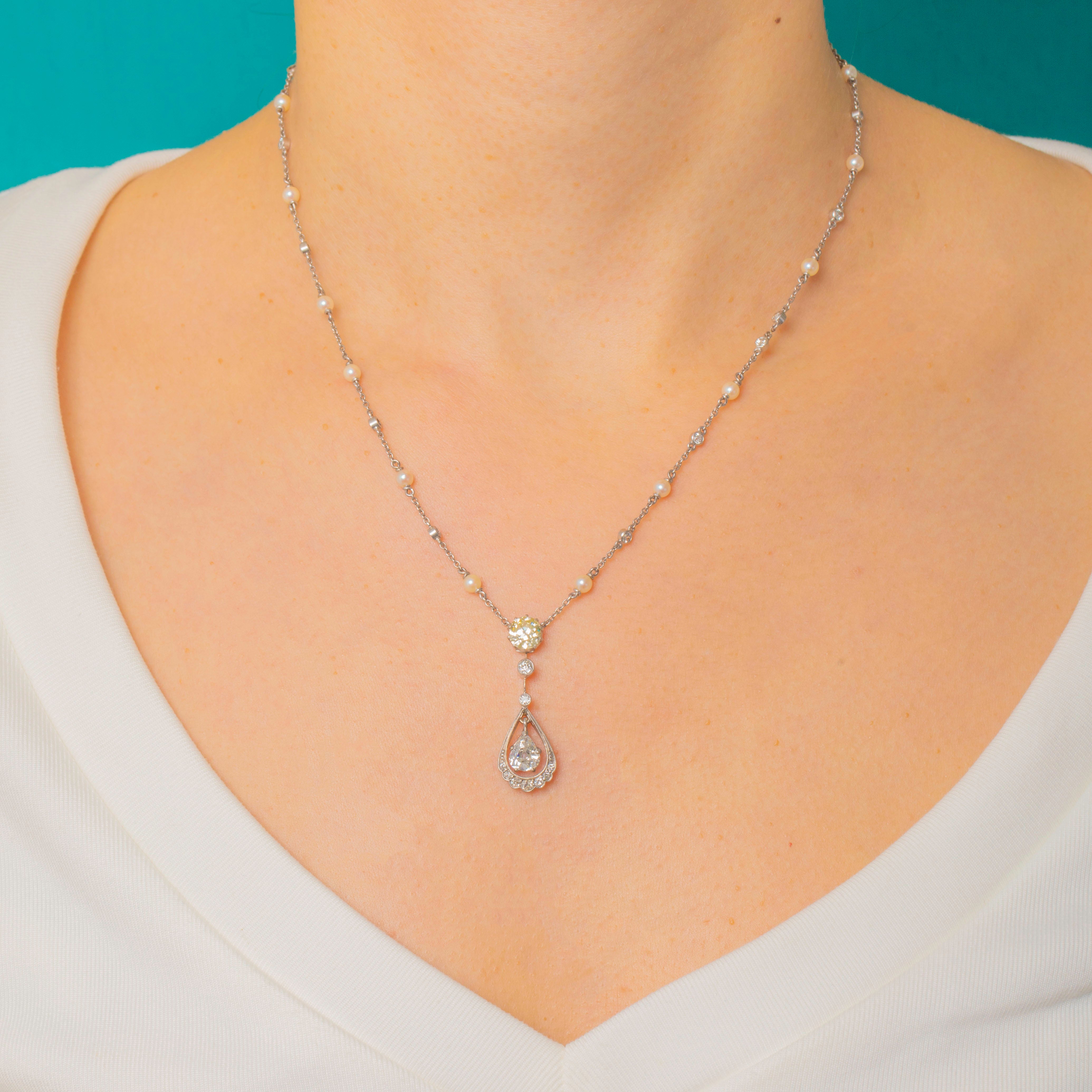 A delicate Edwardian Diamond and Pearl drop necklace, refined and romantic in every detail. The station chain is punctuated with tiny Seed Pearls and bezel-set old-cut Diamonds, guiding the eye to an articulated open teardrop pendant where an old pear-cut Diamond shimmers within a lace-like frame. Milgrain accents and airy piercing lend an exquisite lightness, finished with a beautifully engraved barrel clasp and safety catch for peace of mind.