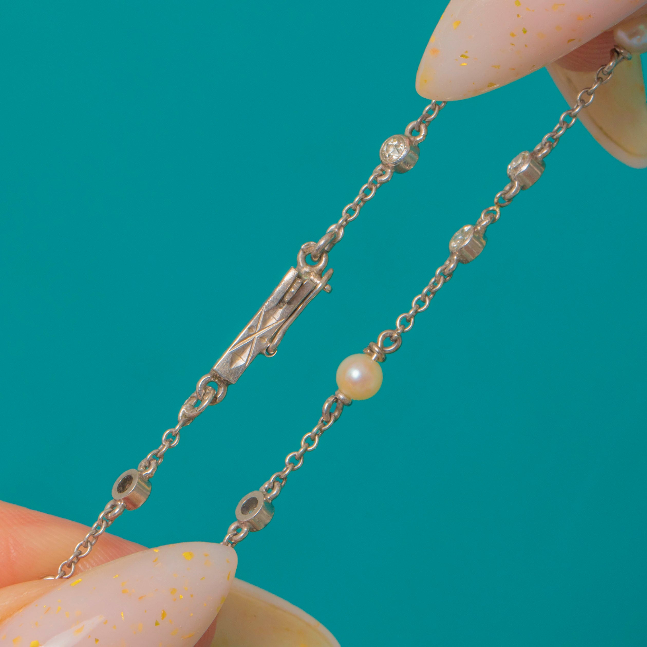 EXCELLENT: Diamonds are bright with no eye-visible chips, and the Seed Pearls are well-matched with a pleasing lustre. The settings and articulated components are secure, and the engraved clasp with safety catch closes firmly. Only light surface wear and a gentle patina consistent with age; no visible repairs.