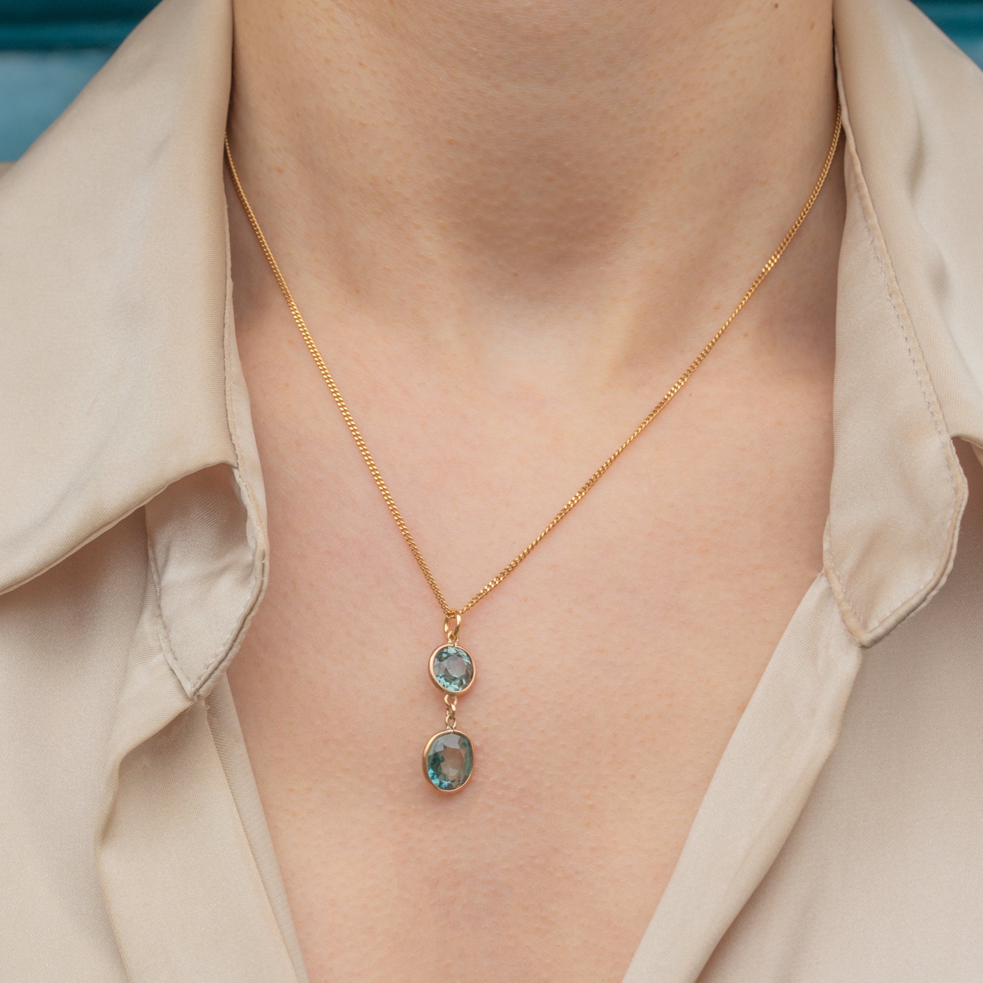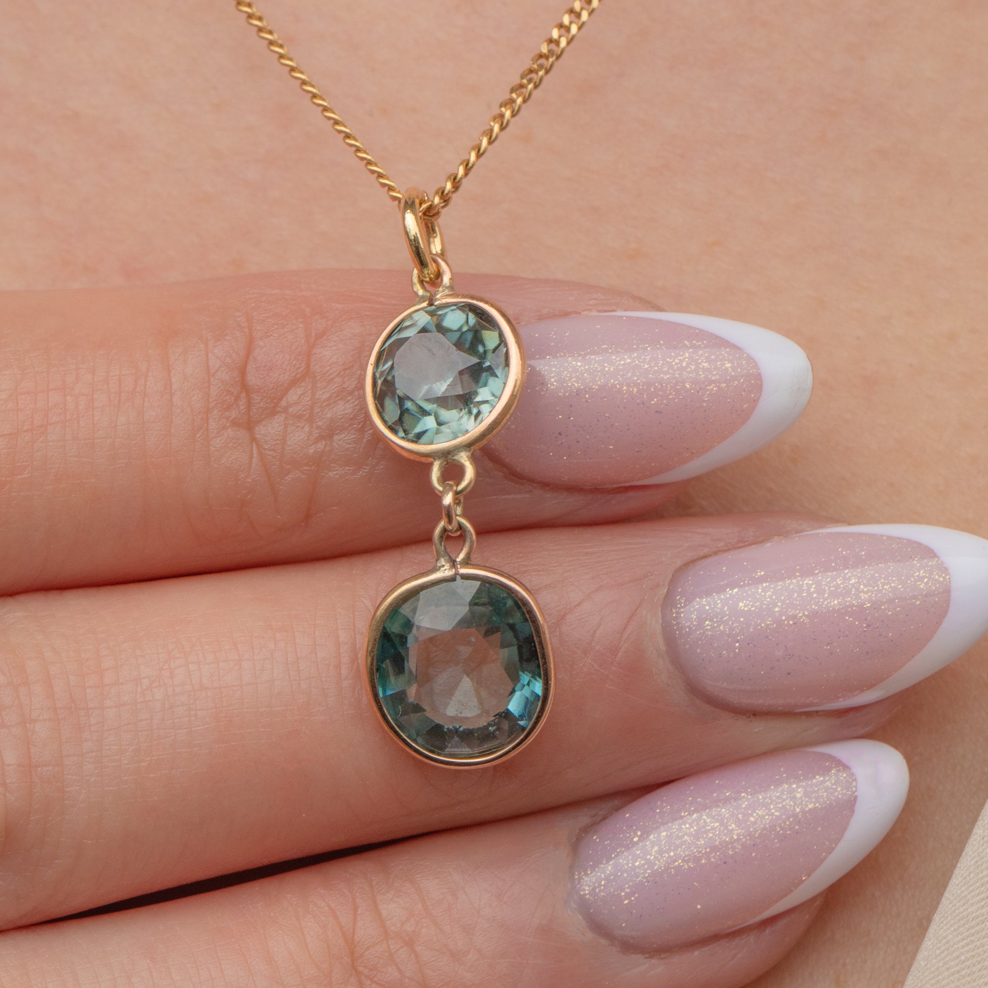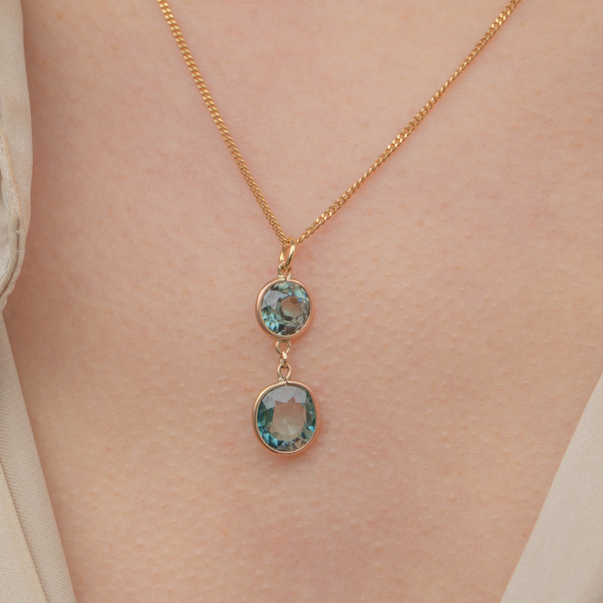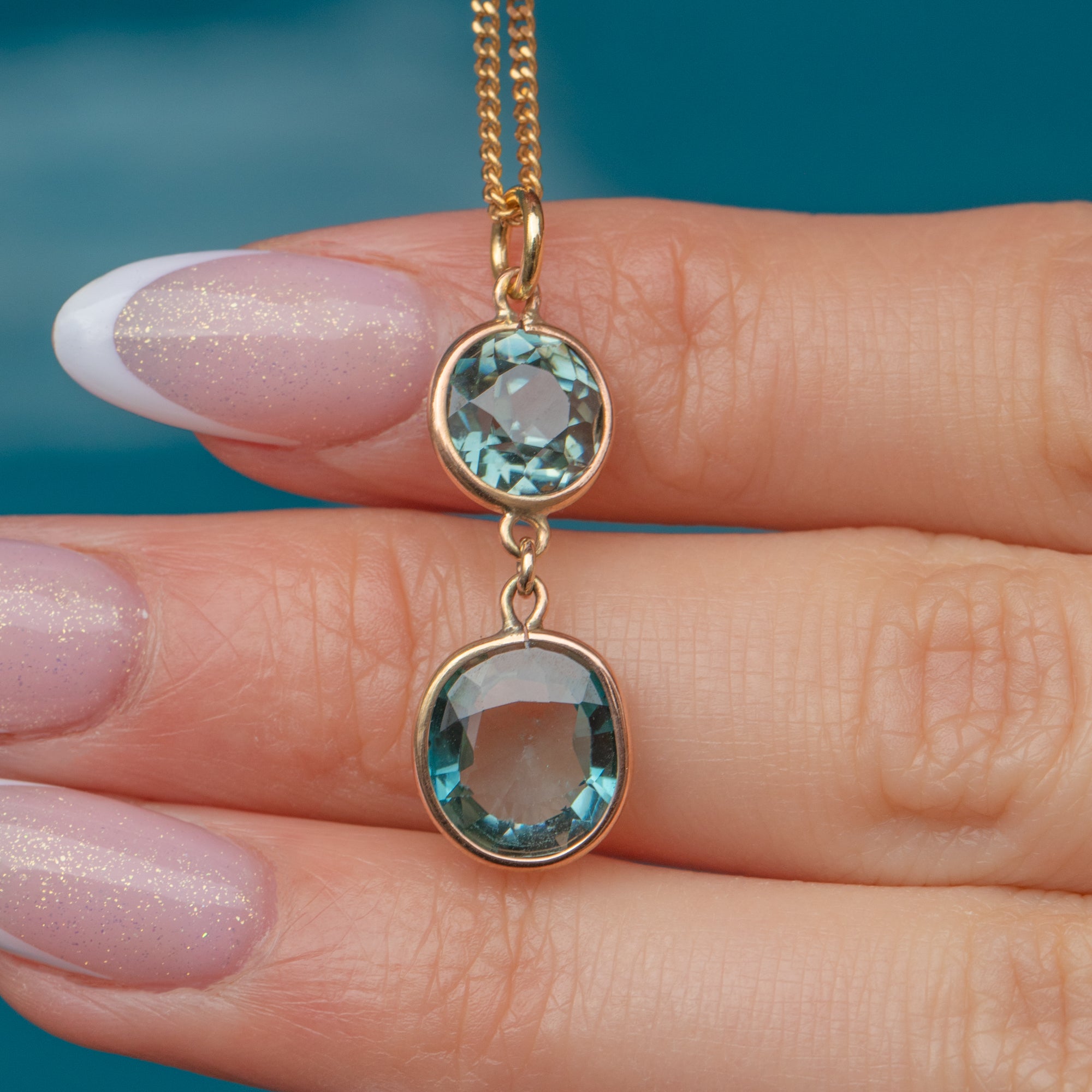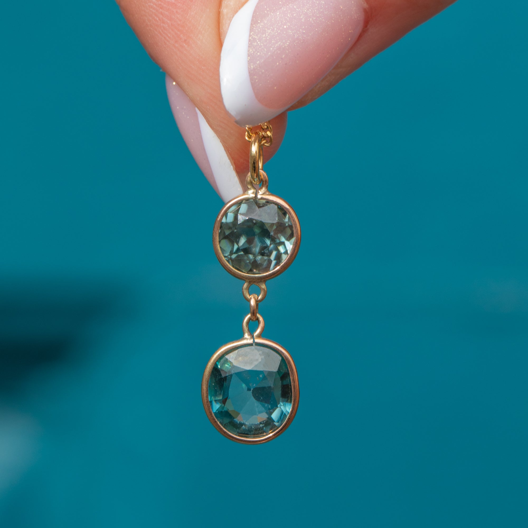 This magnificent antique 14ct Gold Blue Zircon drop charm is an absolute delight! Adorned with two radiant starlite Blue Zircons, she glistens effortlessly, casting a luminous glow with every tilt.