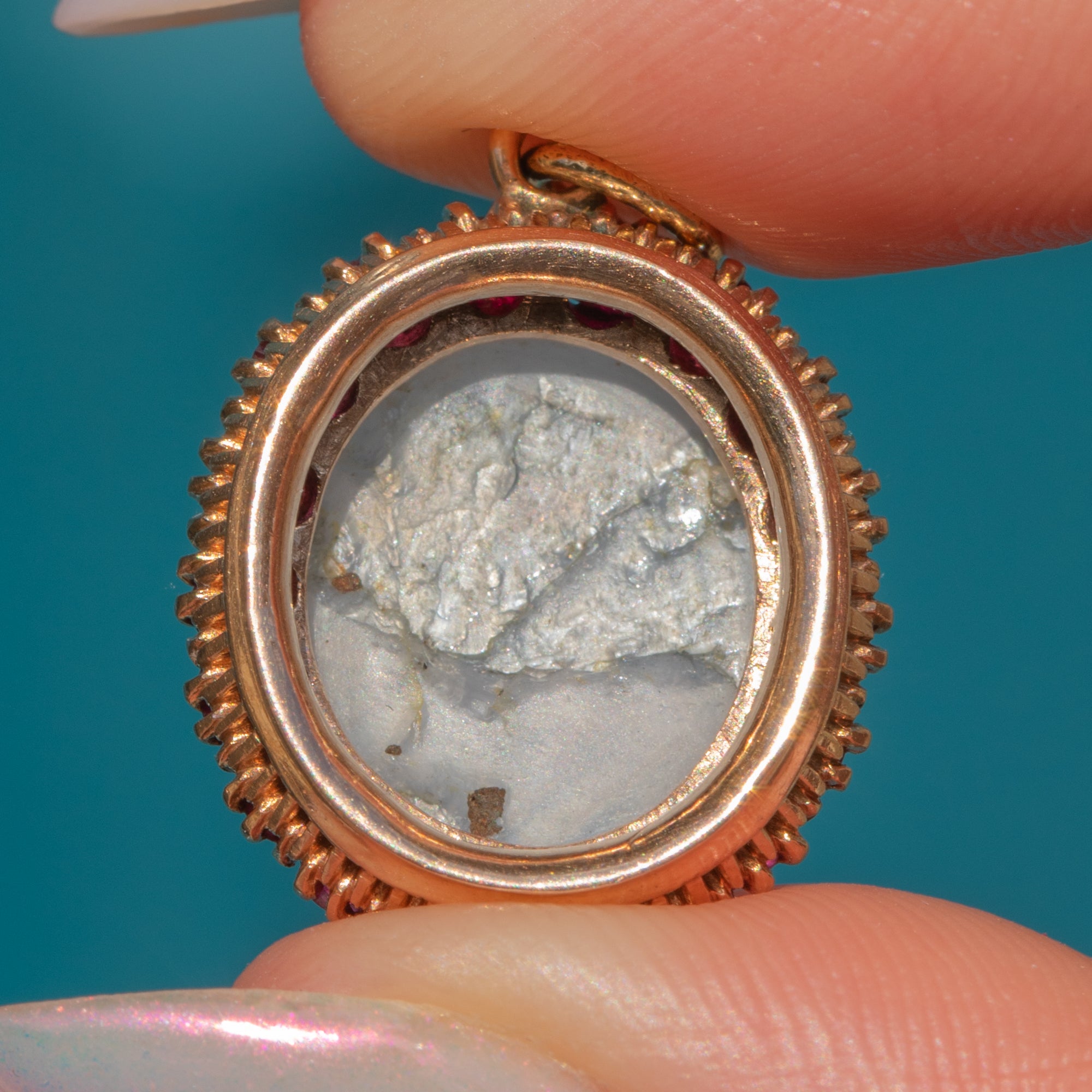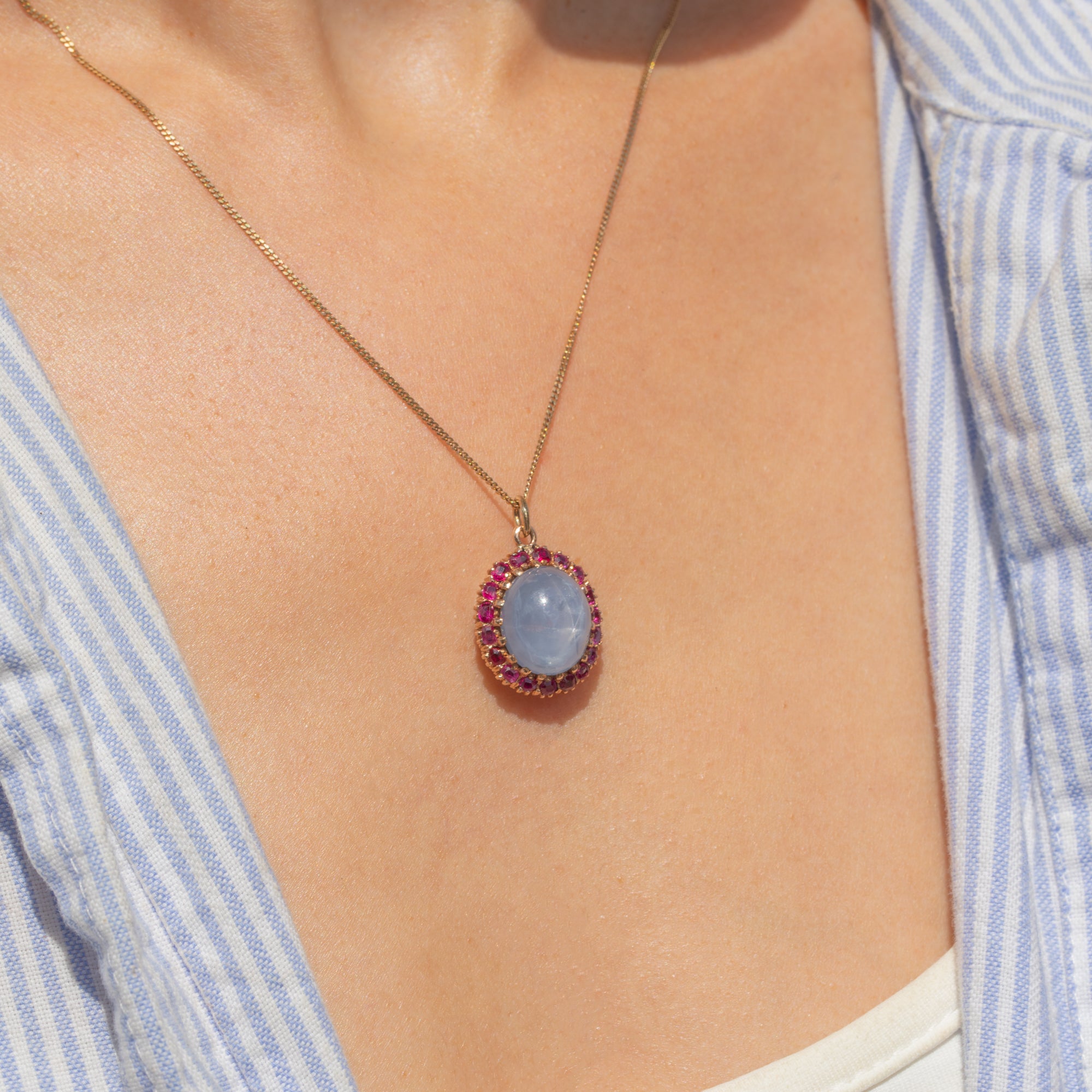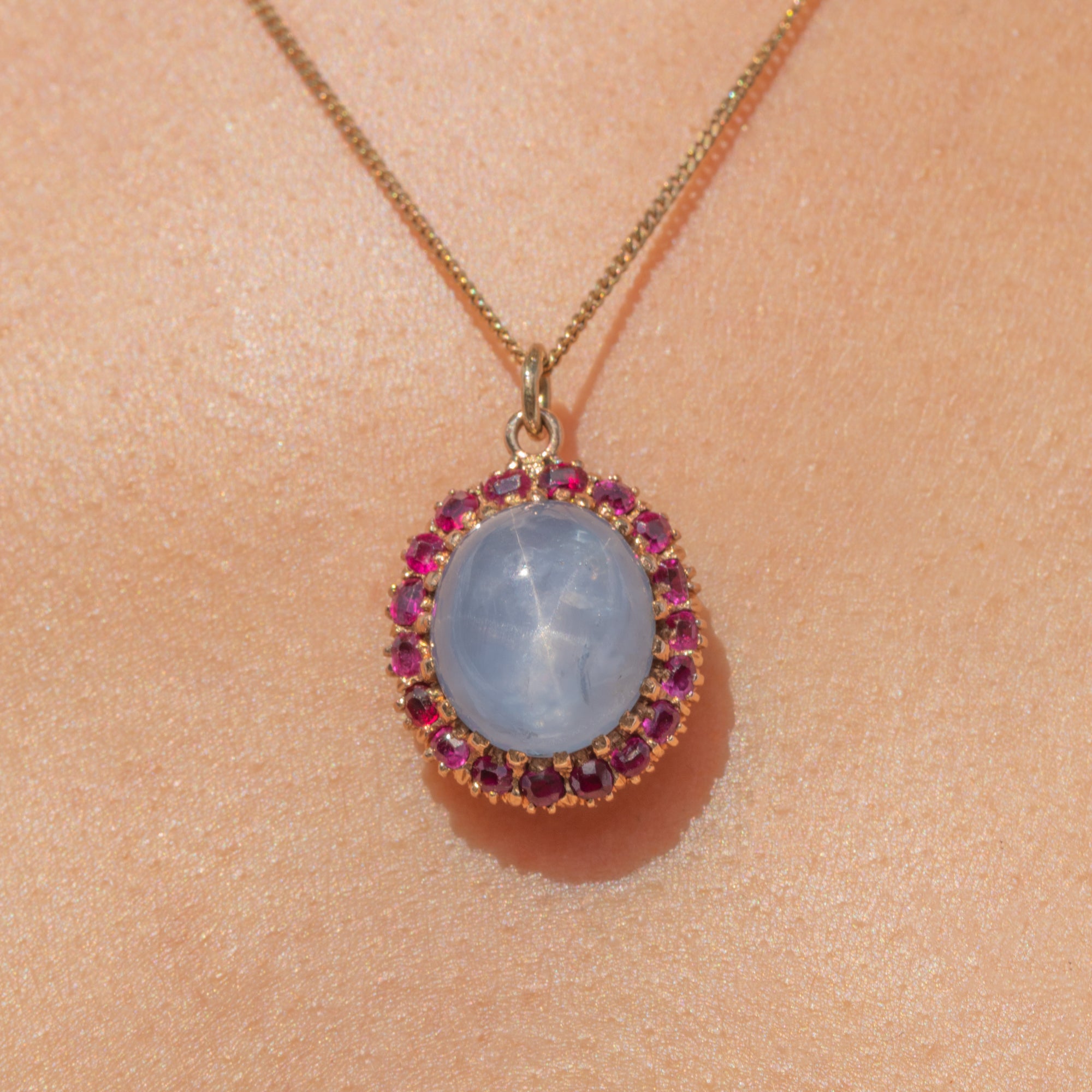 This antique 14ct Gold natural Star Sapphire Ruby cluster pendant is a sight to behold! This graceful Edwardian pendant features a luminous natural Star Sapphire, her silken asterism gently shimmering across the surface like moonlight reflected in water. Encircling the central gem is a vivid halo of Rubies, their deep pink-red tones offering a beautiful contrast and enhancing the Sapphire’s mysterious, ethereal glow.