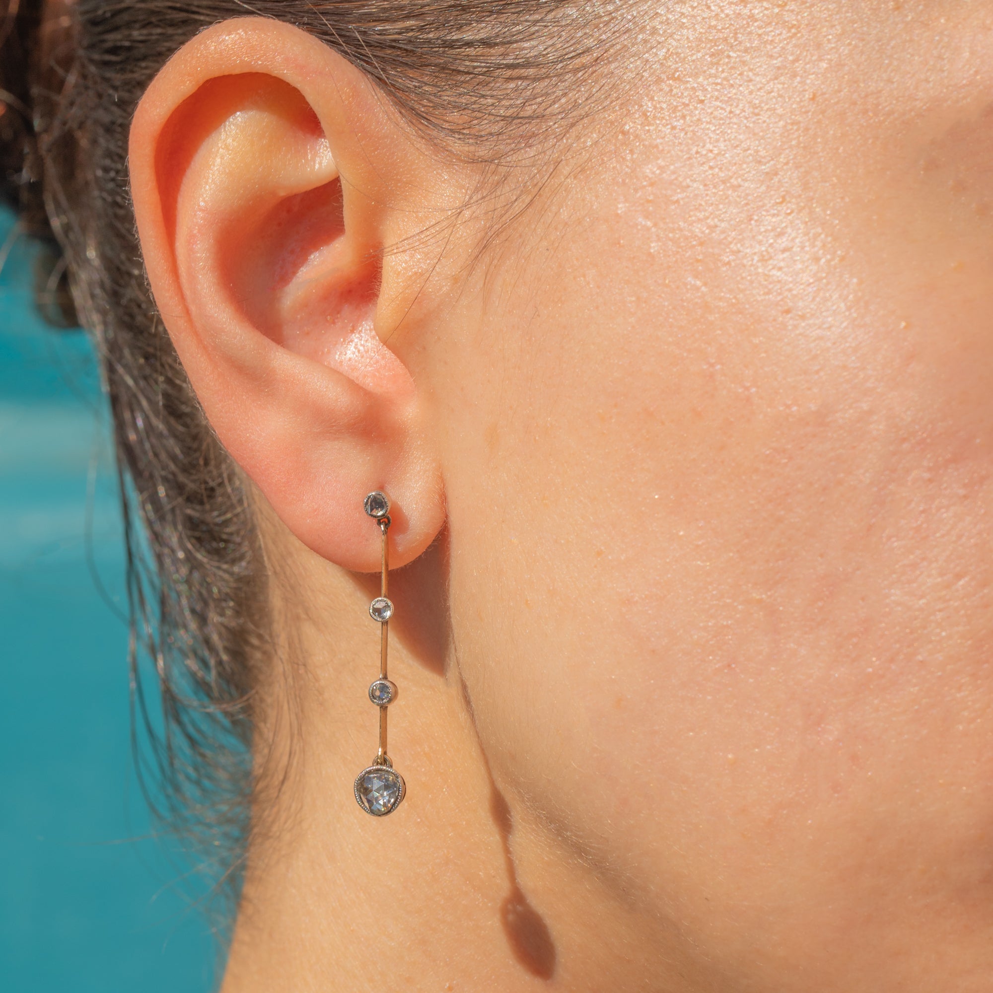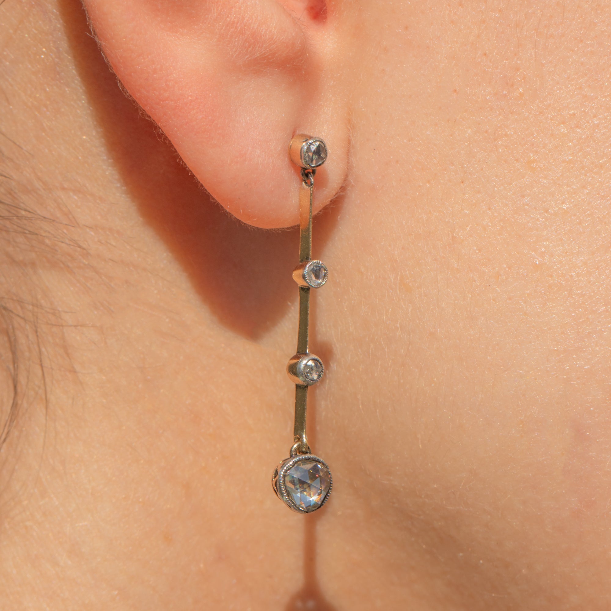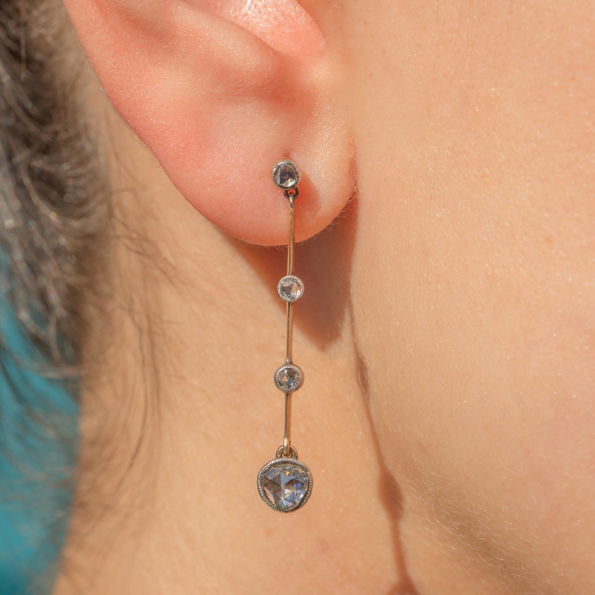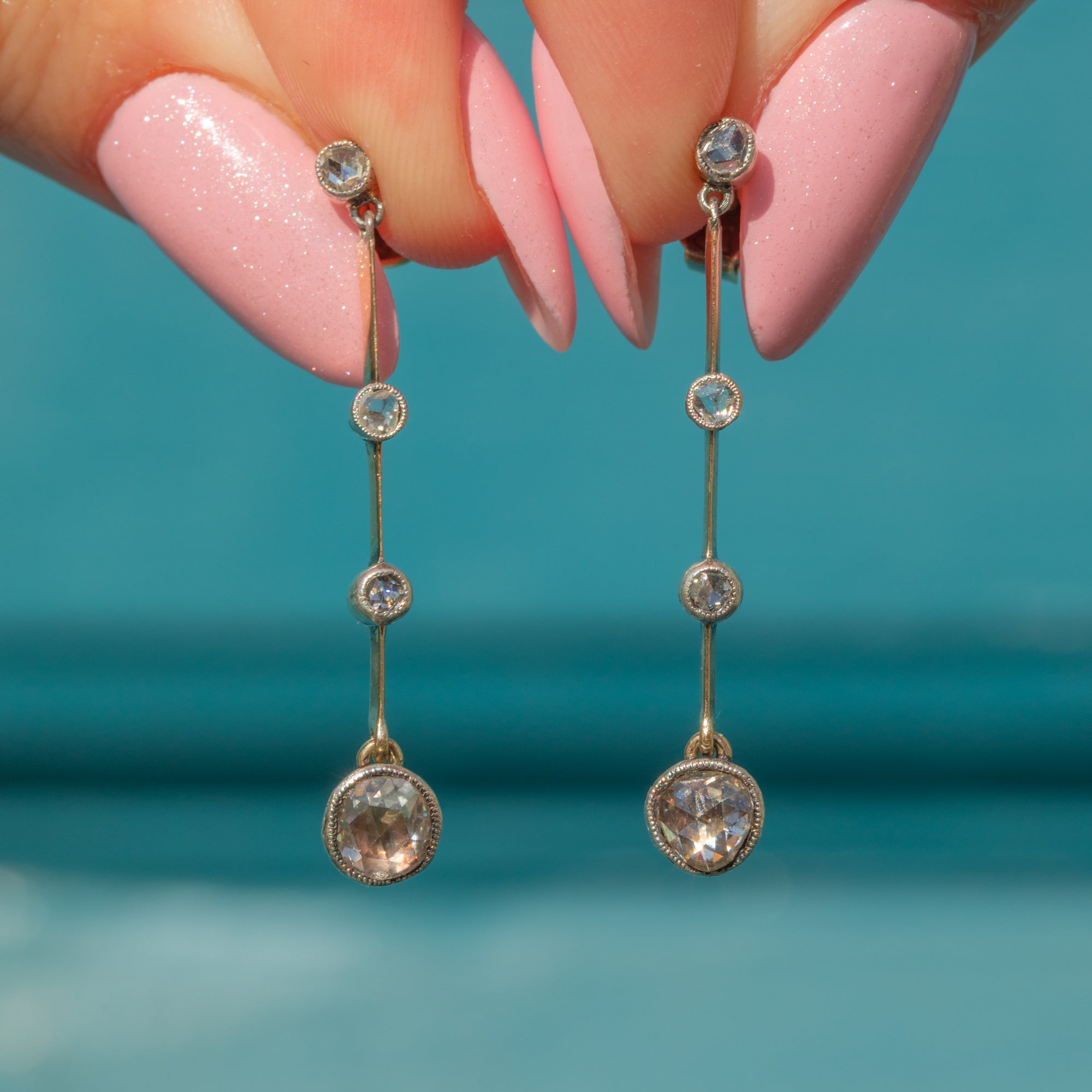 These antique 14ct Gold rose-cut Diamond drop earrings will bestow your lobes with undeniable elegance! Falling gracefully along the jawline, each earring displays four scintillating rose-cut Diamonds set within Silver bezels to enhance their brilliance.