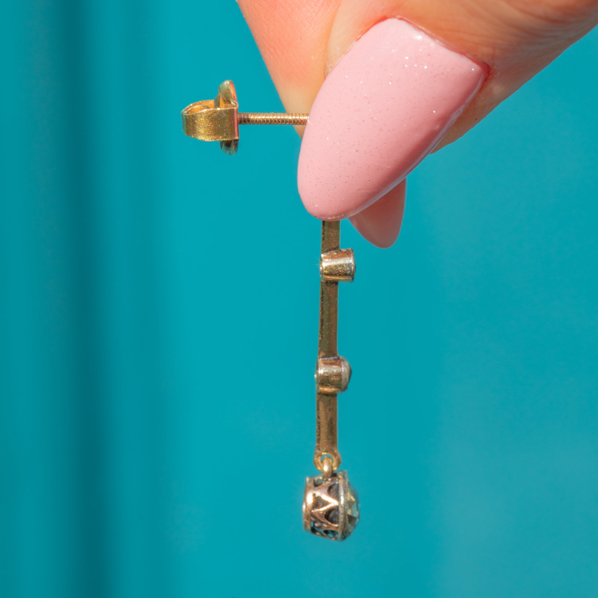 VERY GOOD-EXCELLENT: These antique 14ct Gold rose-cut Diamond drop earrings are in wonderful condition. The Diamonds have been beautifully preserved with no visible abrasions of fleabites. The Silver is bright and although there is some surface wear to the bezels, they remain robust and hold the Diamonds securely in place. Each component is securely affixed and the screw backs will allow you to dance the night away without a care in the world!