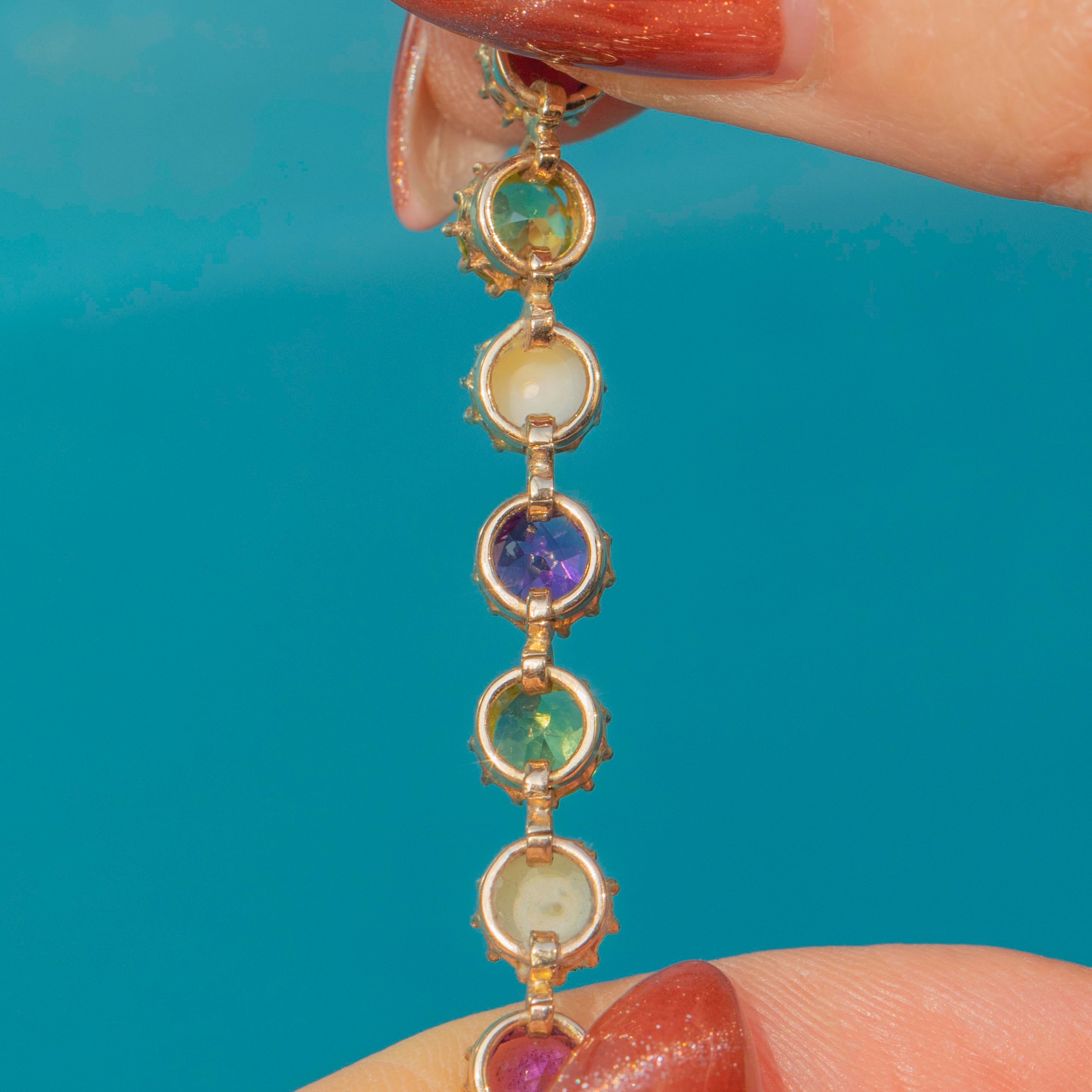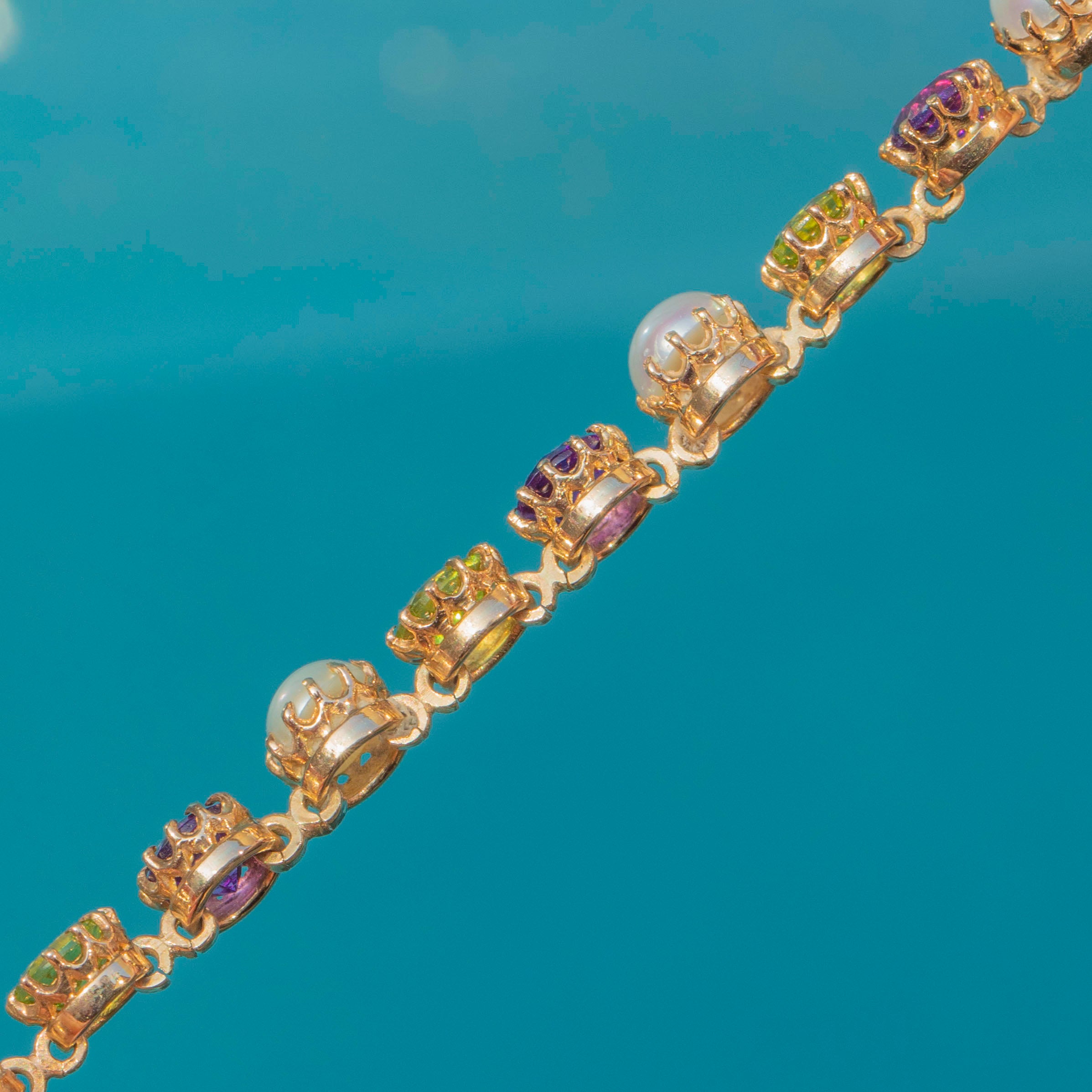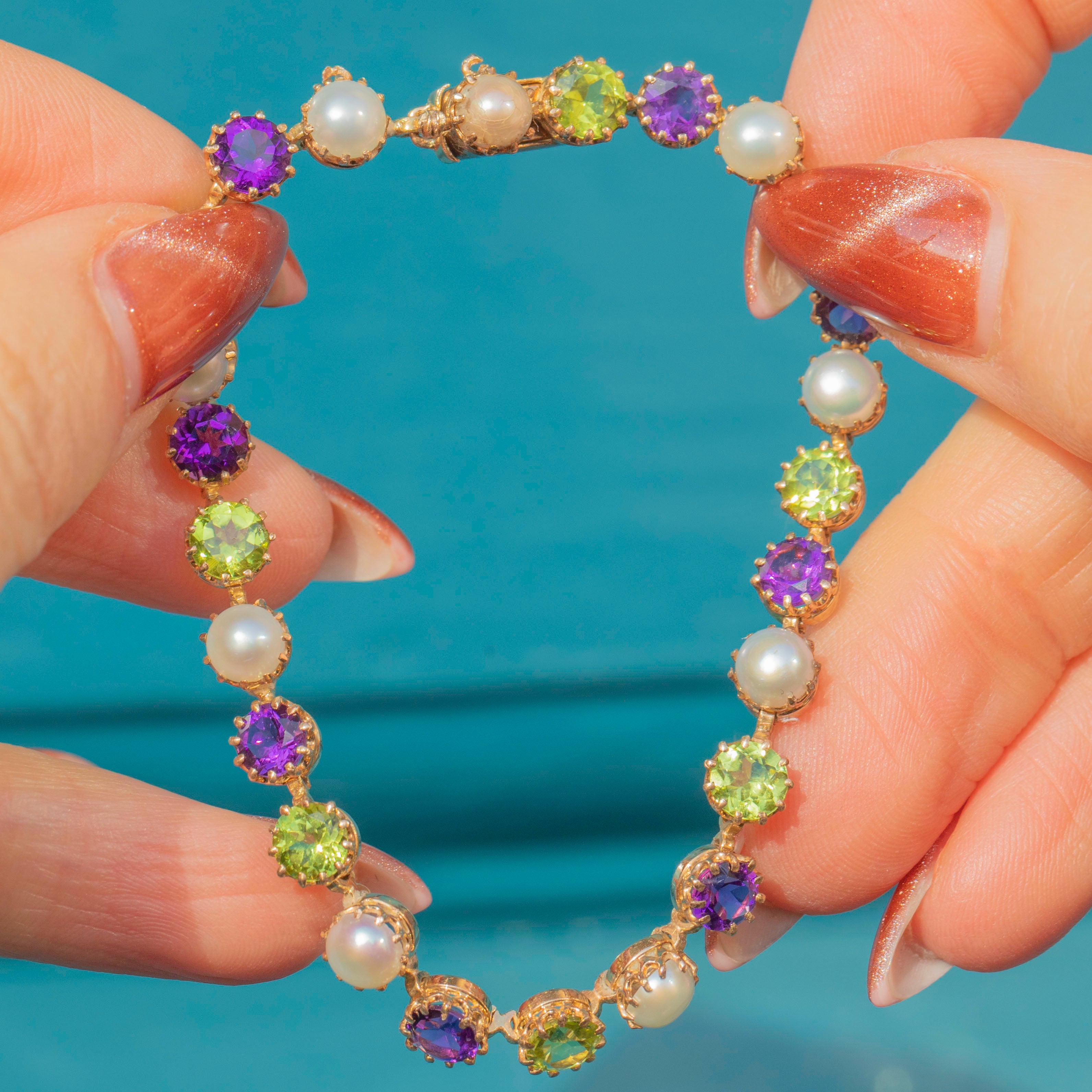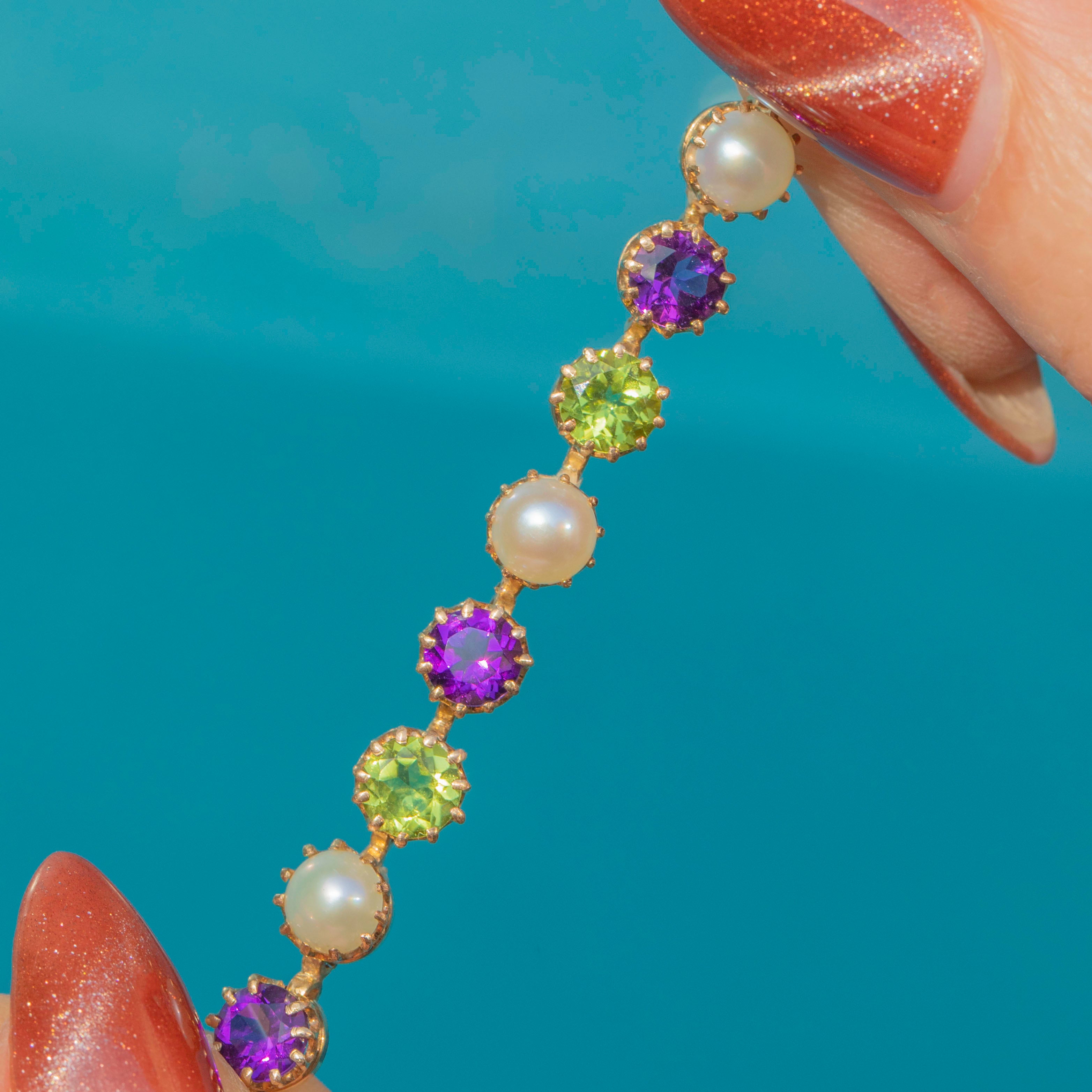 EXCELLENT: This antique 15ct Gold Amethyst Peridot Pearl suffragette bracelet is in excellent condition. Each of her gemstones is radiant, faceted wonderfully, and set securely within its settings. With a secure clasp and only very minor surface wear, she is a gorgeous piece!