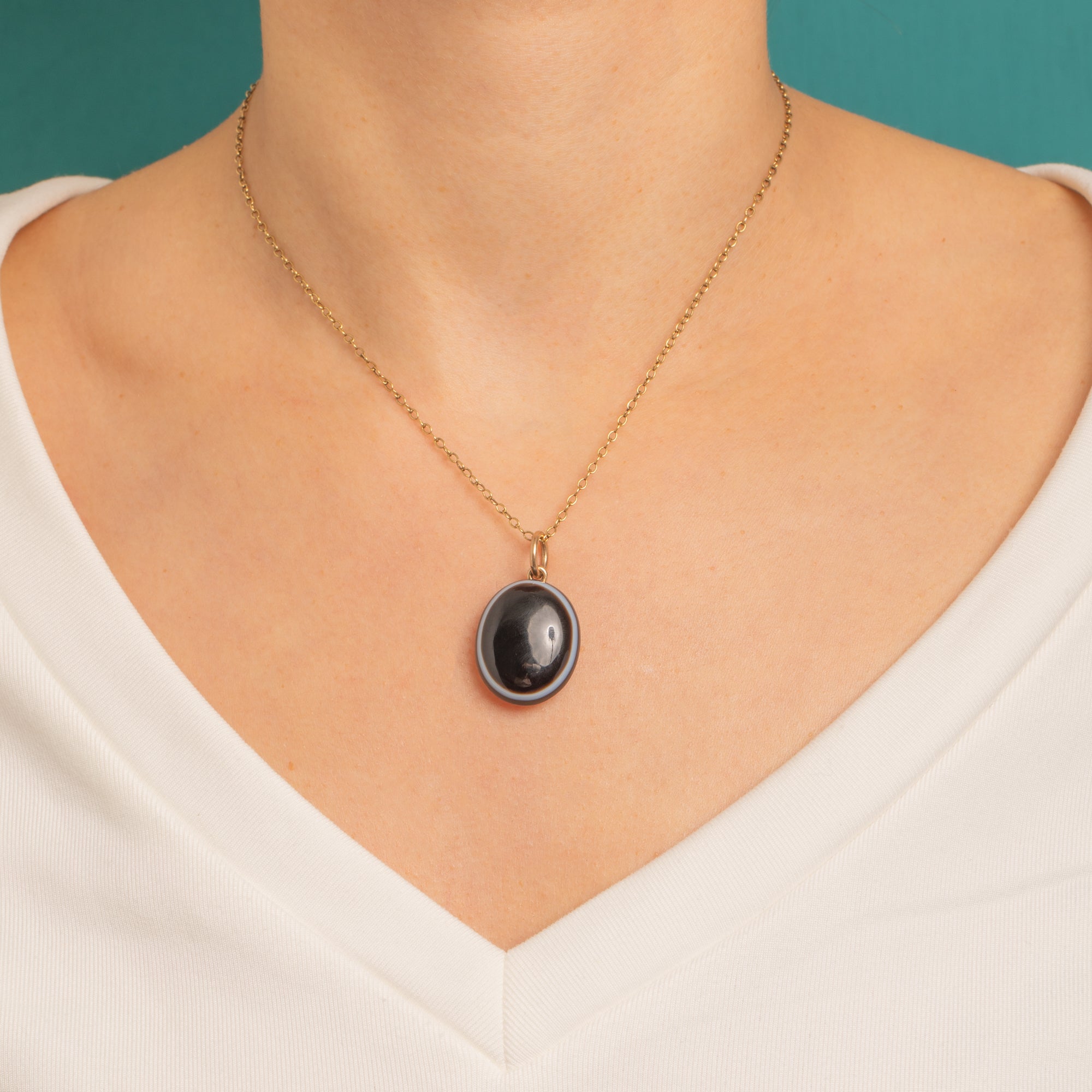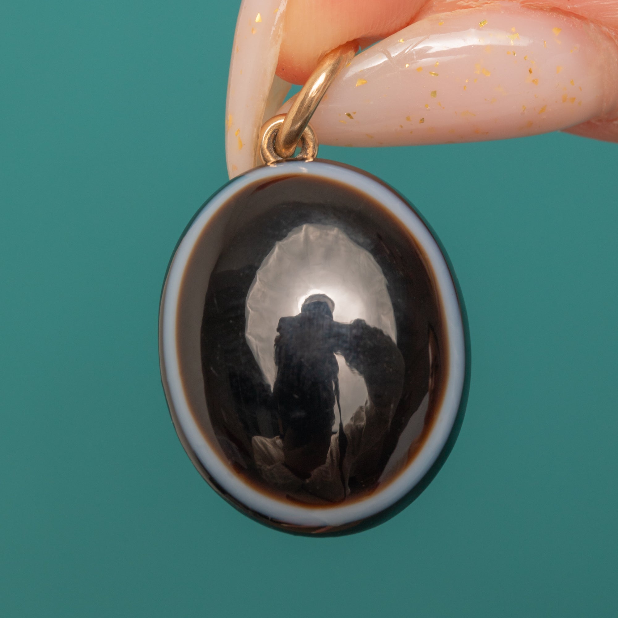 A beautifully classic Victorian locket back pendant, crafted in rich 15ct Gold and set with a striking Banded Agate, often known as Bull’s Eye Agate. The agate has a wonderfully glossy finish and those deep, natural bands that make this stone so endlessly collectible.