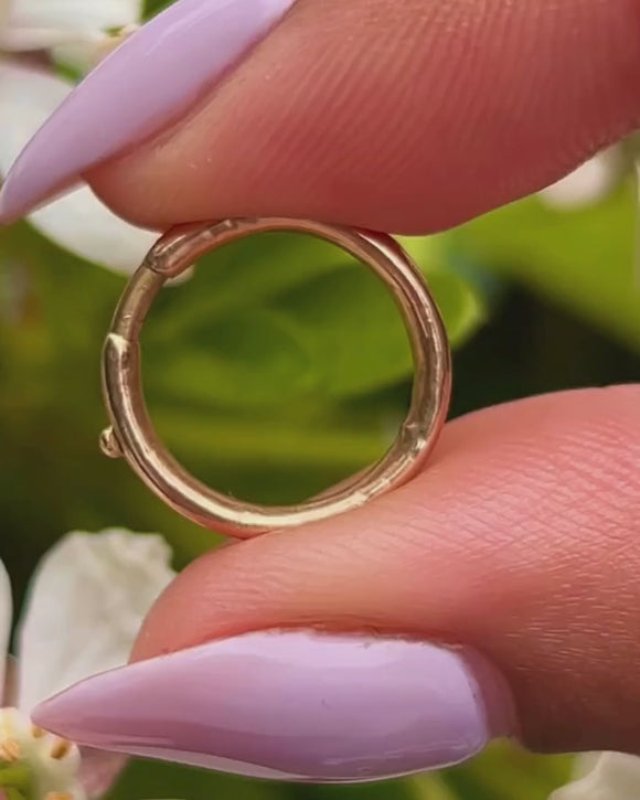 VERY GOOD TO EXCELLENT: This antique solid 15ct Gold bolt ring is offered in superb condition. The 9ct Gold is buttery with only some minor surface wear to note, commensurate with age, but this does not affect her integrity. The bolt ring can be opened with ease and shuts securely, promising another lifetime of love and wear!