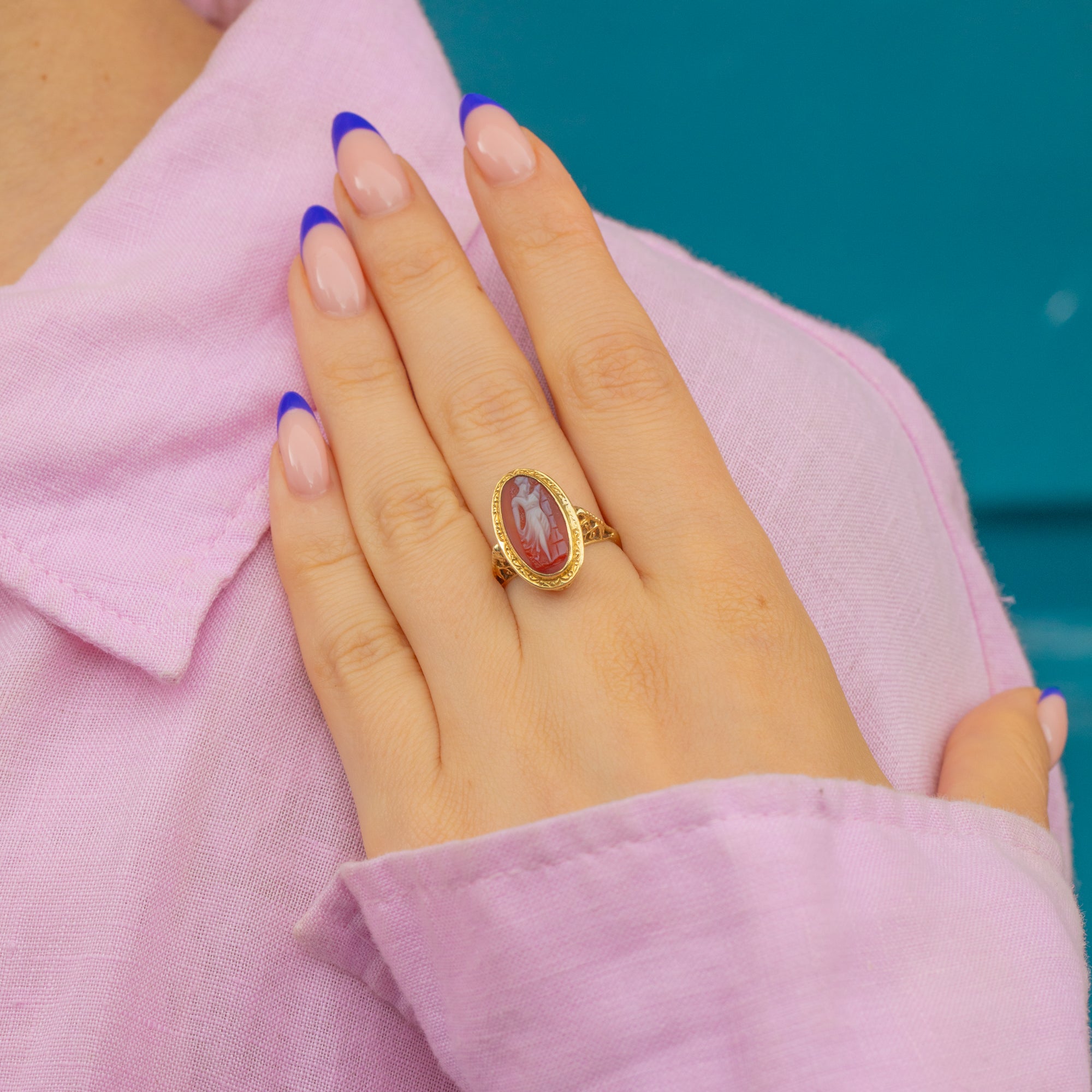 We adore the mystery behind the cameo, a whimsical lady's portrait flowing with grace... in fact, we think it may depict one of the three graces! What do you think?!