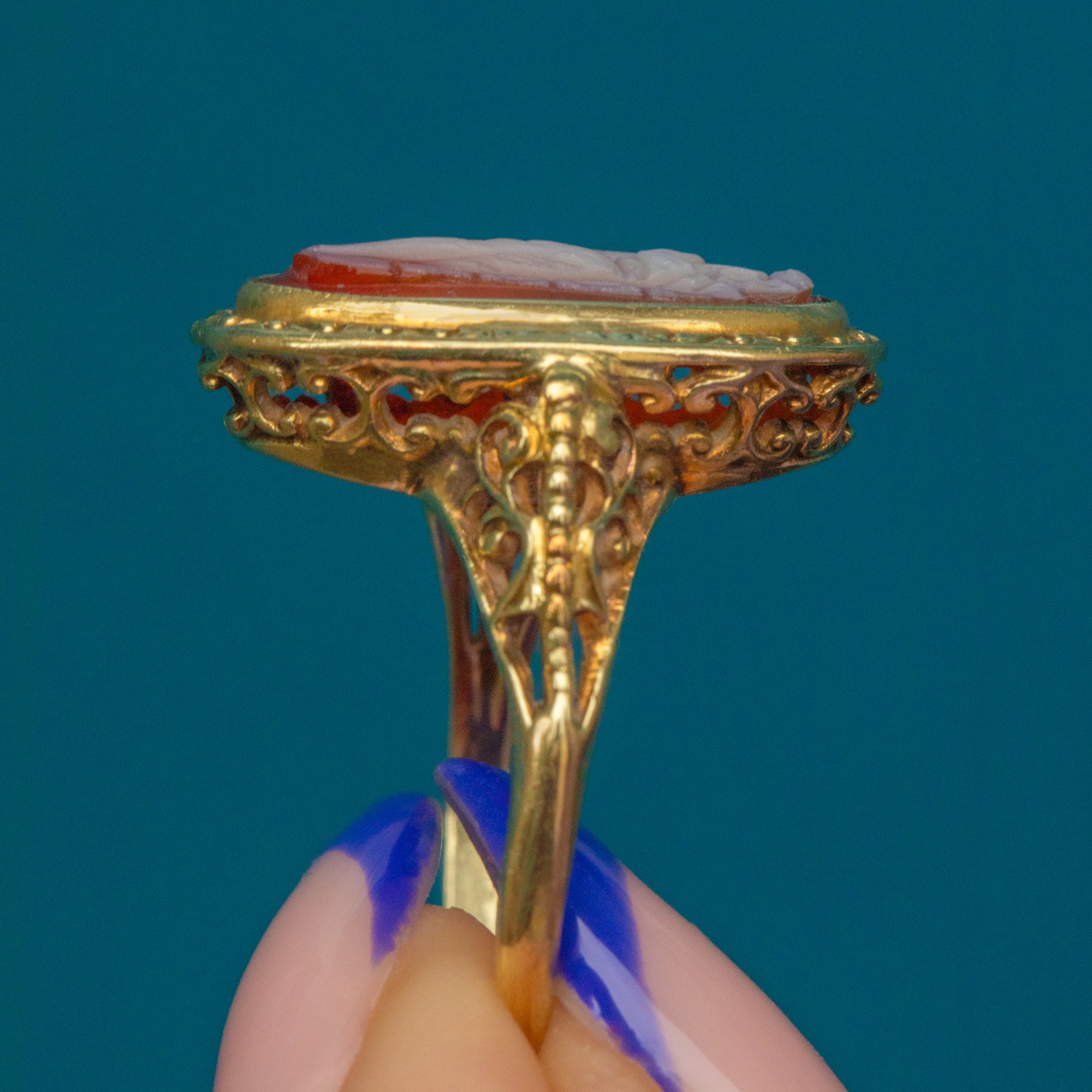 A gorgeous antique 15ct Gold cameo ring to adorn your fingers! This ring carries a wonderful presence, with a carved cameo shell set into a beautiful bright Gold open-work filigree setting.