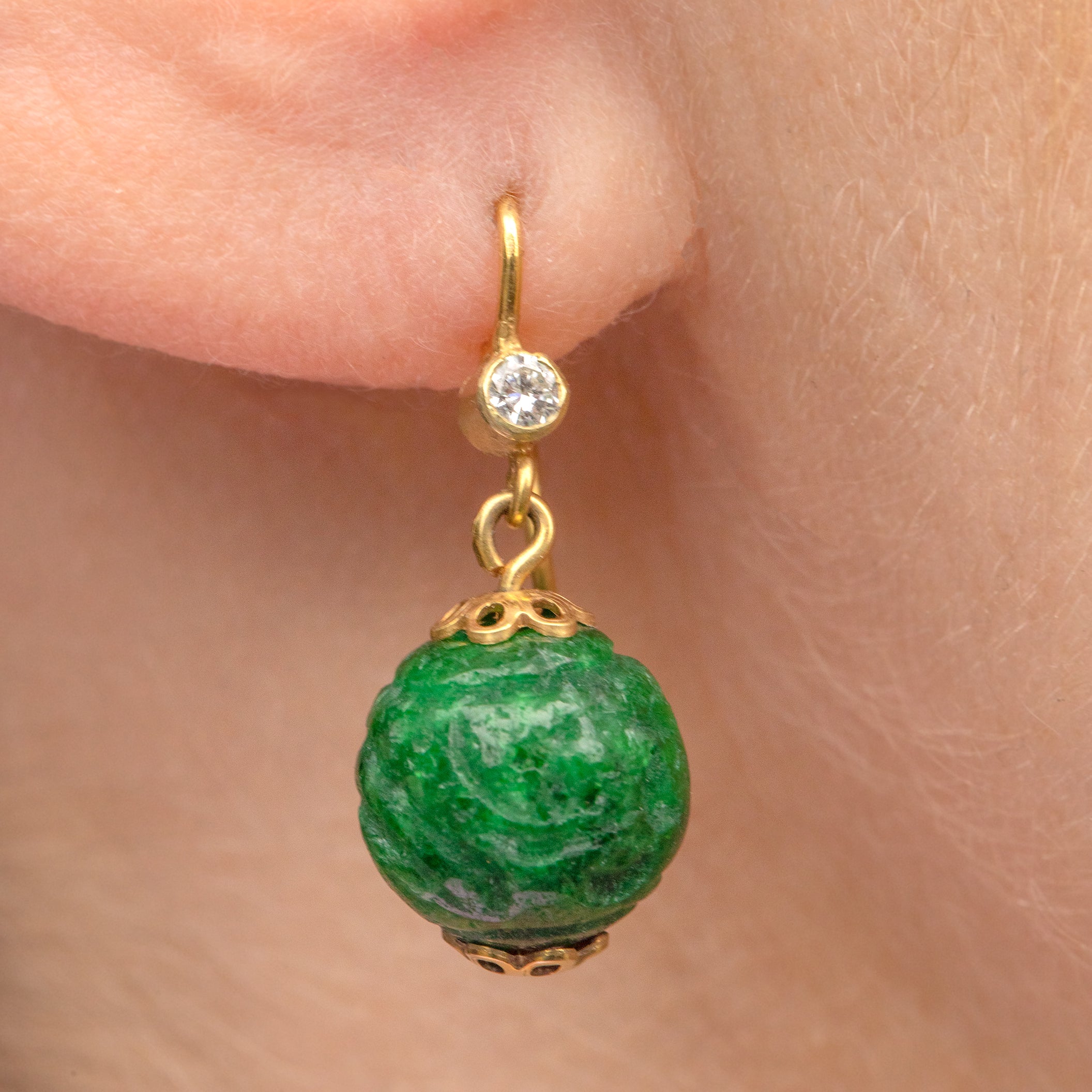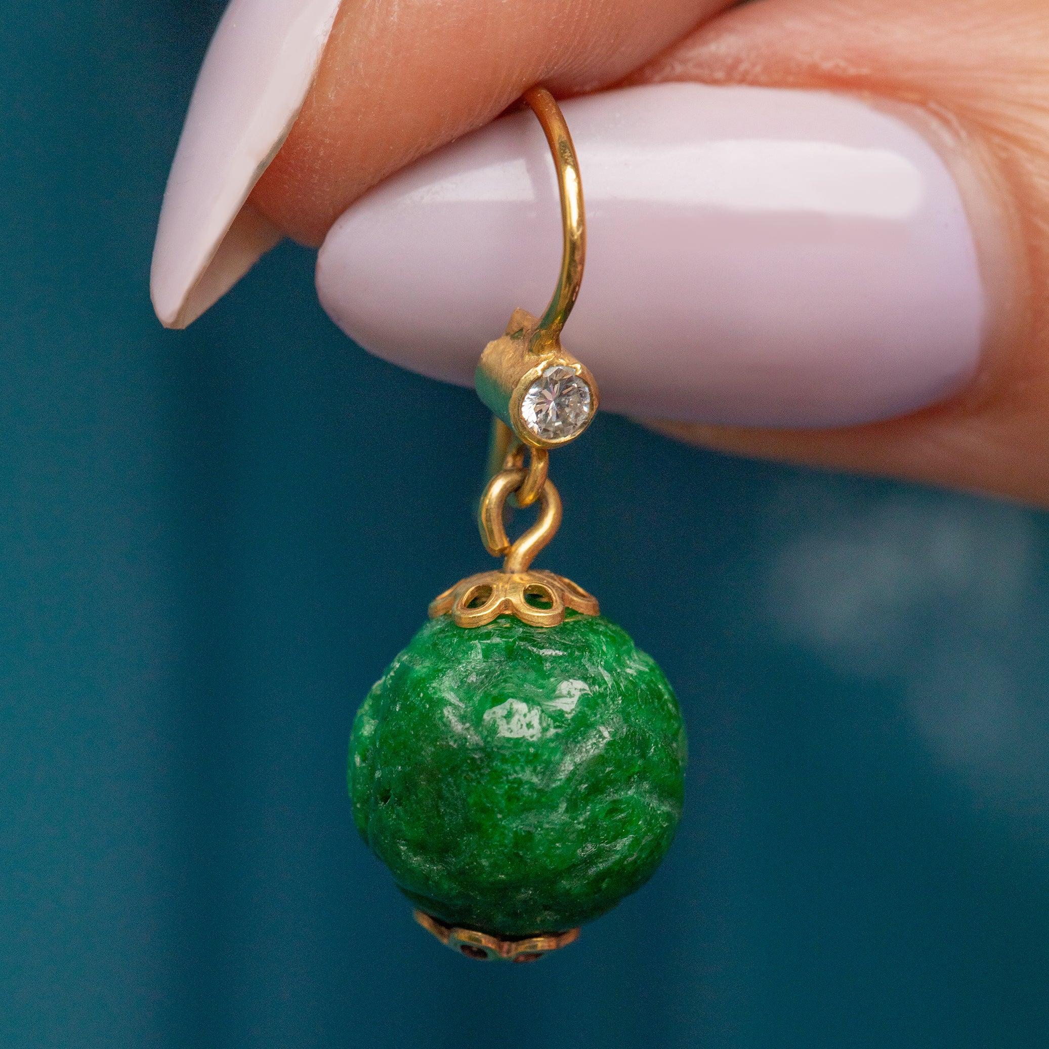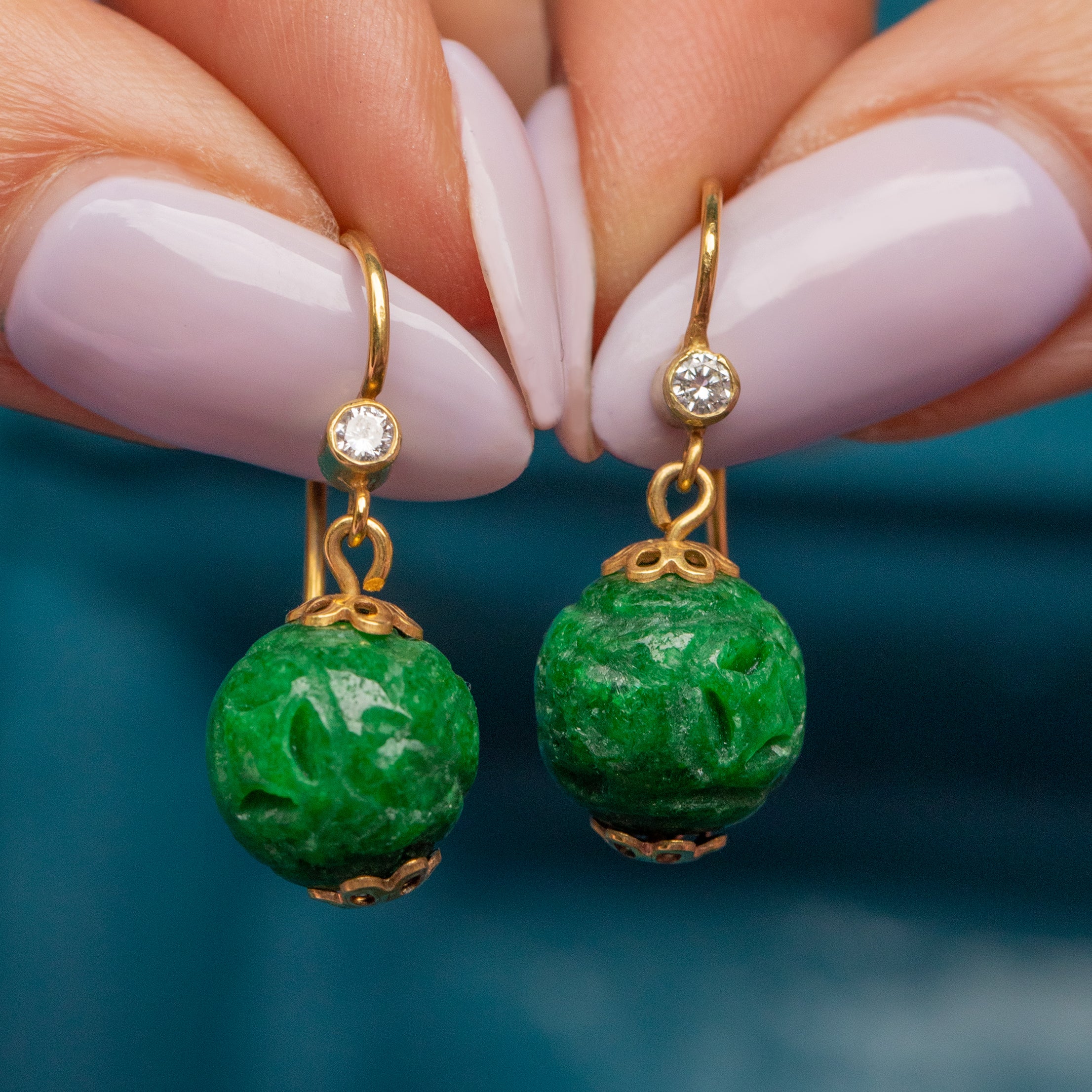 EXCELLENT. These antique 15ct Gold carved Jade & Diamond drop earrings are in excellent condition! The Jade spheres are immaculate with crisp carved details covering their entirety. The Diamonds are free from fleabites or abrasions and although the top of the setting on one of them is slightly worn, they are both secure within their bezels. With brightly saturated 15ct Gold and generously sized earring hooks, you can confidently wear these outstanding Art Deco earrings!