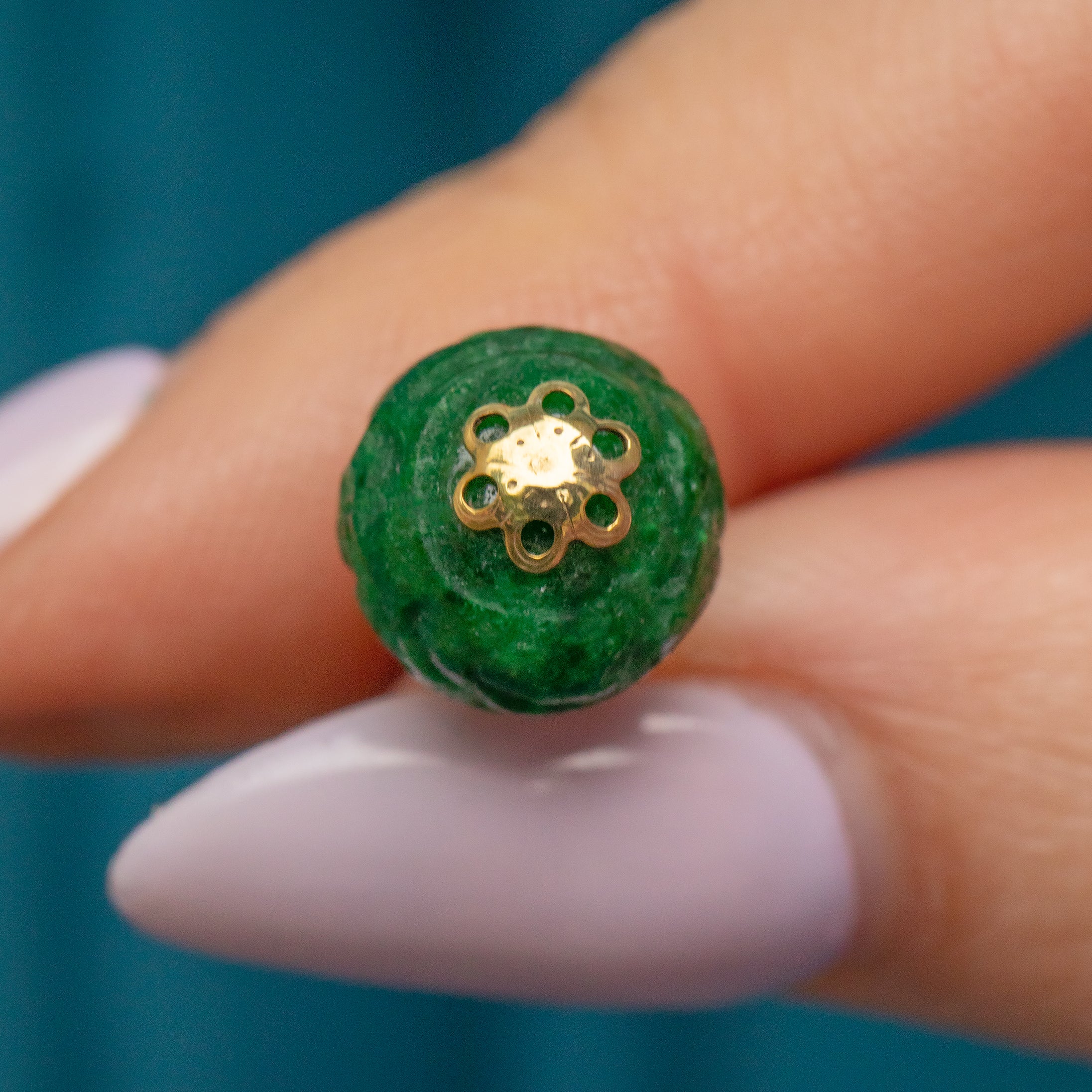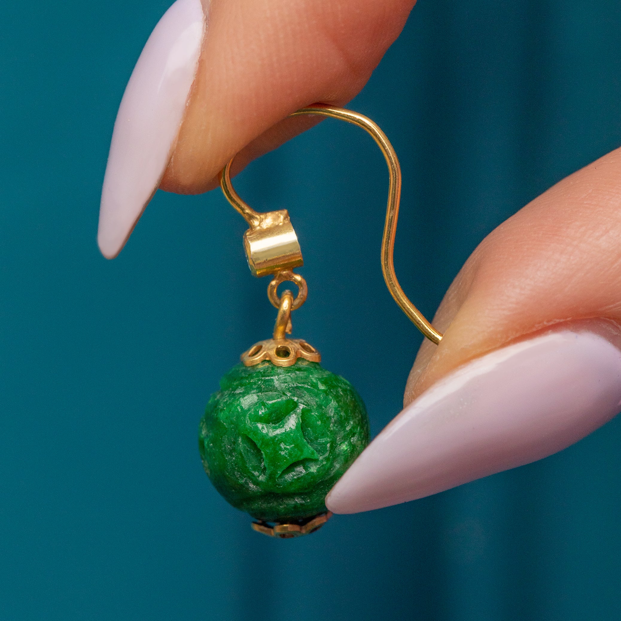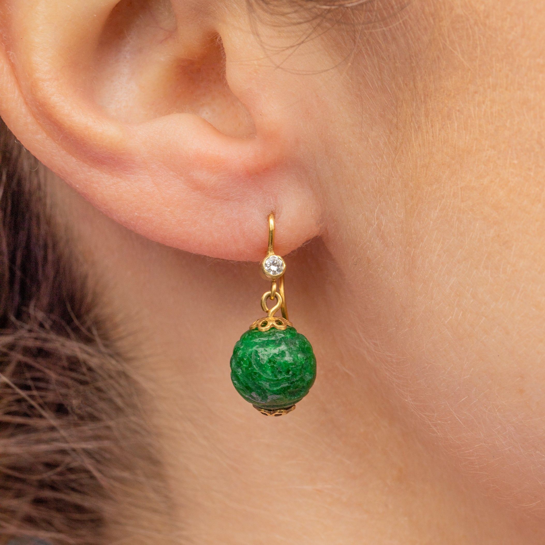 EXCELLENT. These antique 15ct Gold carved Jade & Diamond drop earrings are in excellent condition! The Jade spheres are immaculate with crisp carved details covering their entirety. The Diamonds are free from fleabites or abrasions and although the top of the setting on one of them is slightly worn, they are both secure within their bezels. With brightly saturated 15ct Gold and generously sized earring hooks, you can confidently wear these outstanding Art Deco earrings!