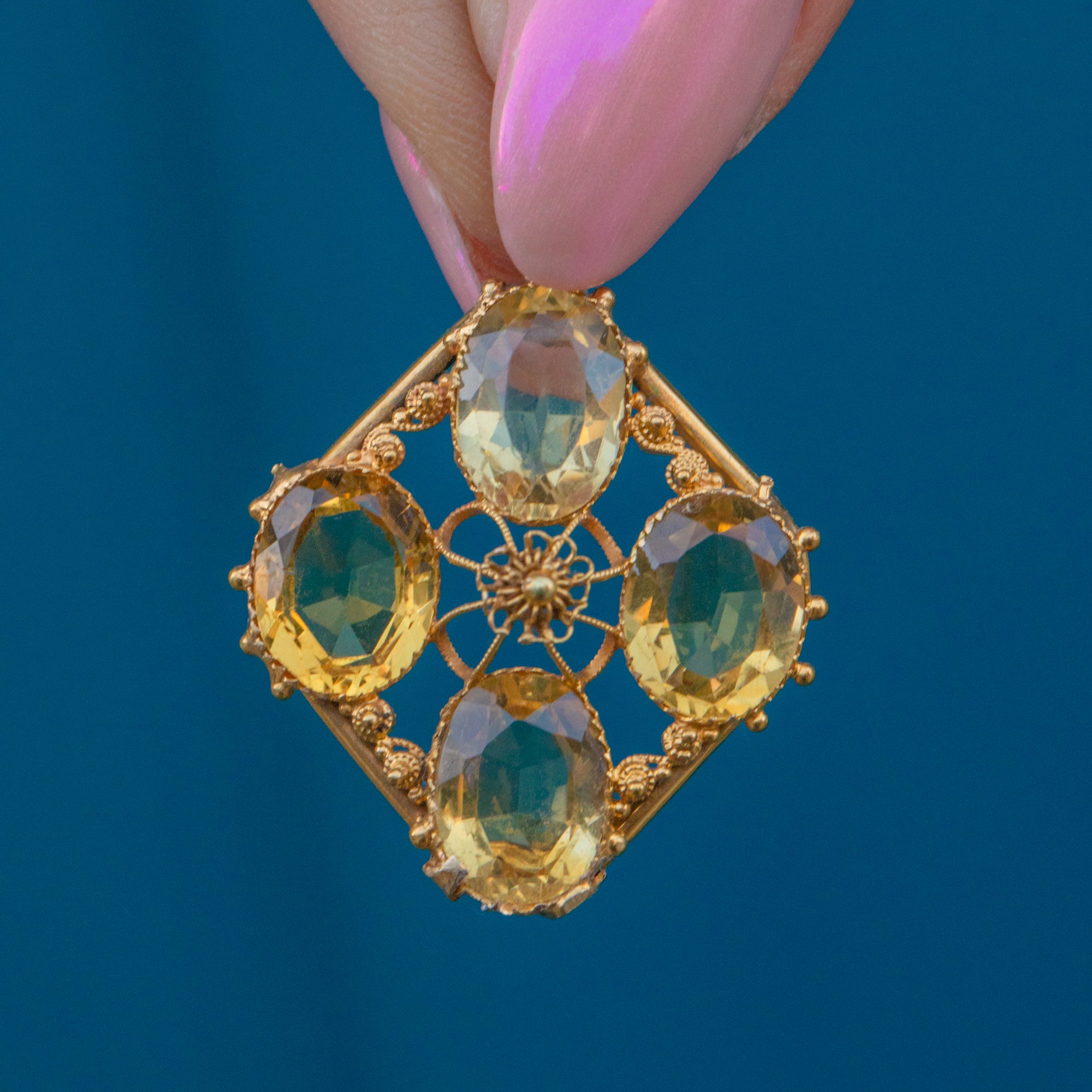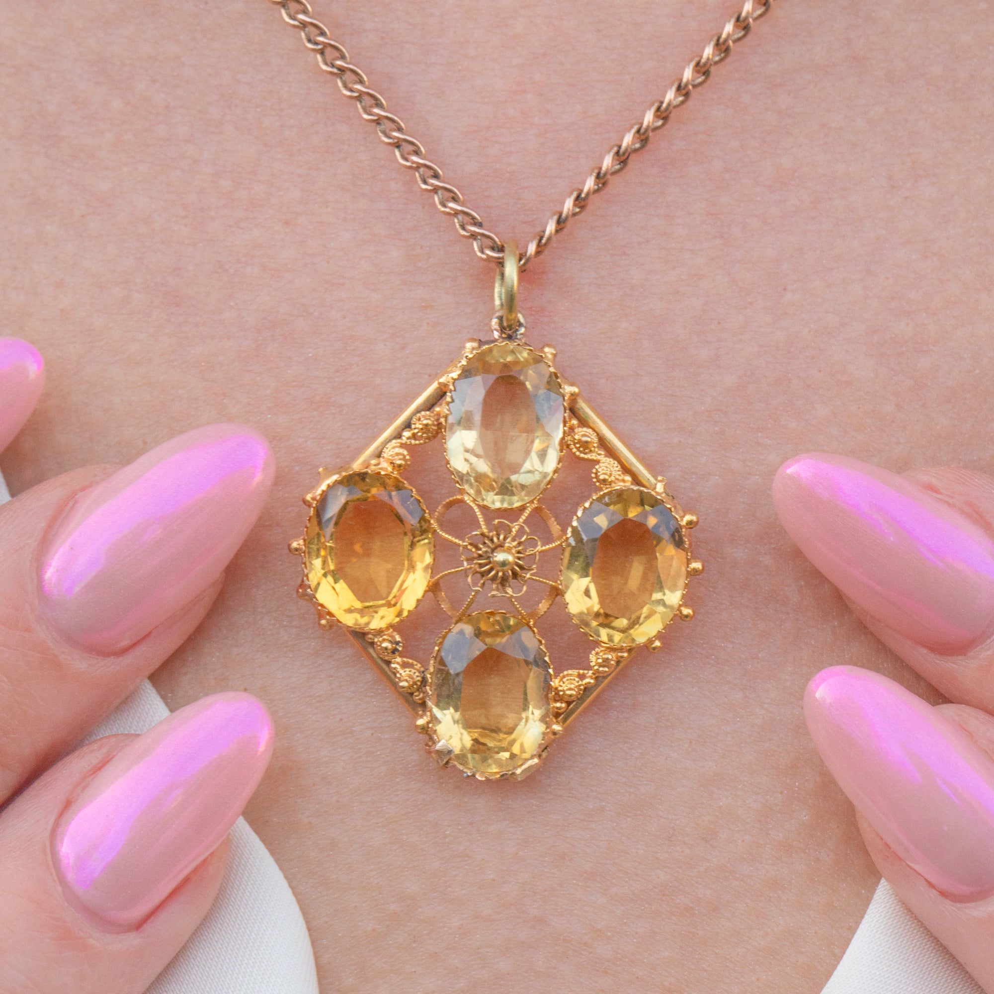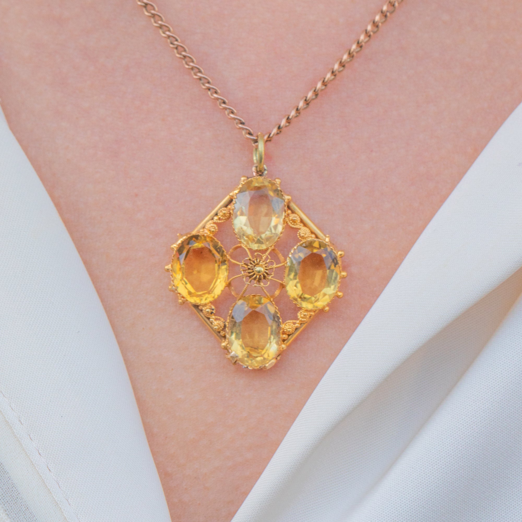 Fine Gold cannetille wirework swirls around the delectable gemstones, crafted from buttery 15ct Gold that perfectly complements the lemony Citrines to create a harmonious colour palette. Formed into a diamond shape with classically Victorian beaded details framing the corners, this early Victorian pendant is elegant and will make an impact!