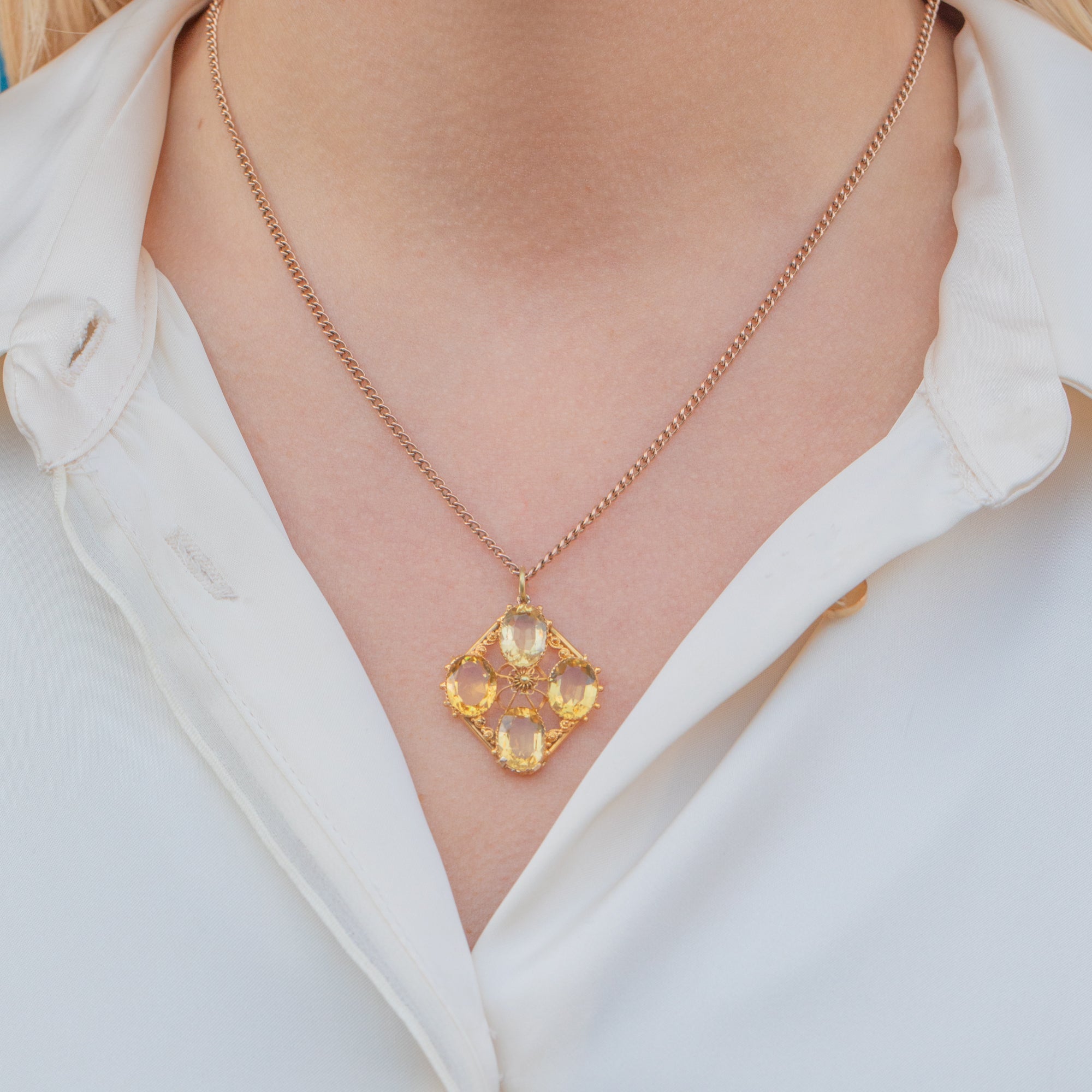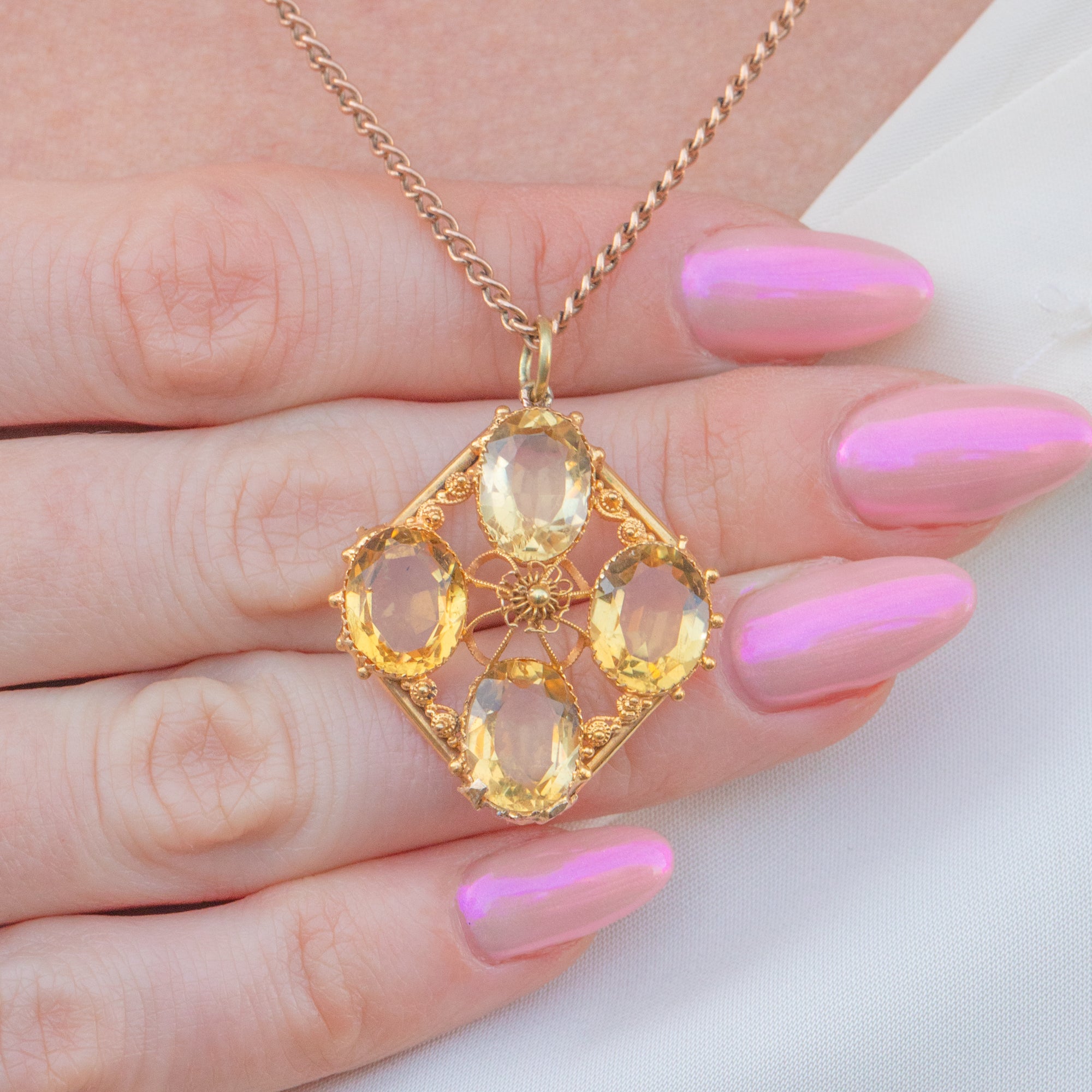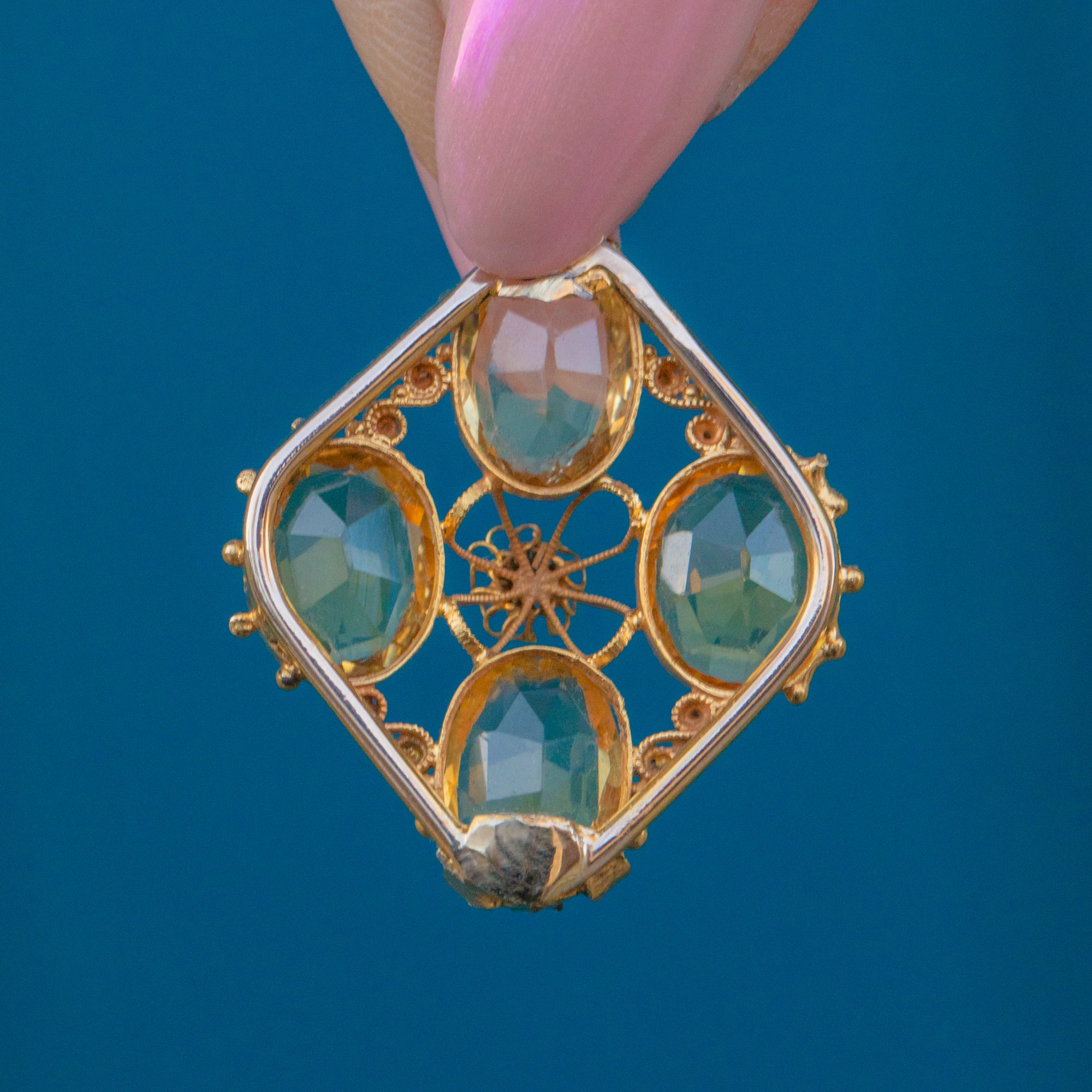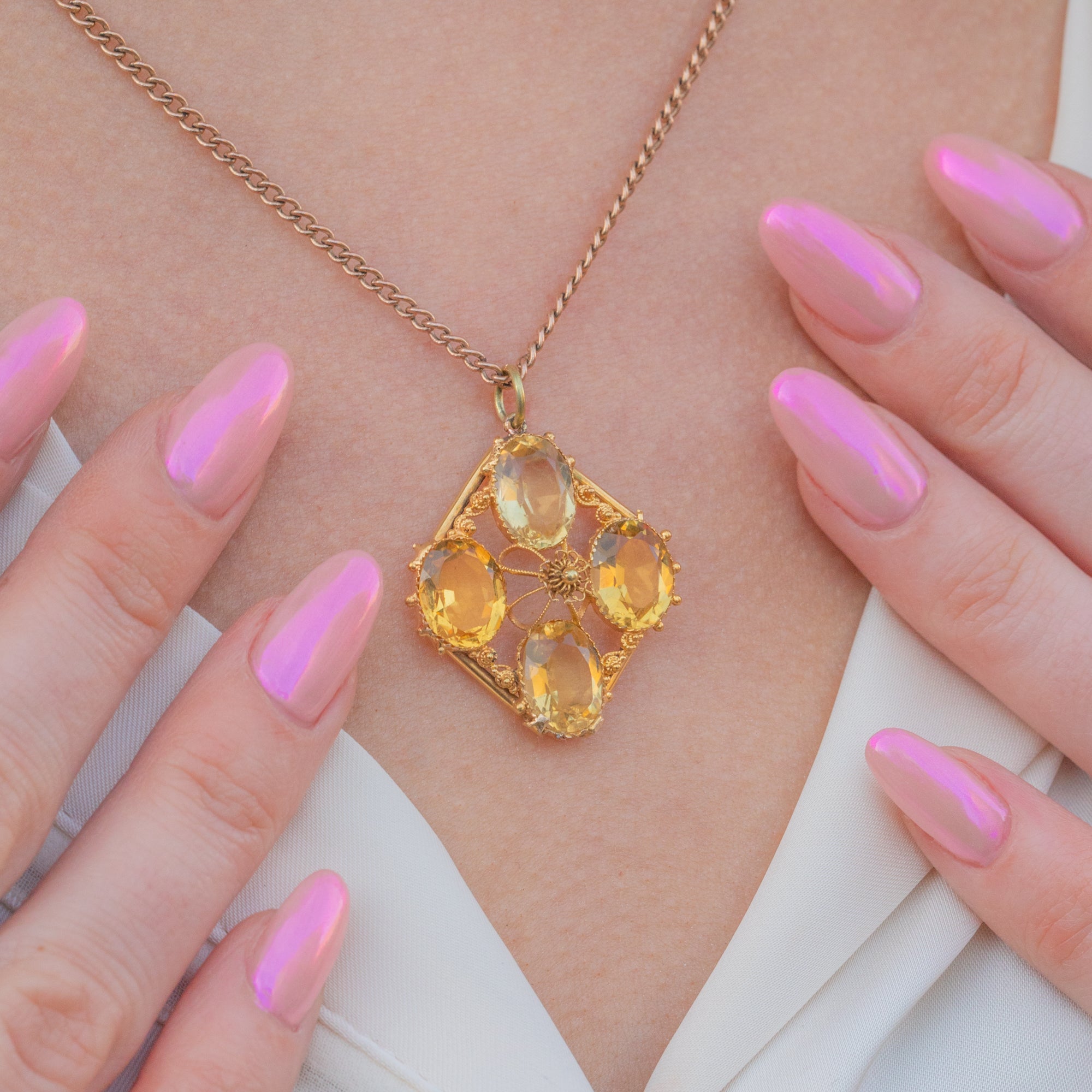 Fine Gold cannetille wirework swirls around the delectable gemstones, crafted from buttery 15ct Gold that perfectly complements the lemony Citrines to create a harmonious colour palette. Formed into a diamond shape with classically Victorian beaded details framing the corners, this early Victorian pendant is elegant and will make an impact!