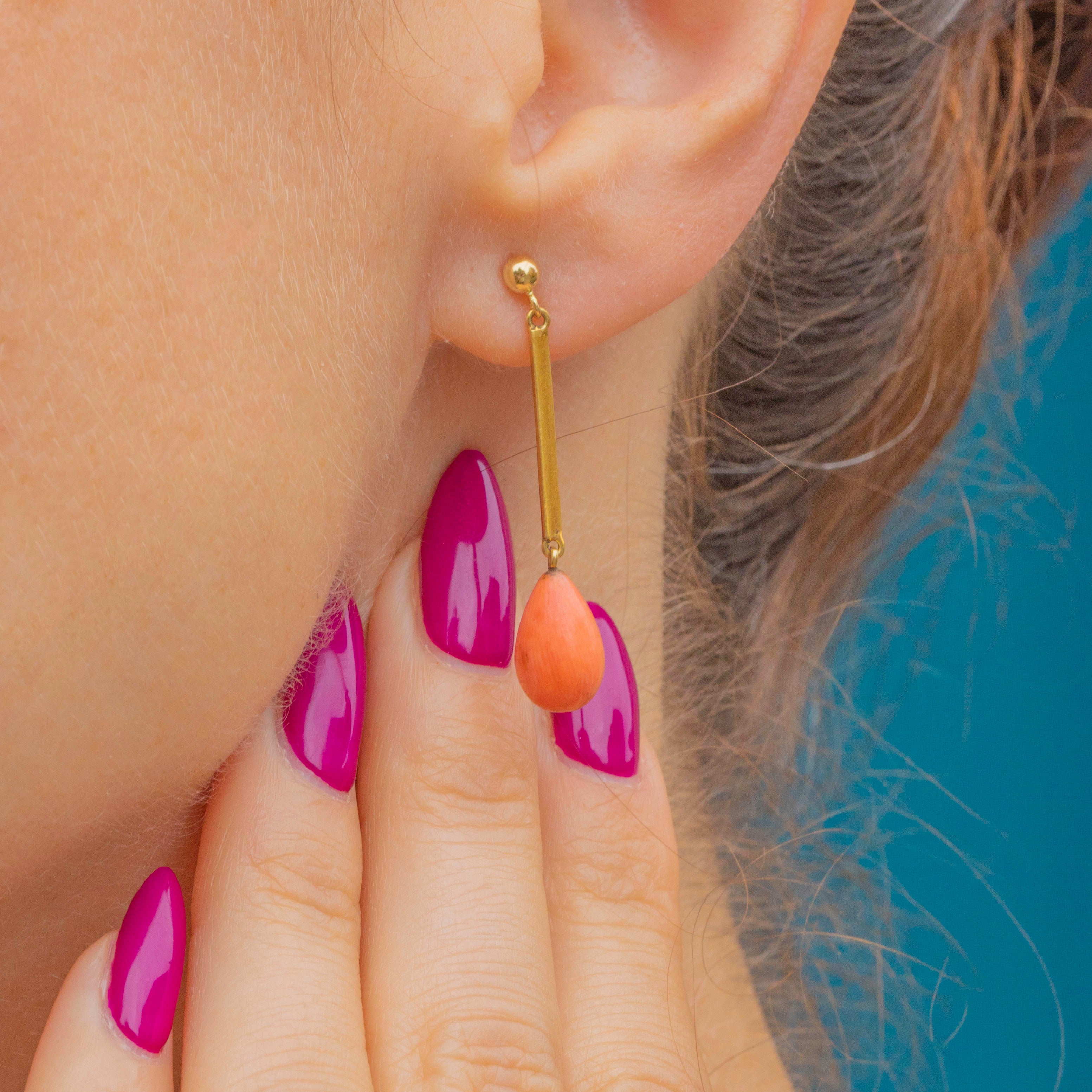 The natural Coral drops have a lovely sunset orange hue, perfectly complemented by the glossy 15ct Gold settings and dance with movement as they suspend from your lobes.