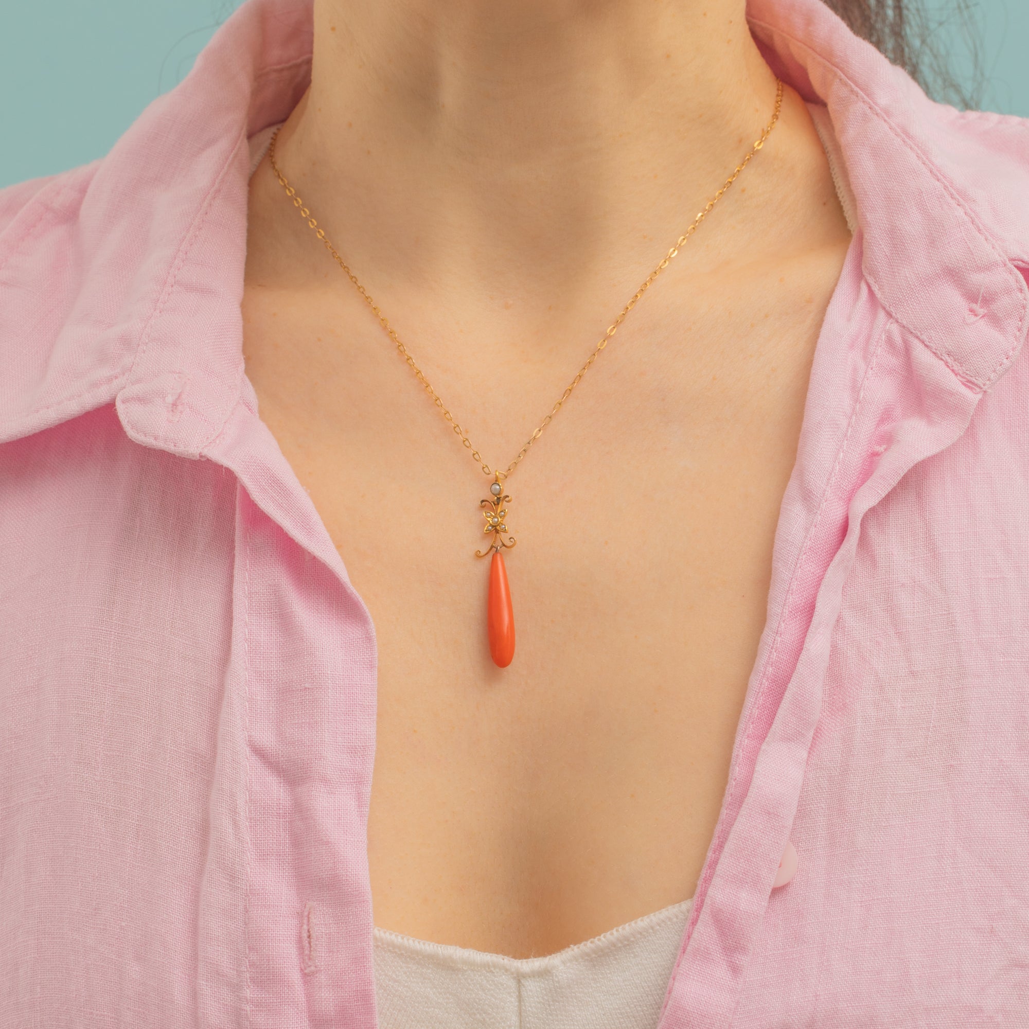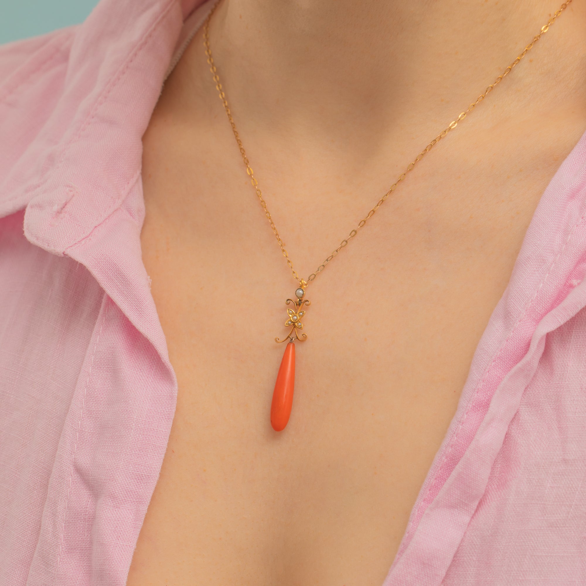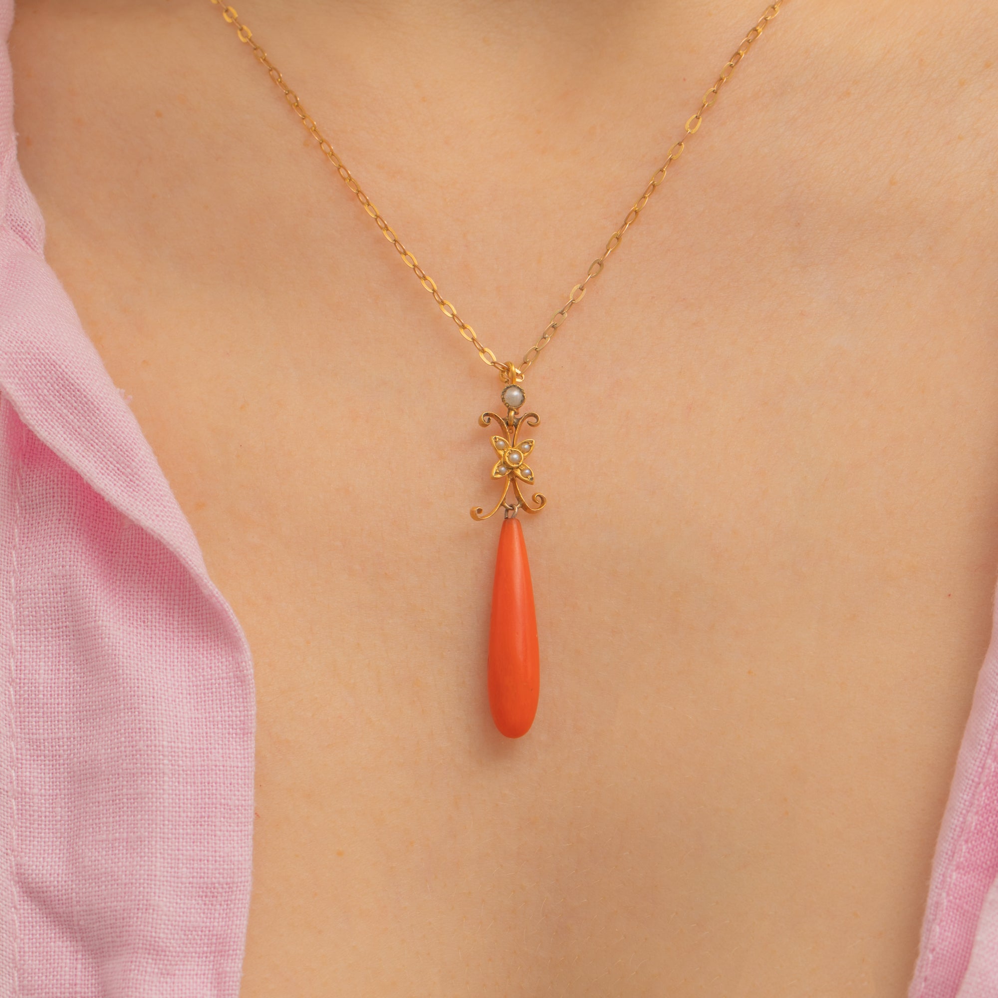Antique 15ct Gold Coral Pearl Drop Pendant with 18" Chain