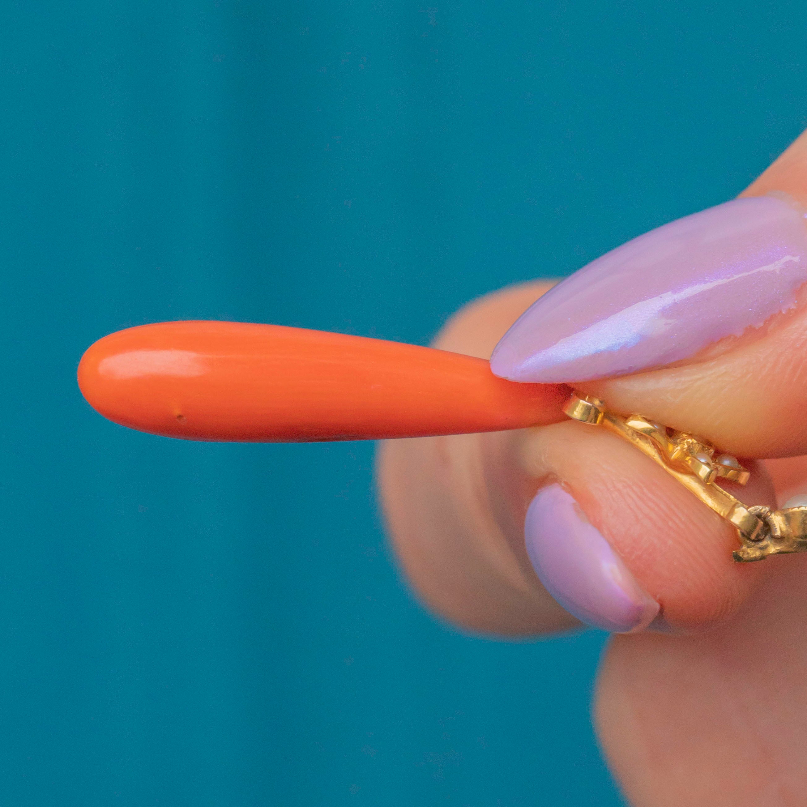 This stunning antique 15ct Gold Coral Pearl drop pendant showcases natural treasures of the sea! The richly hued orange Coral drop elegantly suspends from an ornate arrangement of lustrous Seed Pearls. Crafted in 15ct Gold, her warm tones enhance the natural beauty of the Coral, while the Pearls add a soft, refined contrast.