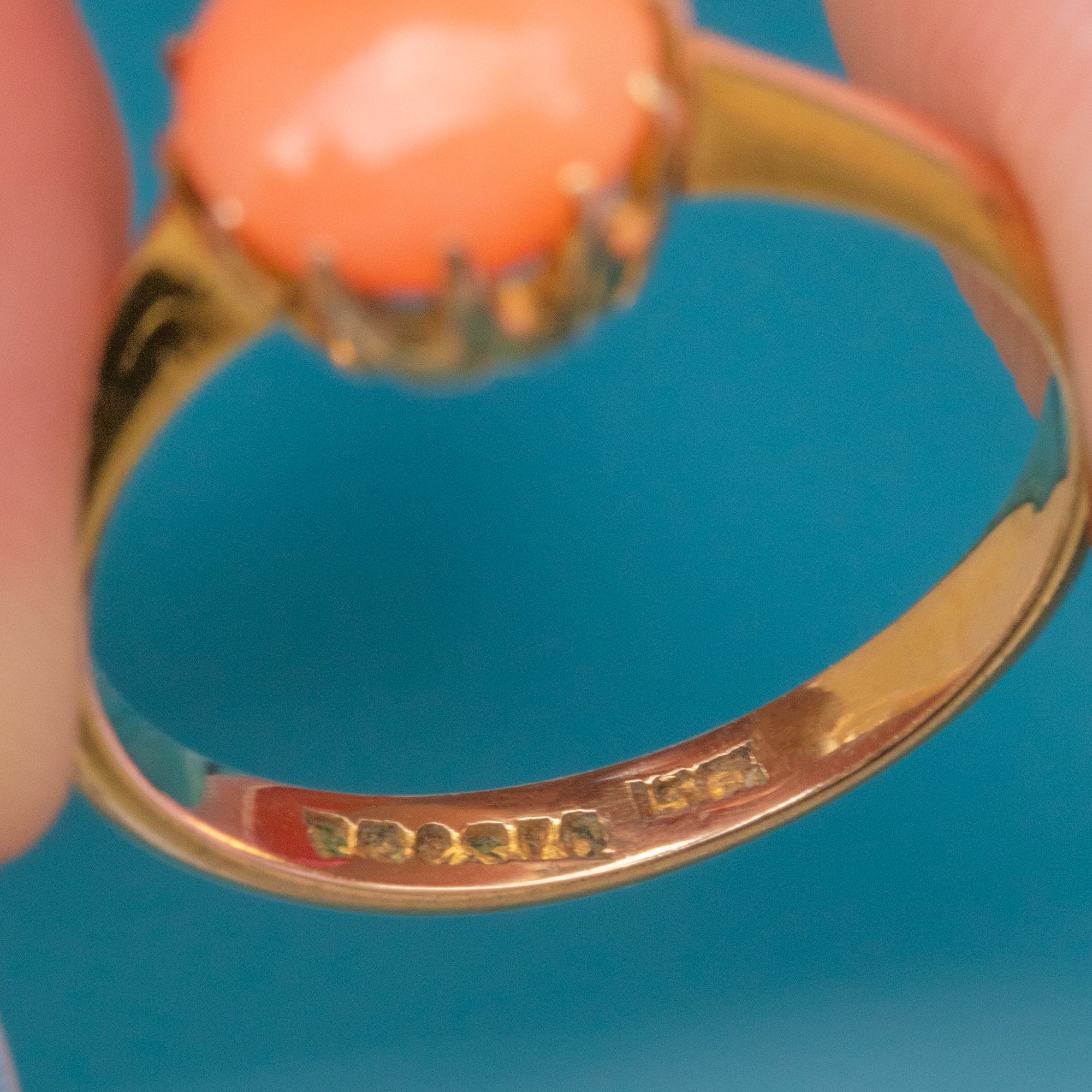 VERY GOOD-EXCELLENT: The Coral is bright and vibrant with a smooth, glossy surface. There is a small hole at the base of the Coral, though this cannot be seen while the ring is worn. With the buttery 15ct Gold band providing a comfortable wear, this Victorian solitaire ring is a must have!