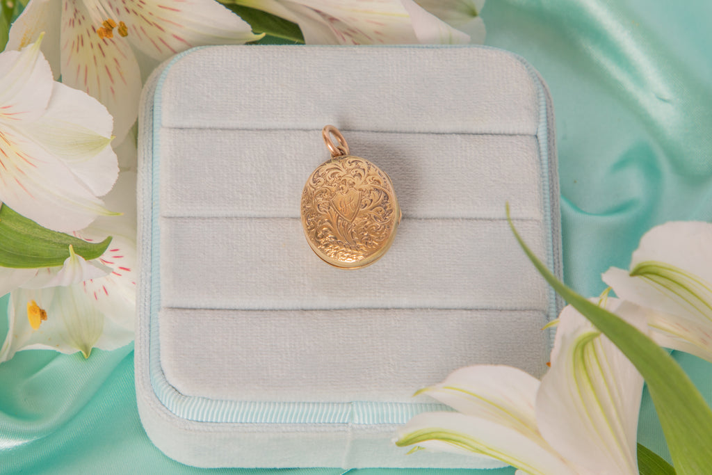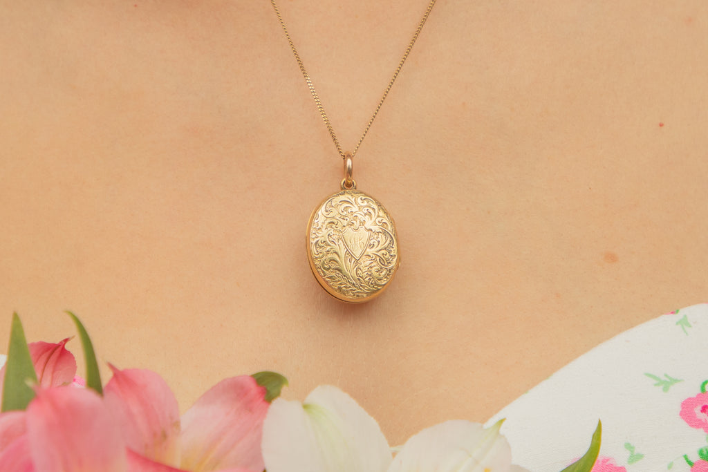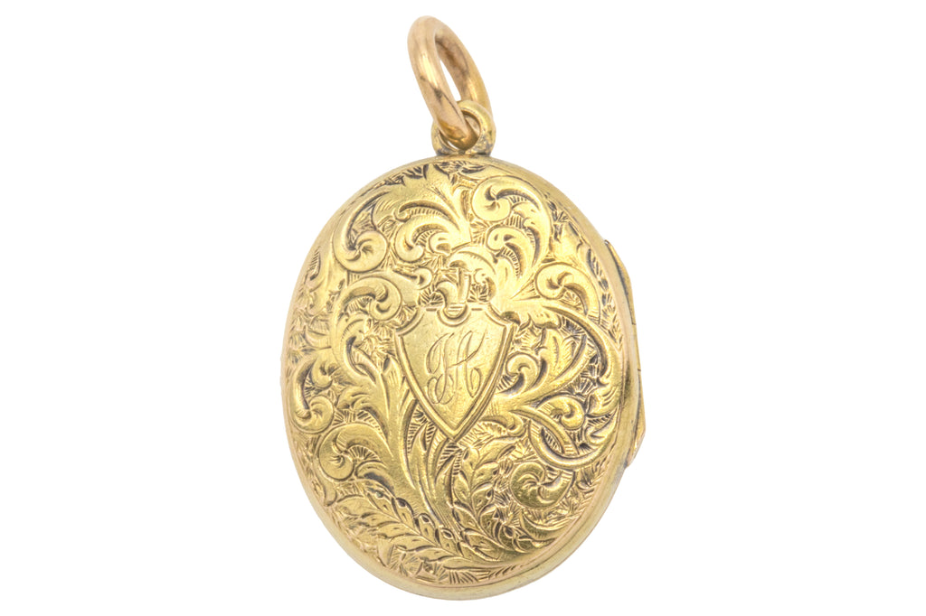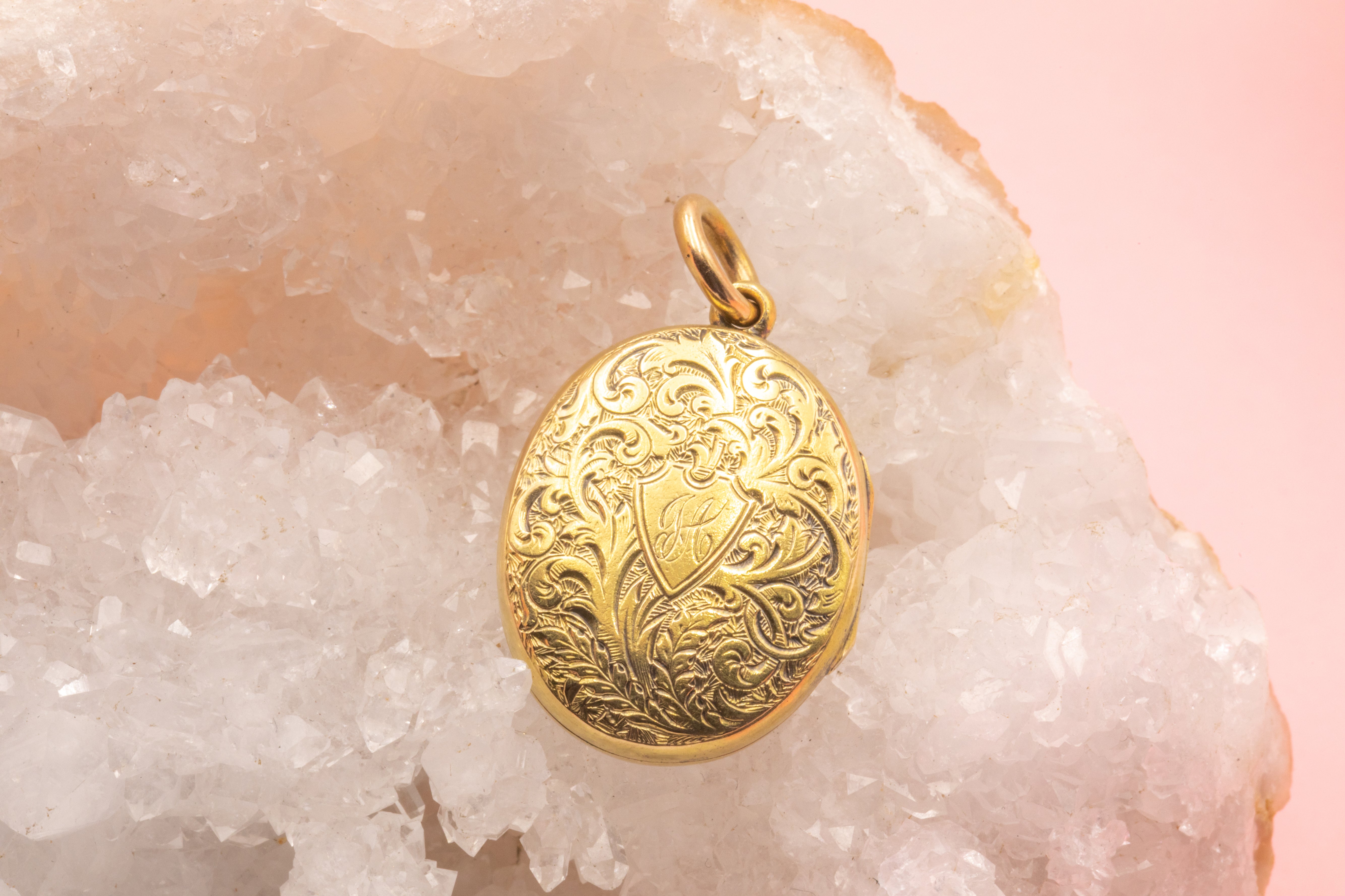 This antique 15ct Gold engraved buckle locket is bursting with character. Classically Victorian, a chunky buckle detail adorns her front with intricate swirl engravings and an initialed shield cartouche on her back.