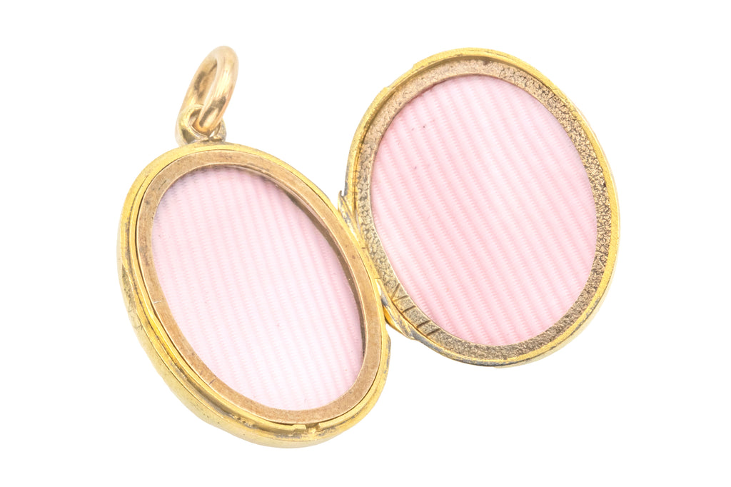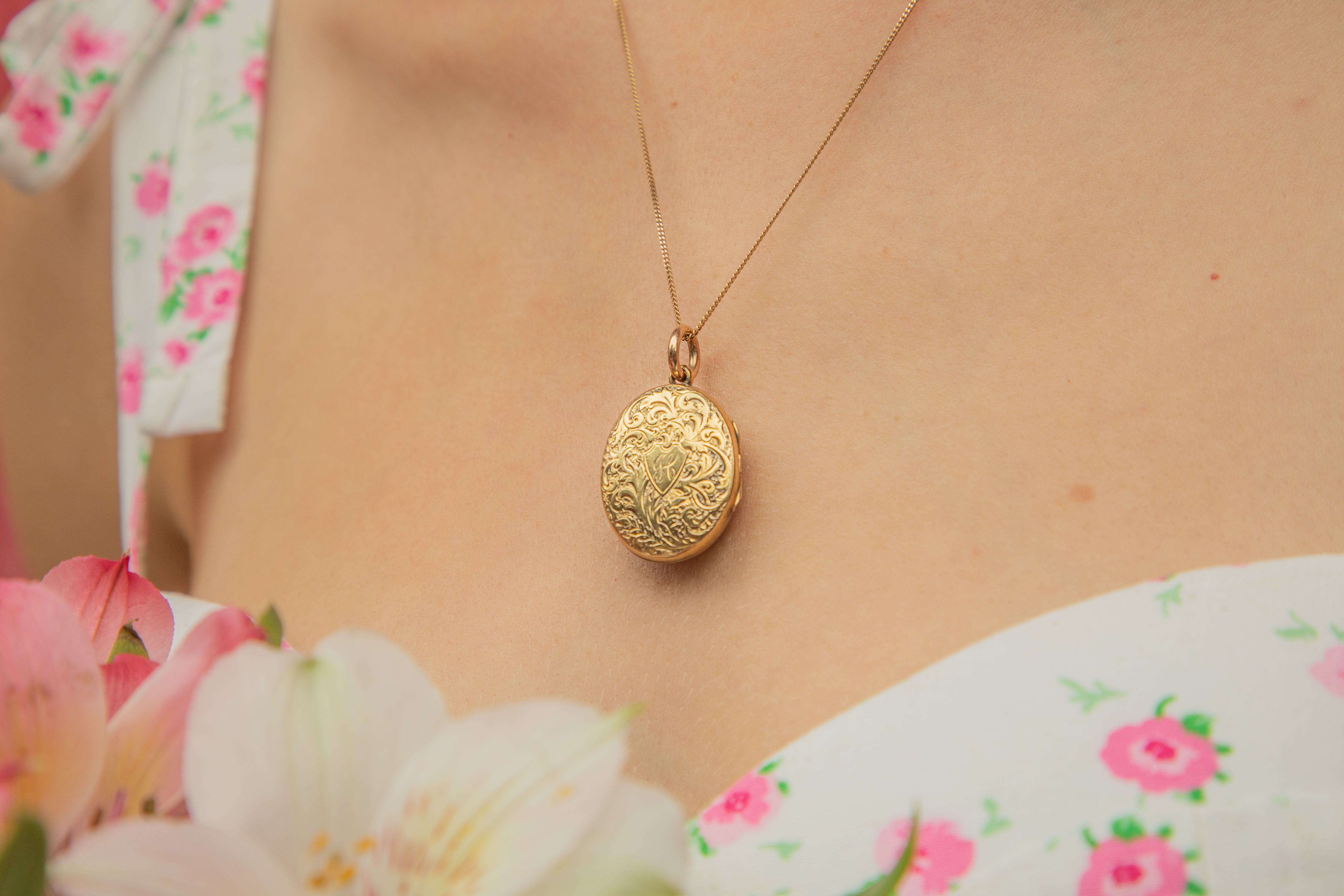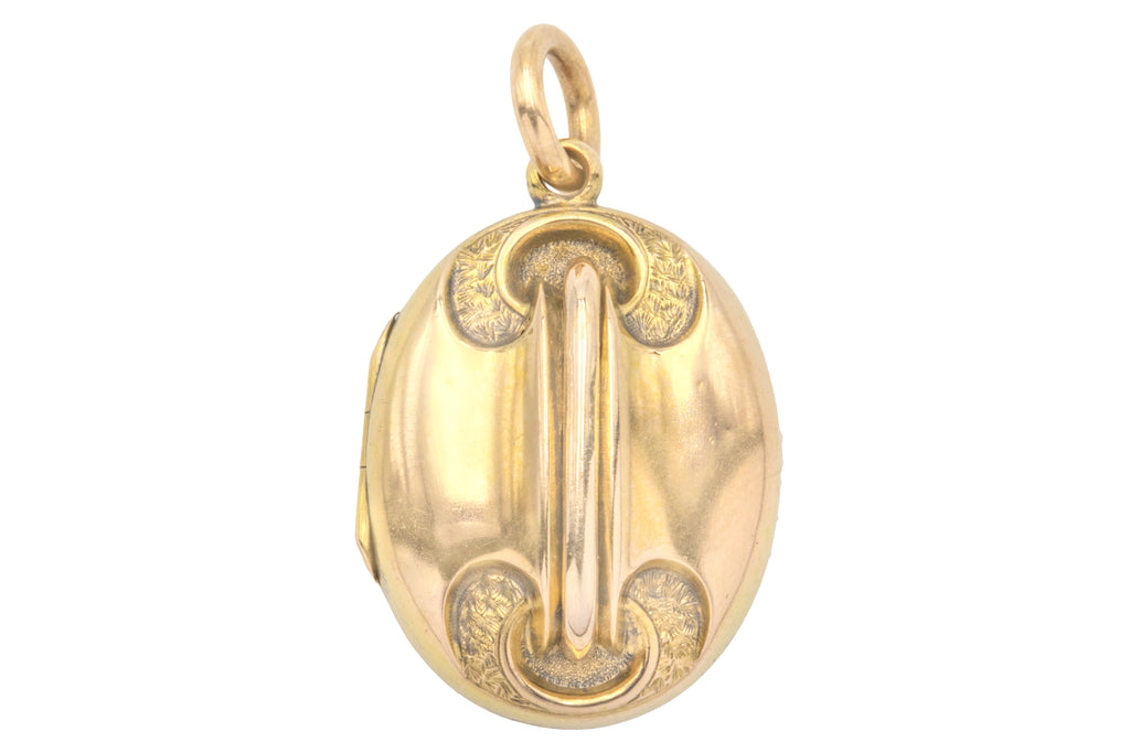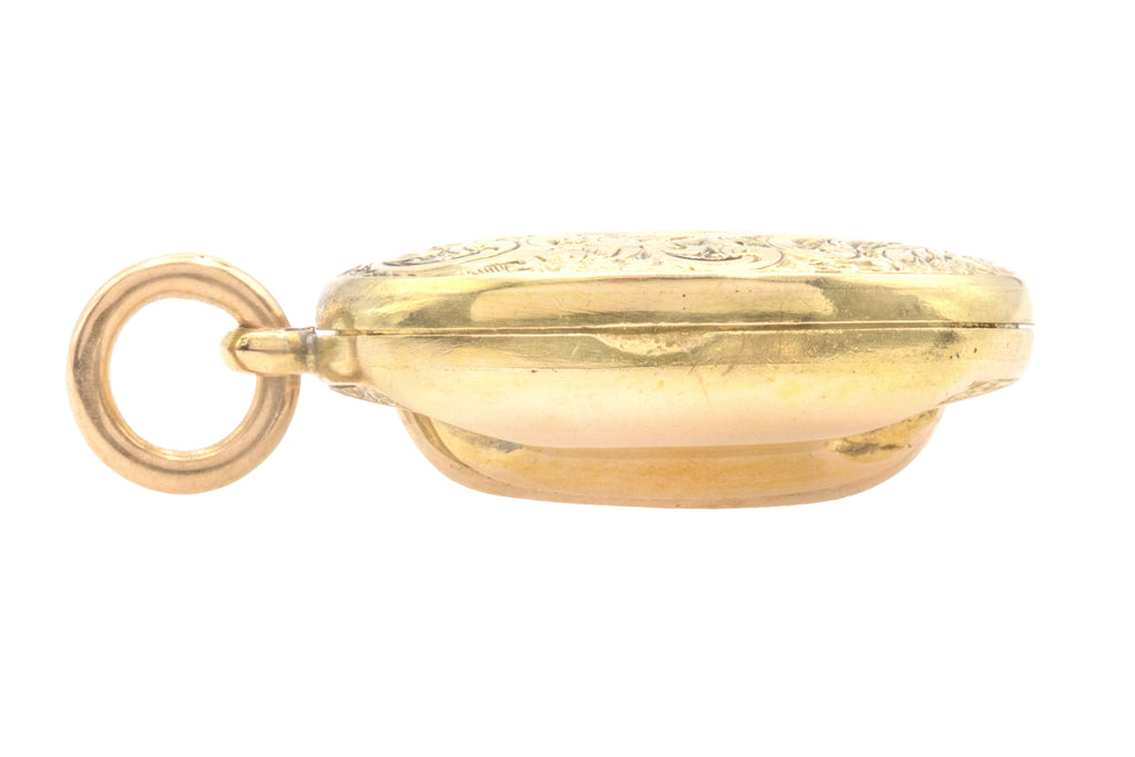 This antique 15ct Gold engraved buckle locket is bursting with character. Classically Victorian, a chunky buckle detail adorns her front with intricate swirl engravings and an initialed shield cartouche on her back.