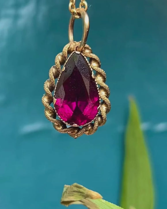 Add a touch of antique luxury to your outfit with the spectacular Georgian 15ct Gold flat-cut Garnet pear-shaped pendant! A mesmerising 3.40ct Garnet takes centre stage, flaunting a seductive crimson hue that dances across her facets as she catches the light.