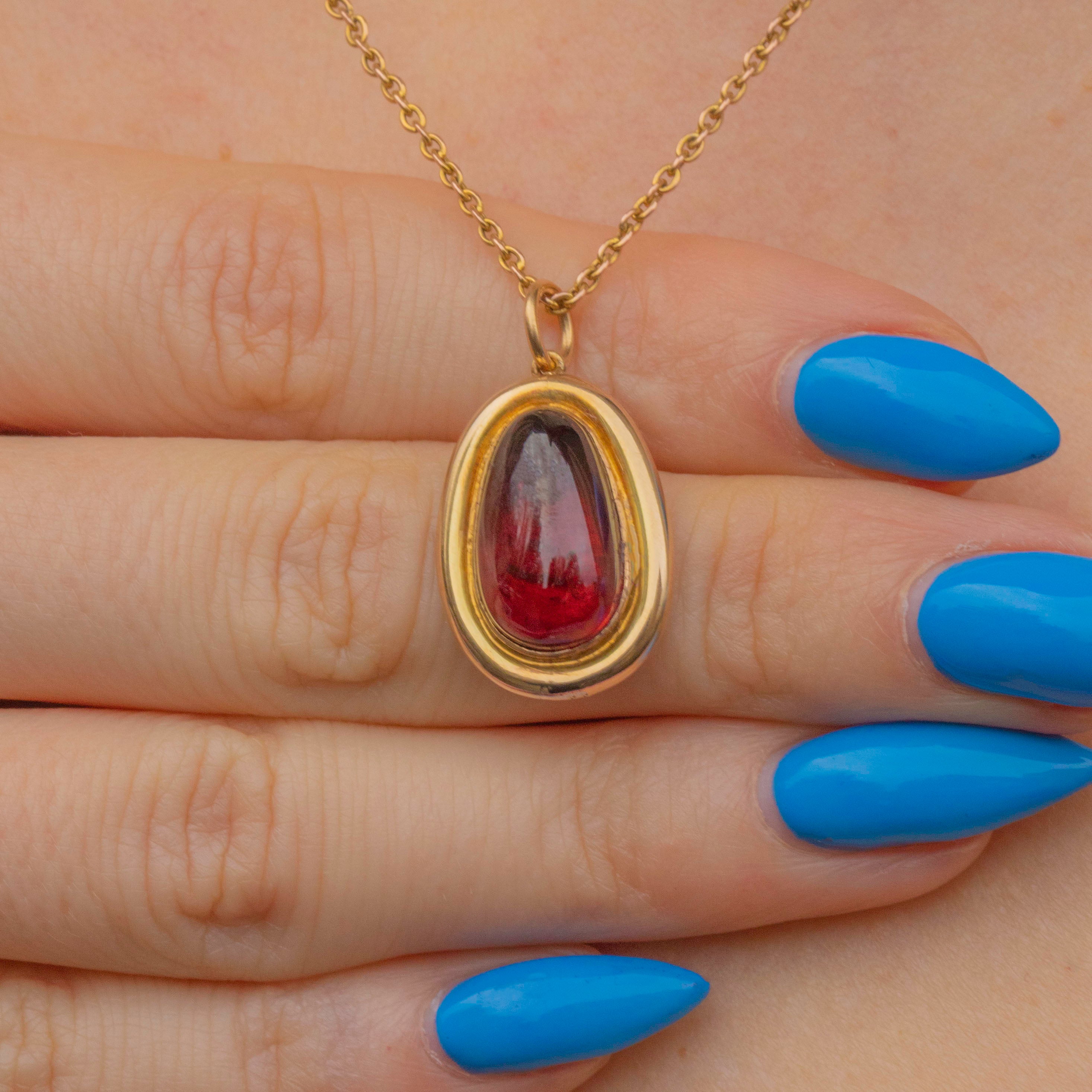 Her 3.62ct Garnet is wrapped up in sumptuous 15ct Gold, revealing hints of scarlet as she catches the light. Suspended from a fine chain, this Garnet cabochon pendant is the perfect piece as we head into autumn.