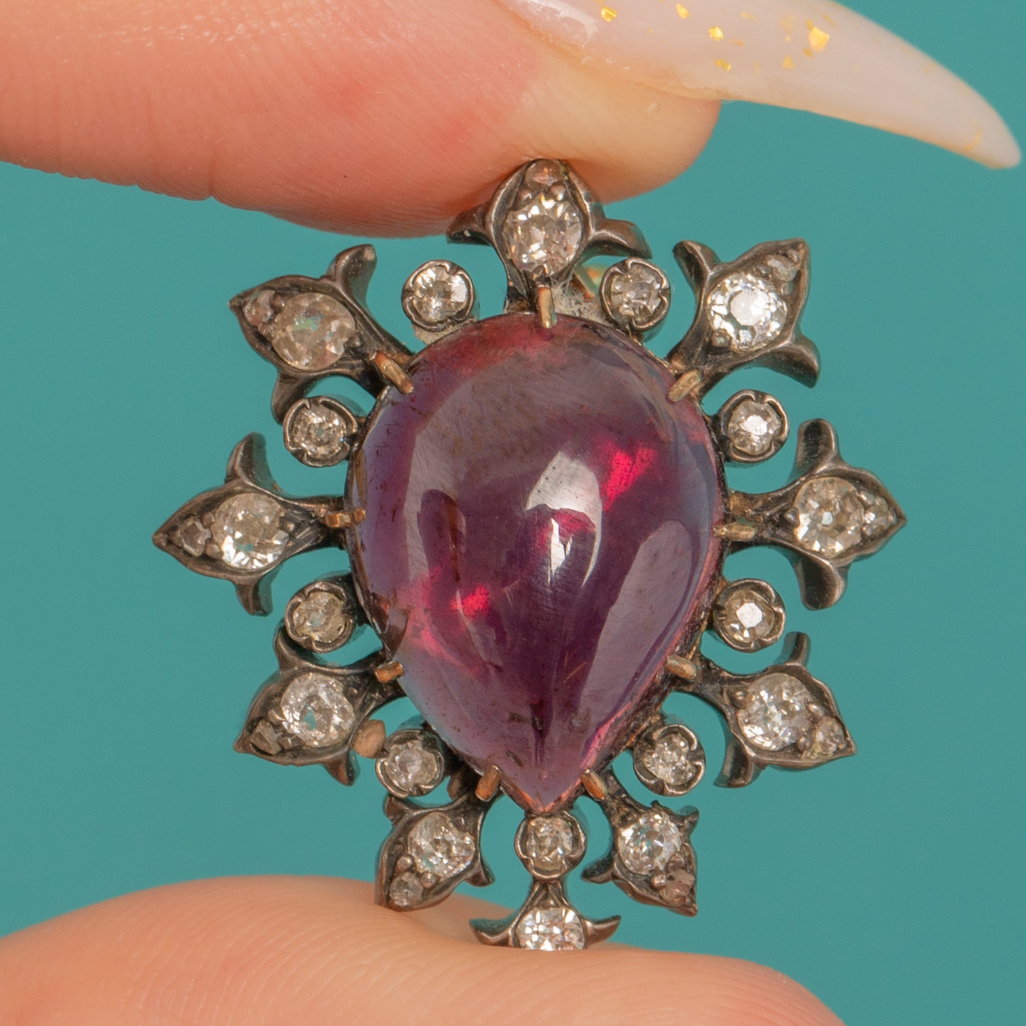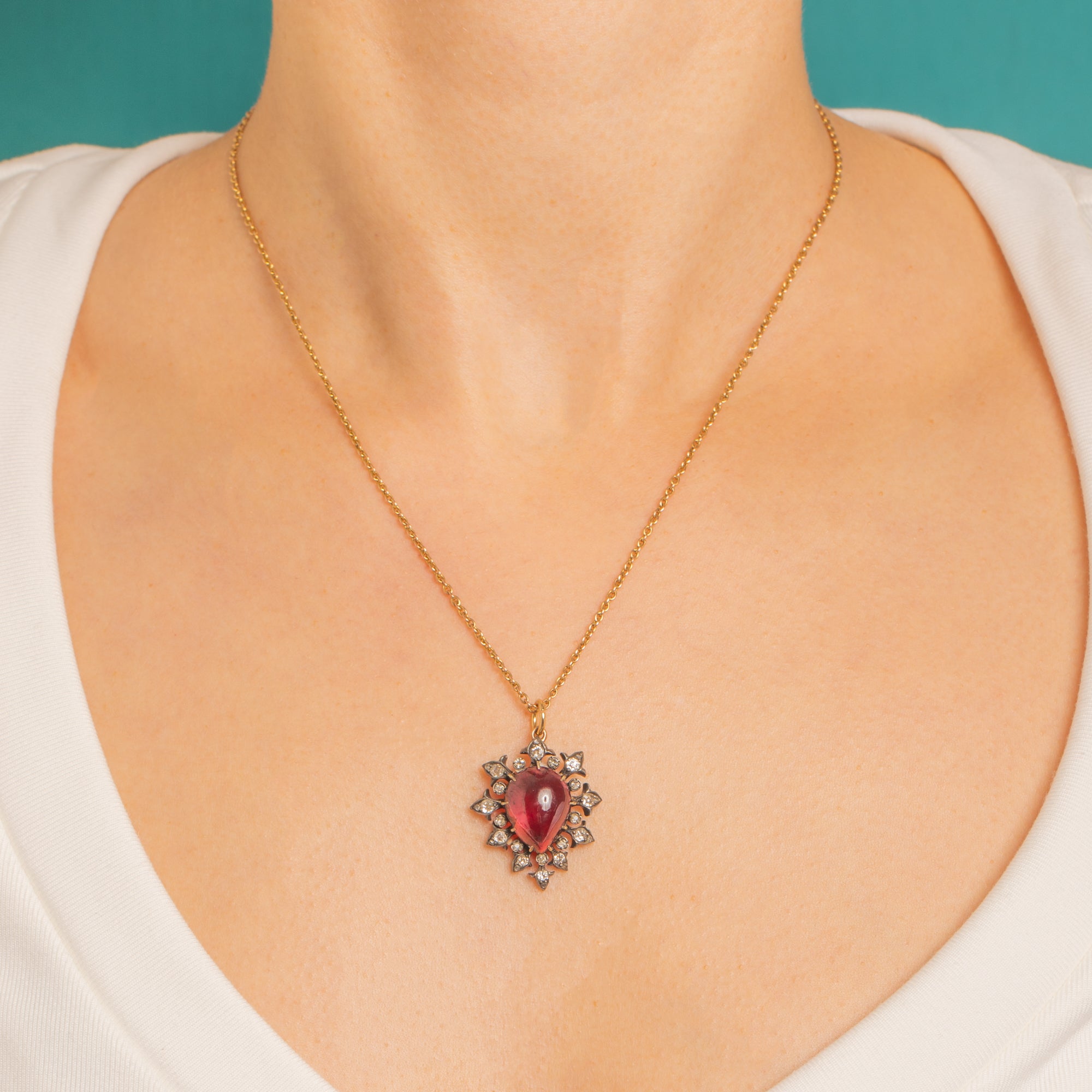A sumptuous Victorian heart pendant set with a richly hued Garnet cabochon, encircled by a sparkling Diamond cluster. The gem’s glossy dome is framed by delicately set tiny round Diamonds for a beautiful play of light and texture, creating a romantic, starry halo around the vivid centre.