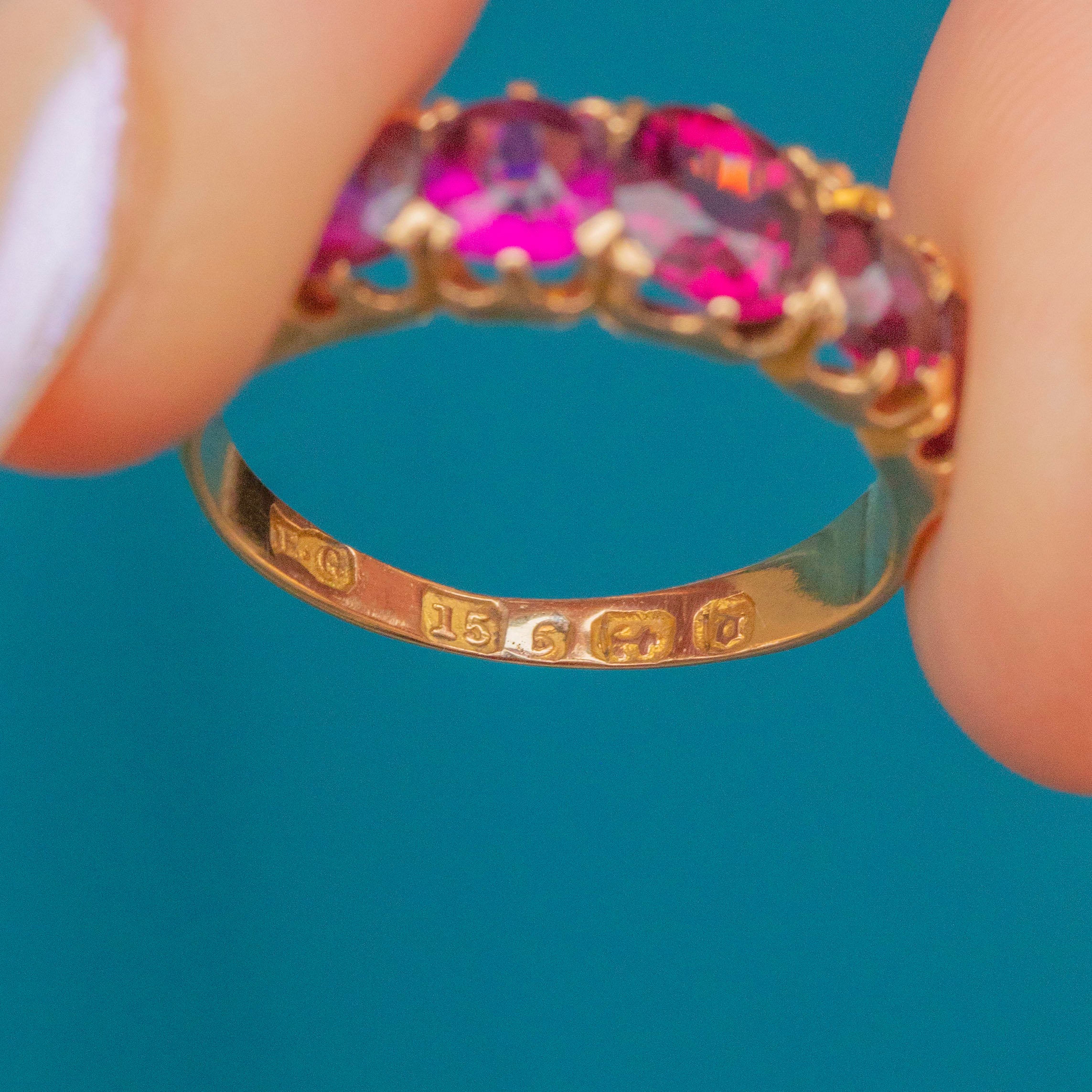 This antique 15ct Gold Garnet five stone ring is an antique collector's dream! Bursting with intricate craftsmanship, this antique ring homes five Garnets with punchy purple hues that glisten beneath the light.