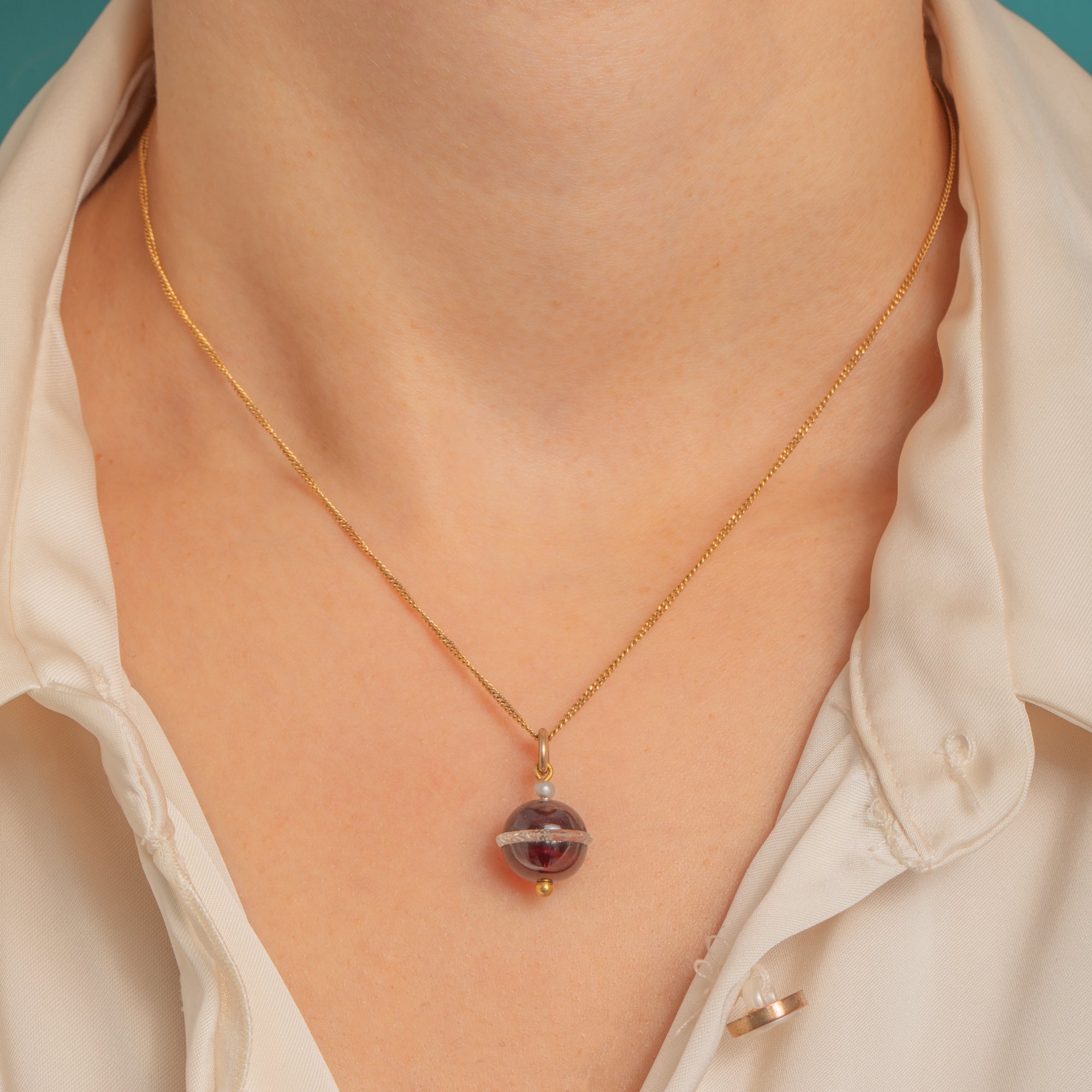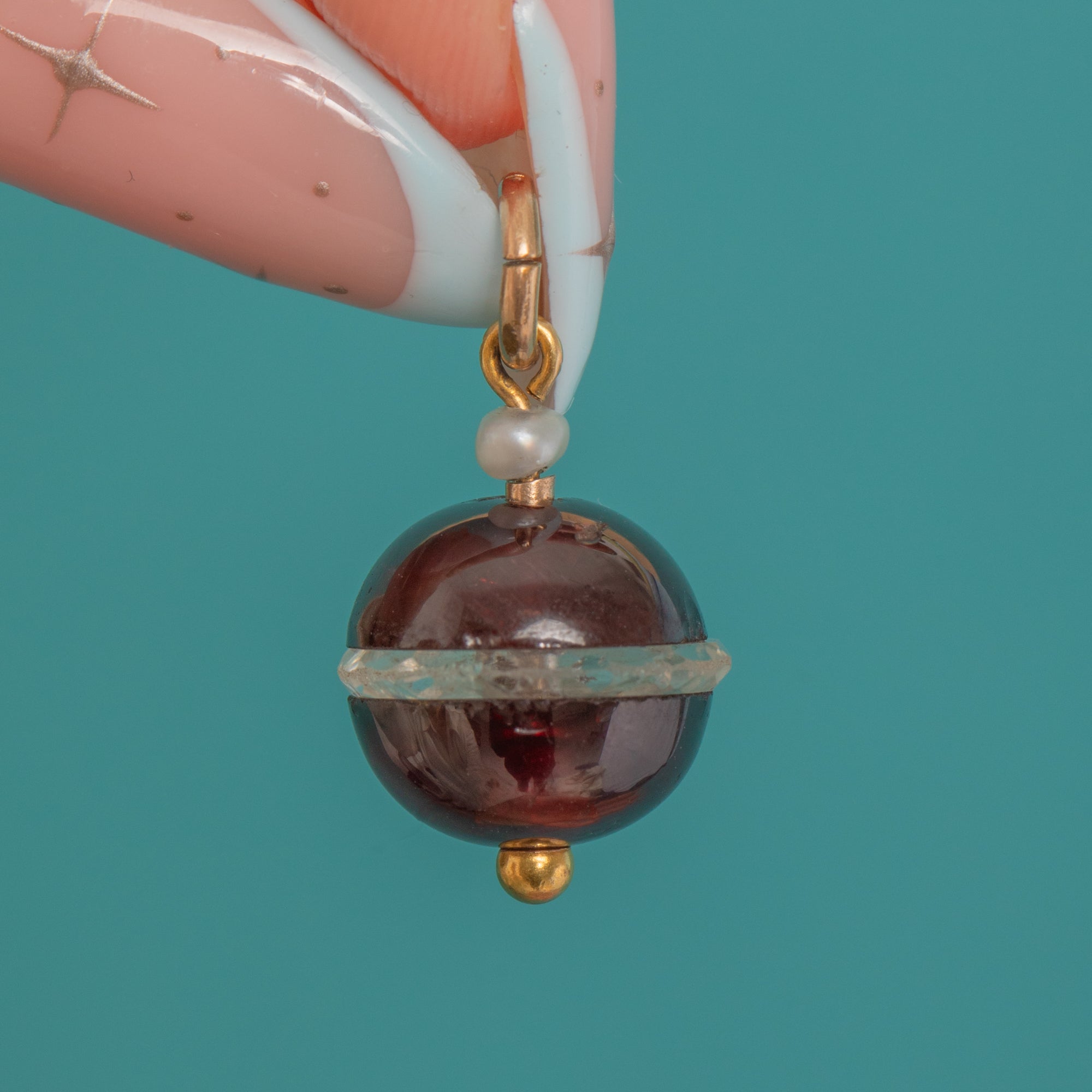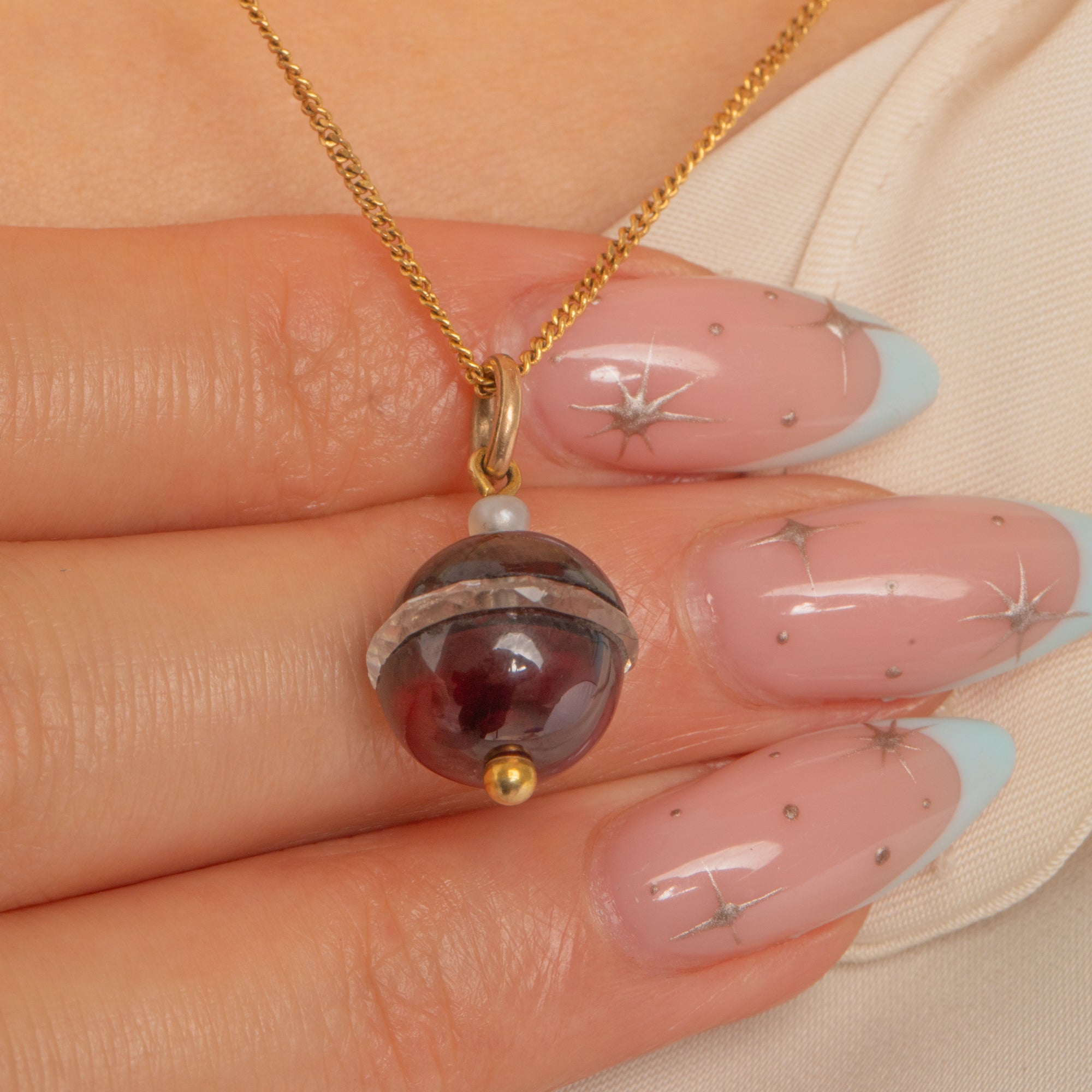 A charming Victorian “Saturn” orb pendant, this petite treasure marries a deep wine-red Garnet sphere with a twinkling band of Rock Crystal. Suspended on a 15ct Gold jump ring with a delicate Gold finial, the orb is capped by a tiny white Pearl spacer, lending a refined, antique poise.
