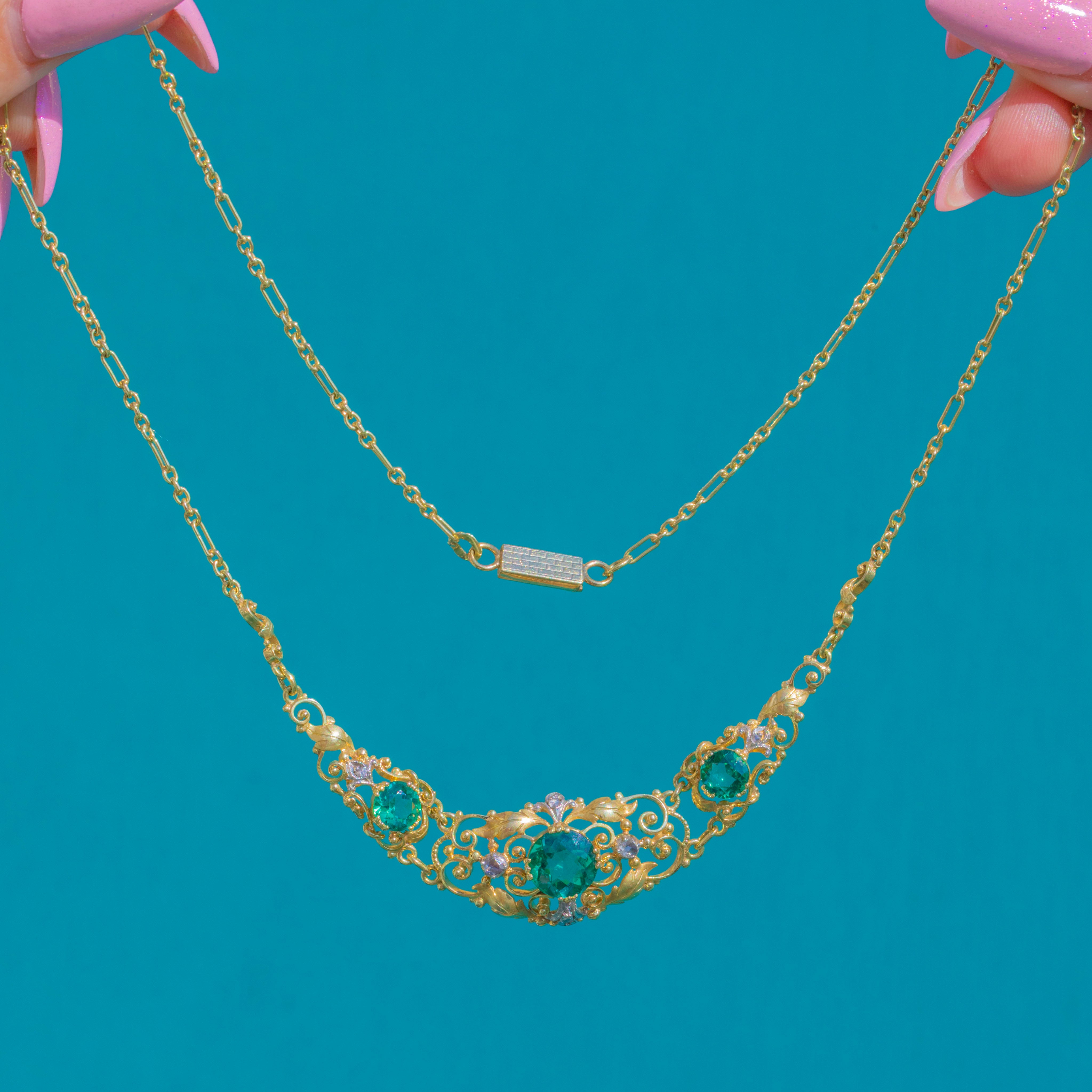 EXCELLENT: The Tourmalines and Diamonds are in excellent antique condition, with no obvious chips visible and only minimal wear. The Gold scrollwork, foliate detail and integral chain appear well cared for, with the settings secure. The necklace presents beautifully, with wear in keeping with age.