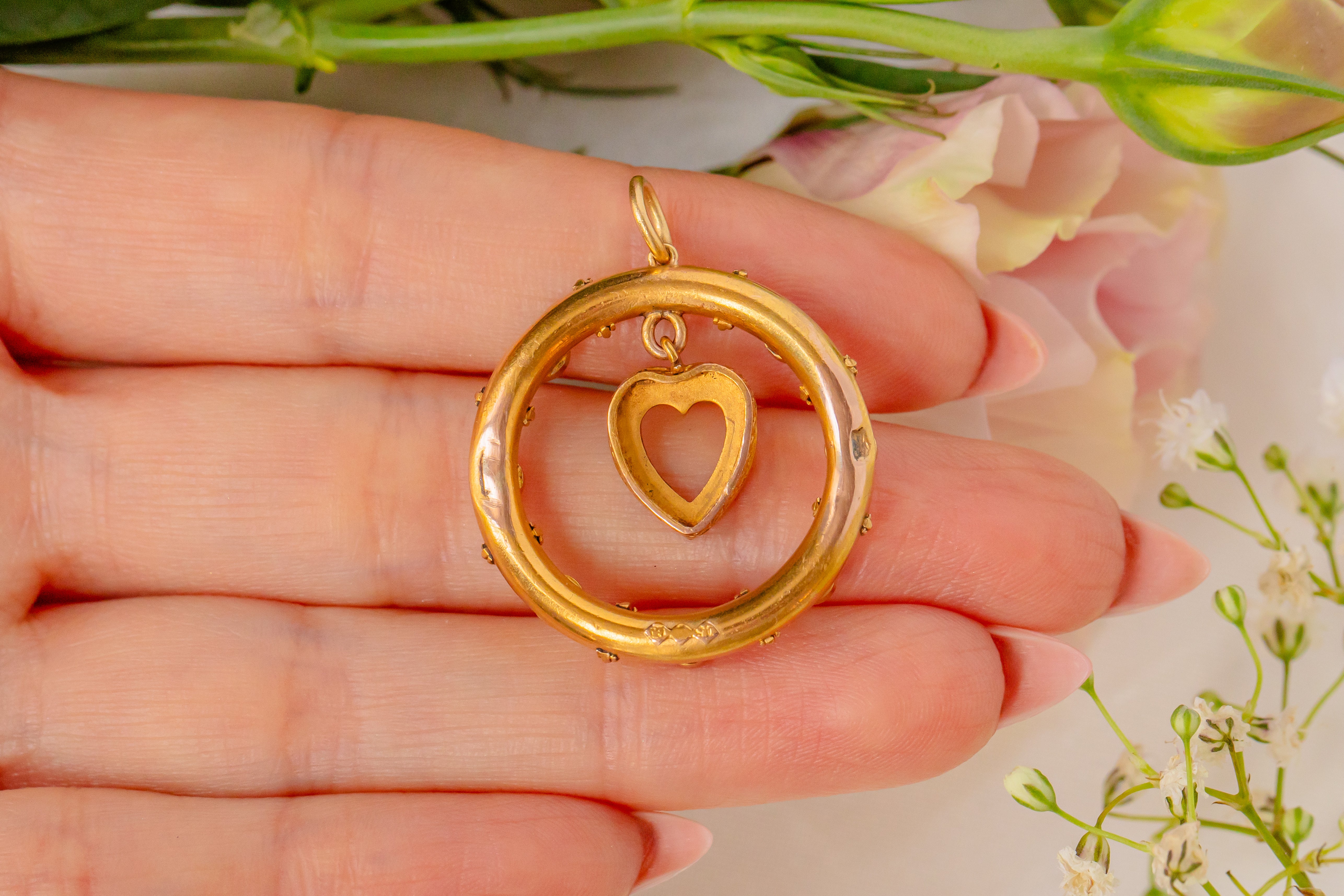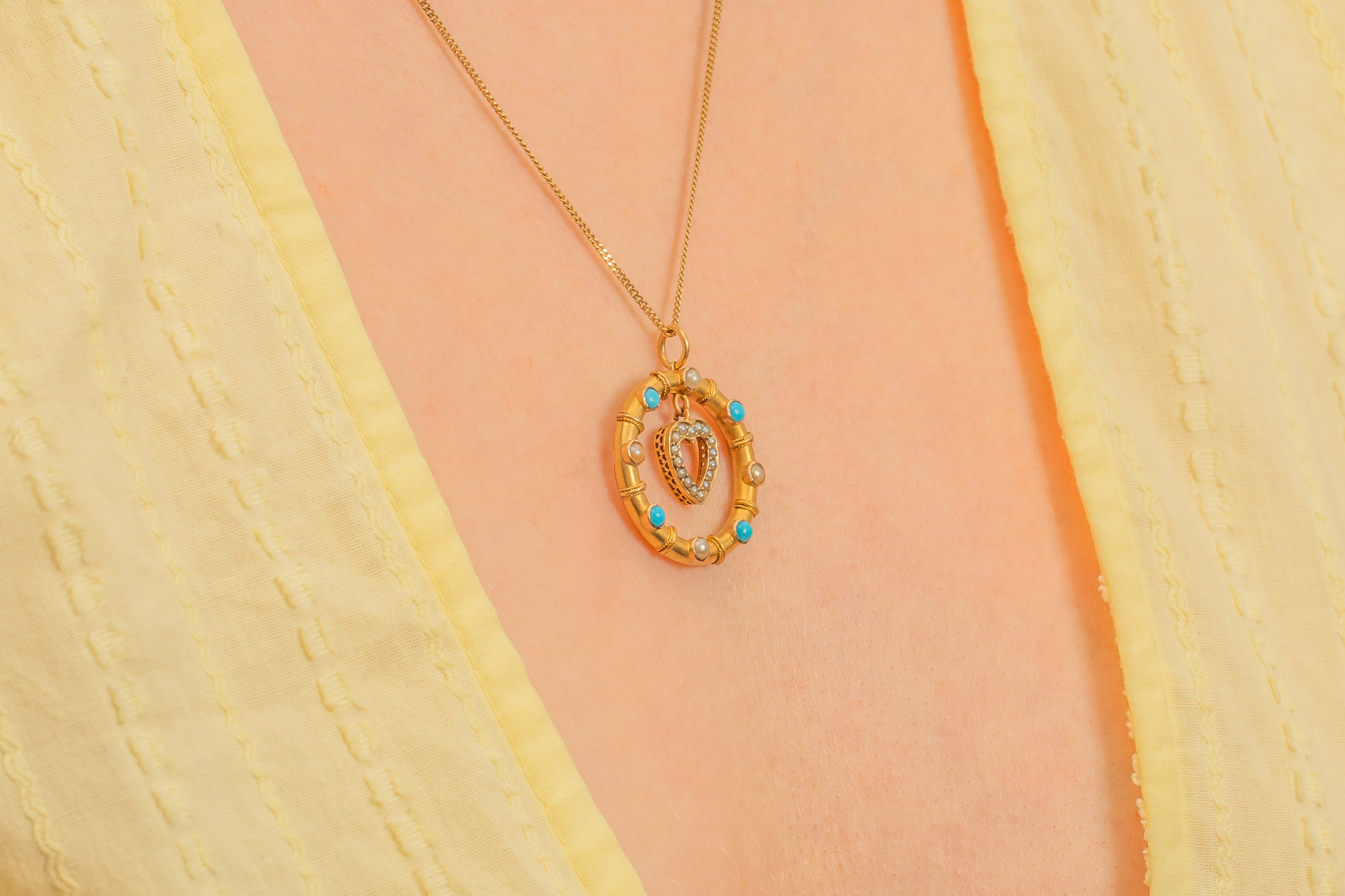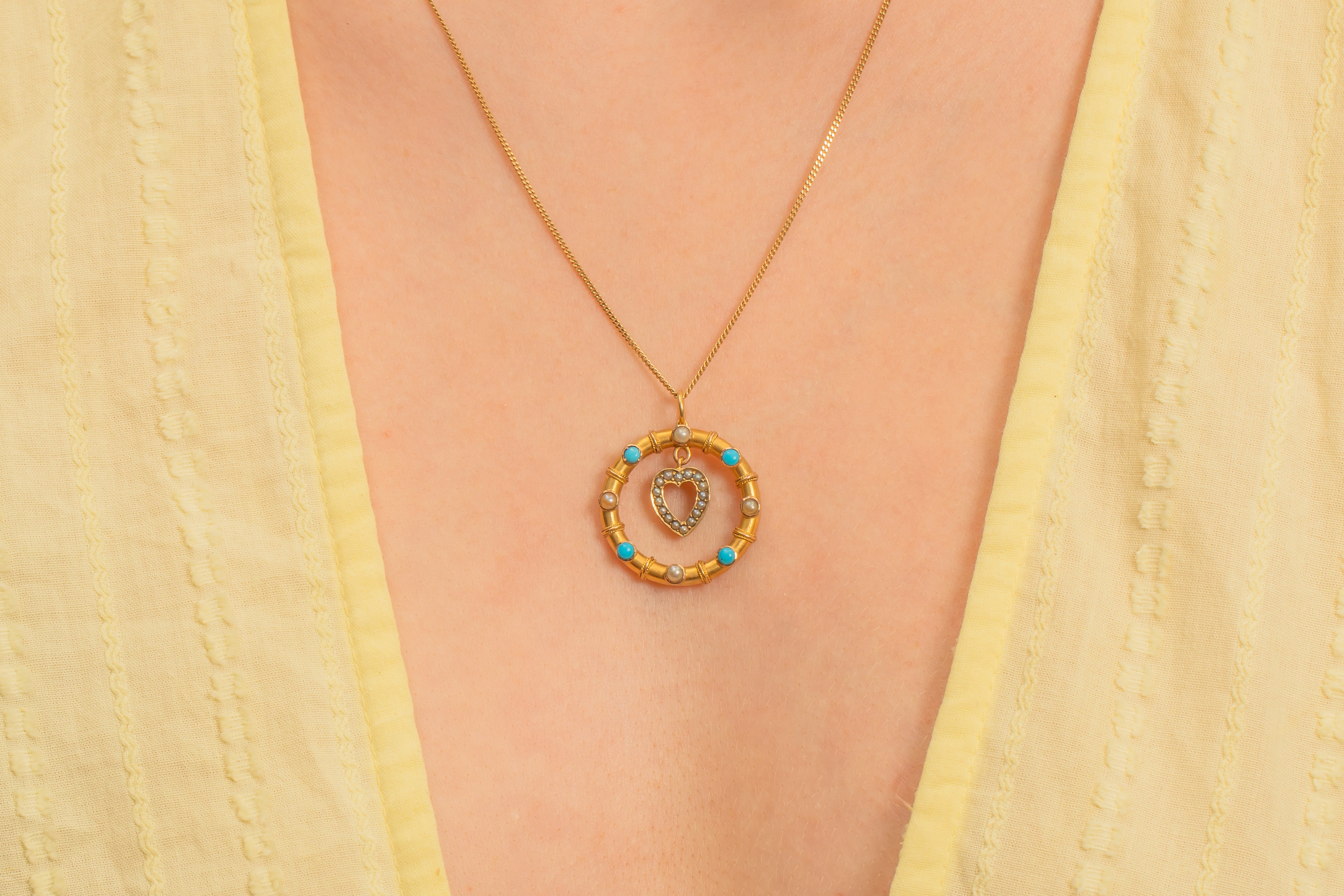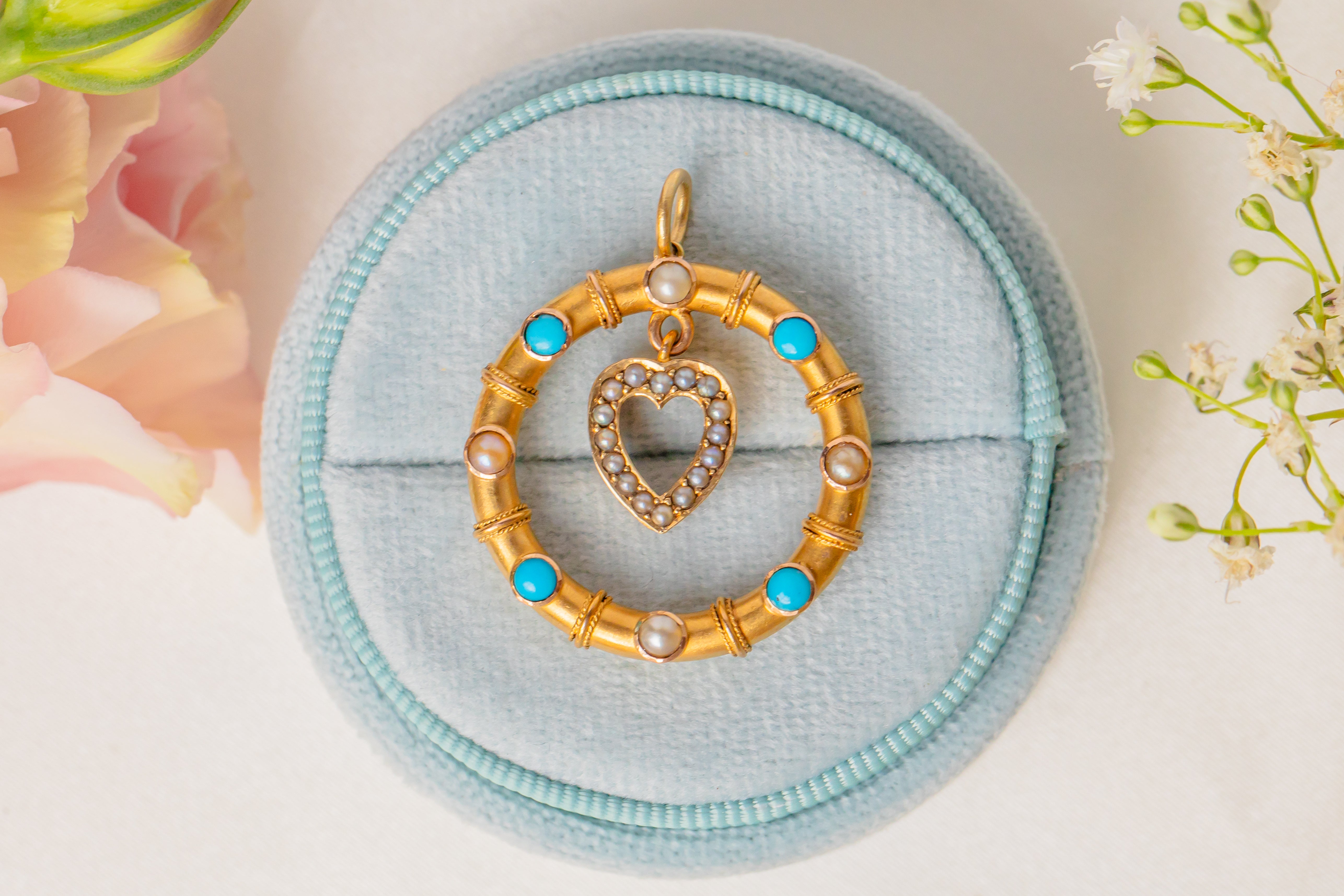 We simply adore this antique 15ct Gold heart drop Turquoise Pearl pendant! This gorgeous Gold pendant is buttery and bright, with a sweet little heart at the centre.