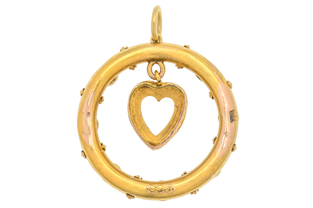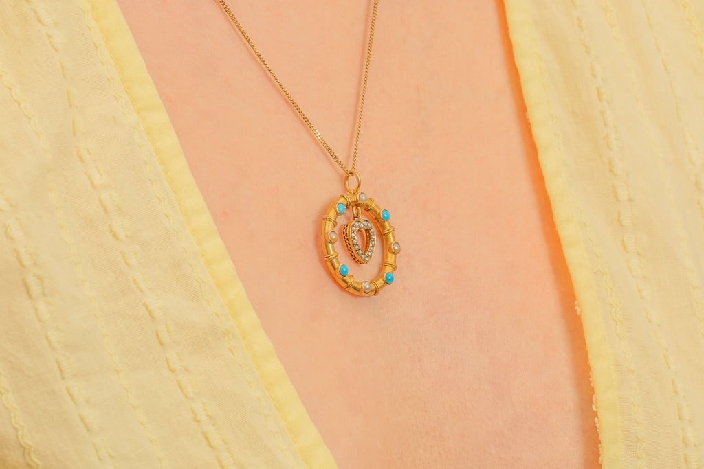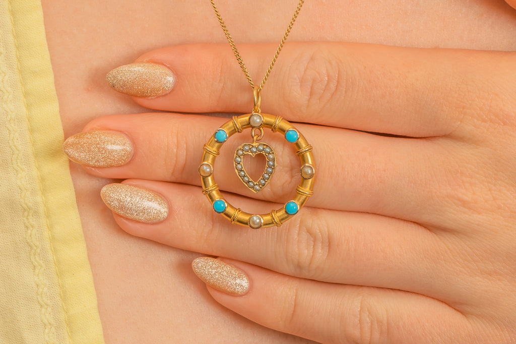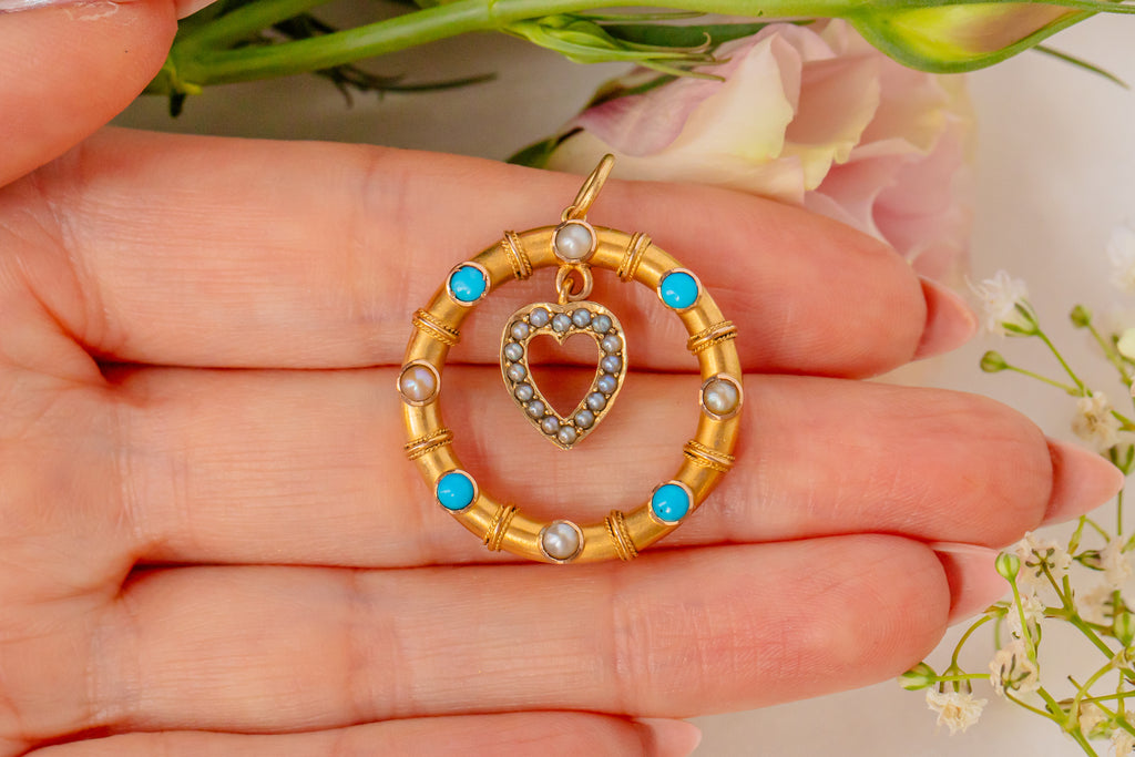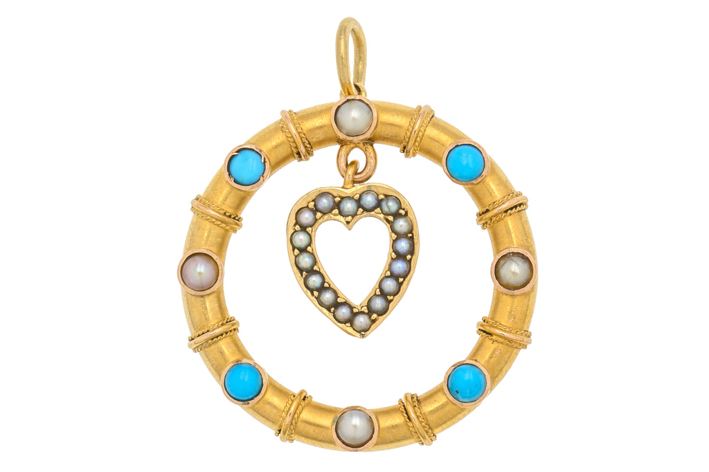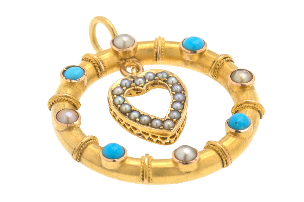 Antique 15ct Gold Heart Drop Turquoise Pearl Pendant
