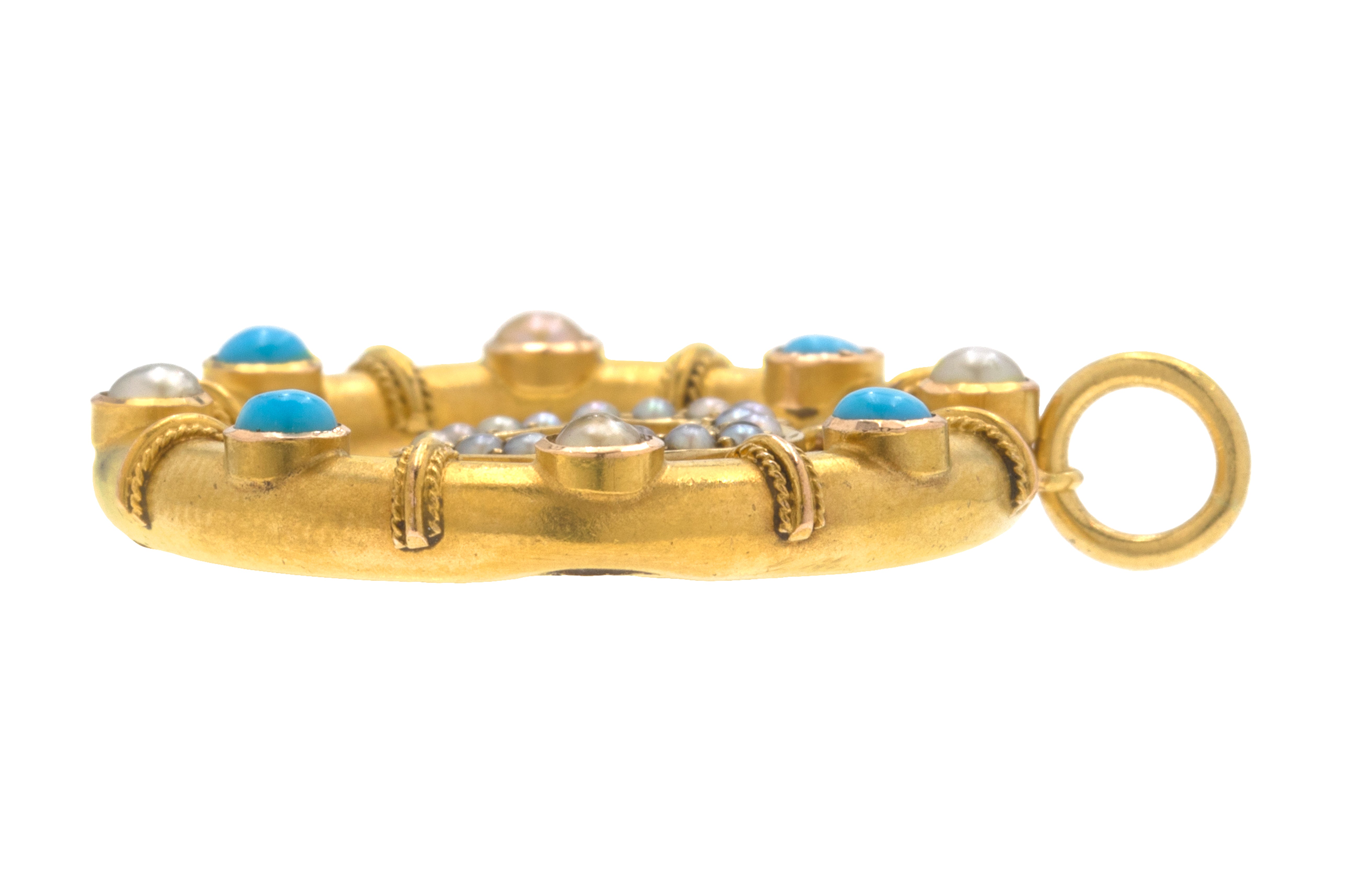 MATERIALS: Pendant itself tests as 15ct Gold, 18ct Gold jump-ring, Pearls, Turquoise.
