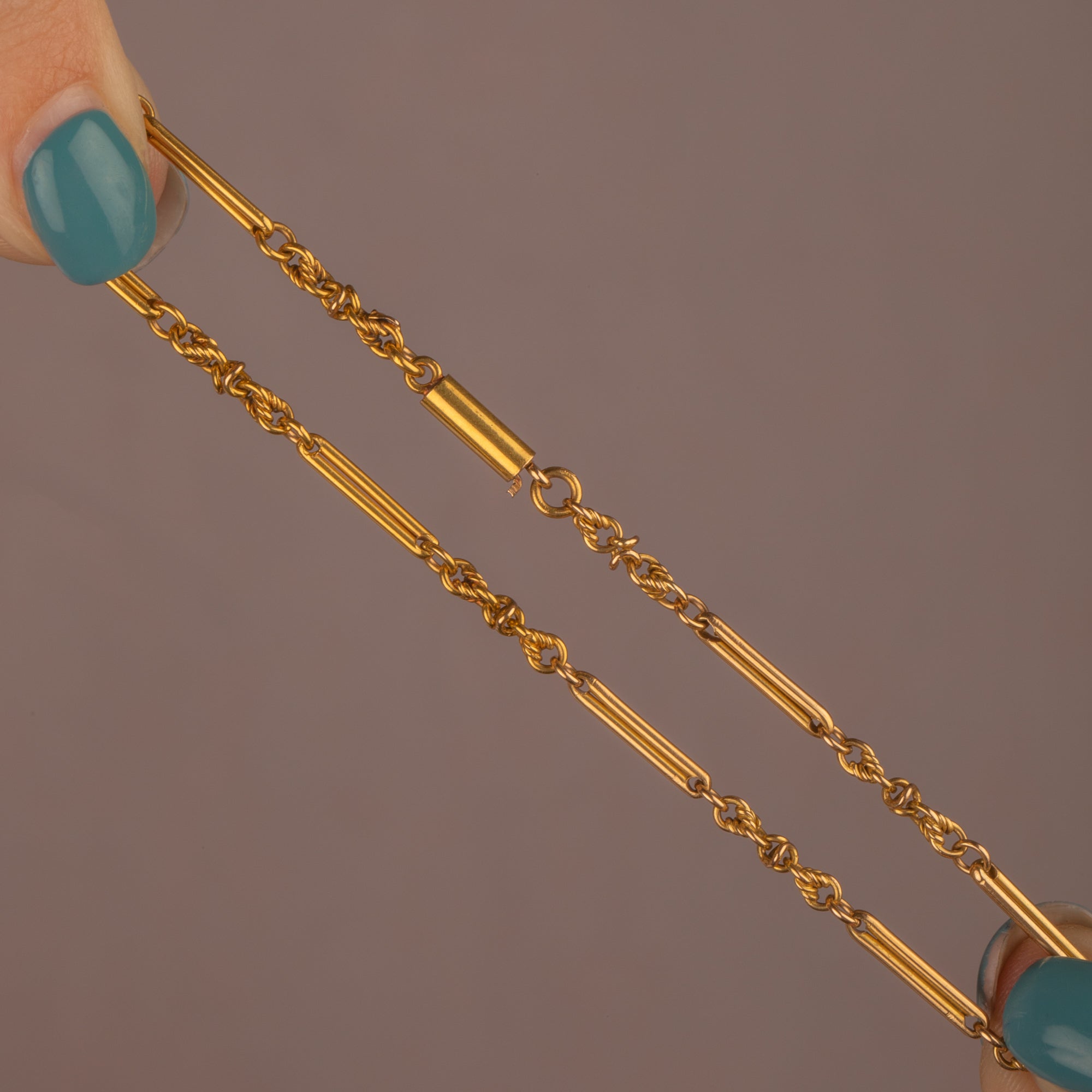 This Victorian Gold chain consists of pretty lovers' knot links with alternating trombone links, culminating in a splendid Victorian piece which is still as beautiful today as when she was first crafted over 100 years ago!