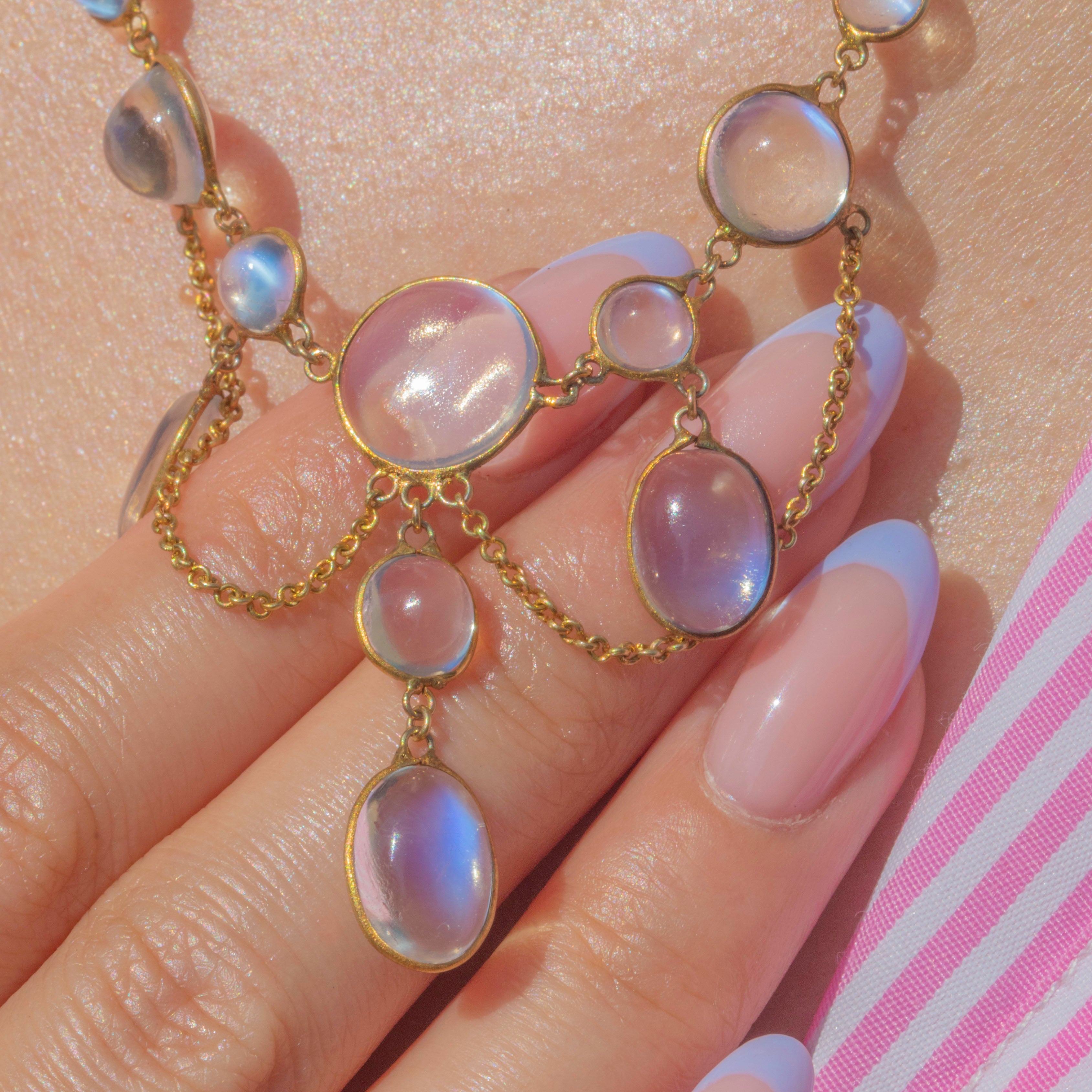The shining droplets of moonlight, each with a glowing adularescence, are displayed within a gorgeous fringe design and possess a fluidity like no other. Simply drape her across your décolletage for a timelessly elegant allure.