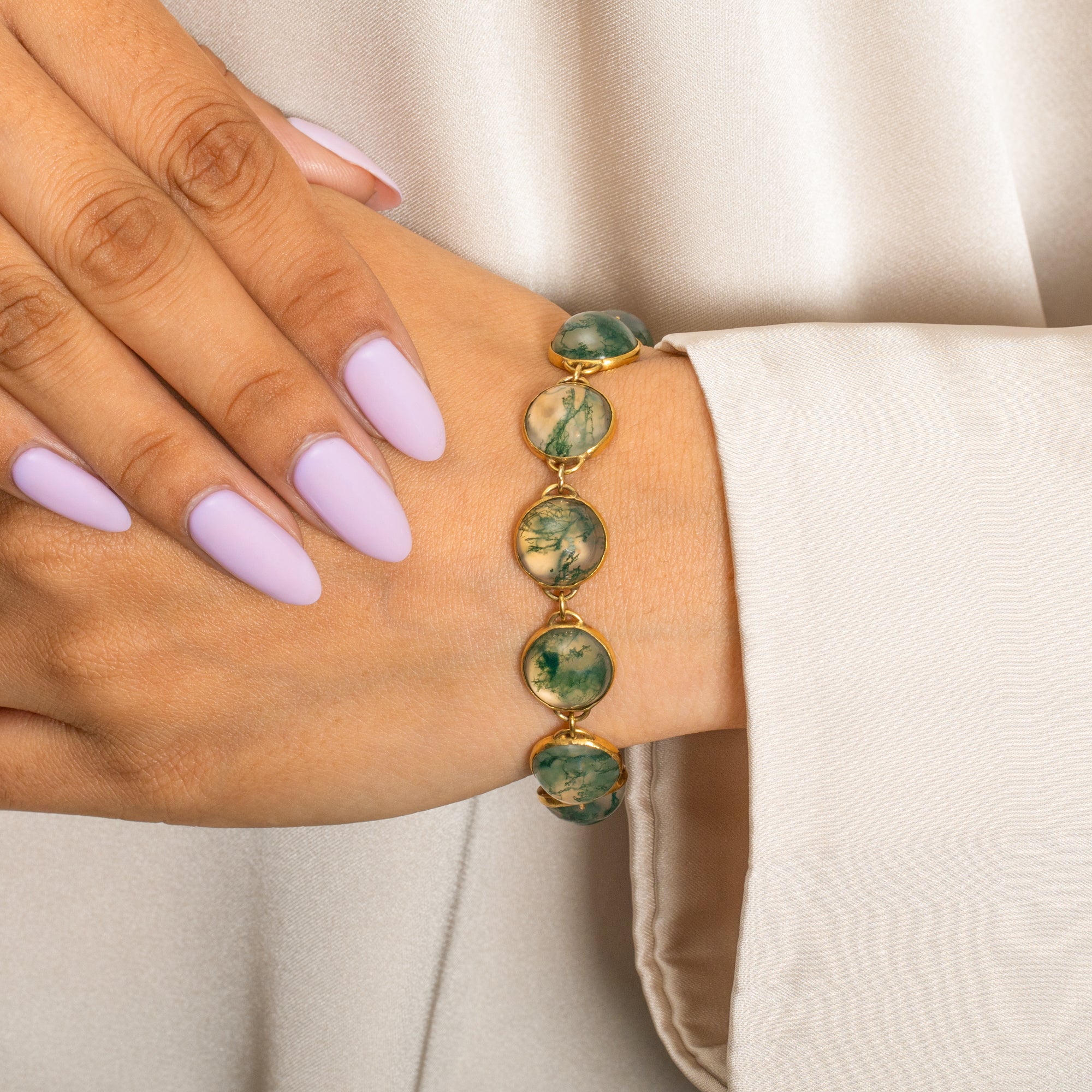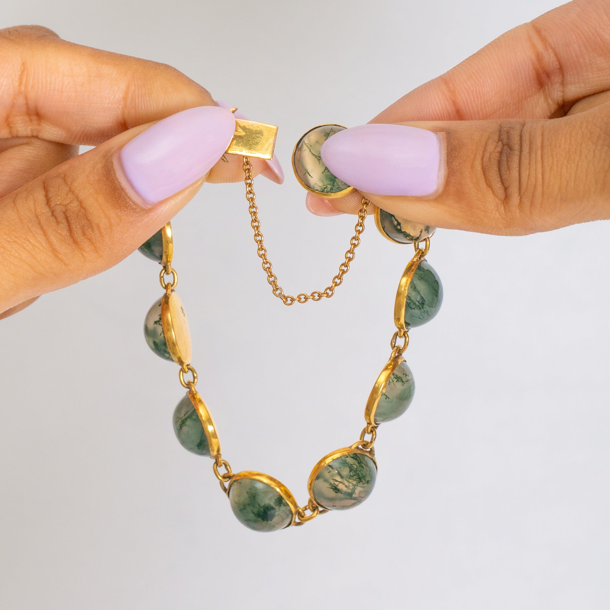 VERY GOOD TO EXCELLENT. This antique 15ct Gold moss Agate bracelet is in fabulous condition. The Agate cabochons are smooth to the touch, free from chips or abrasions. The back of the bracelet exhibits some minor dings and surface wear, however, these are not noticeable when worn. The 15ct Gold is lustrous and the bezles hols the Agates securely in place. The tongue clasp is in perfect working order, providing you with a safe closure. With proper care and maintenance, this antique bracelet will last for generations to come!