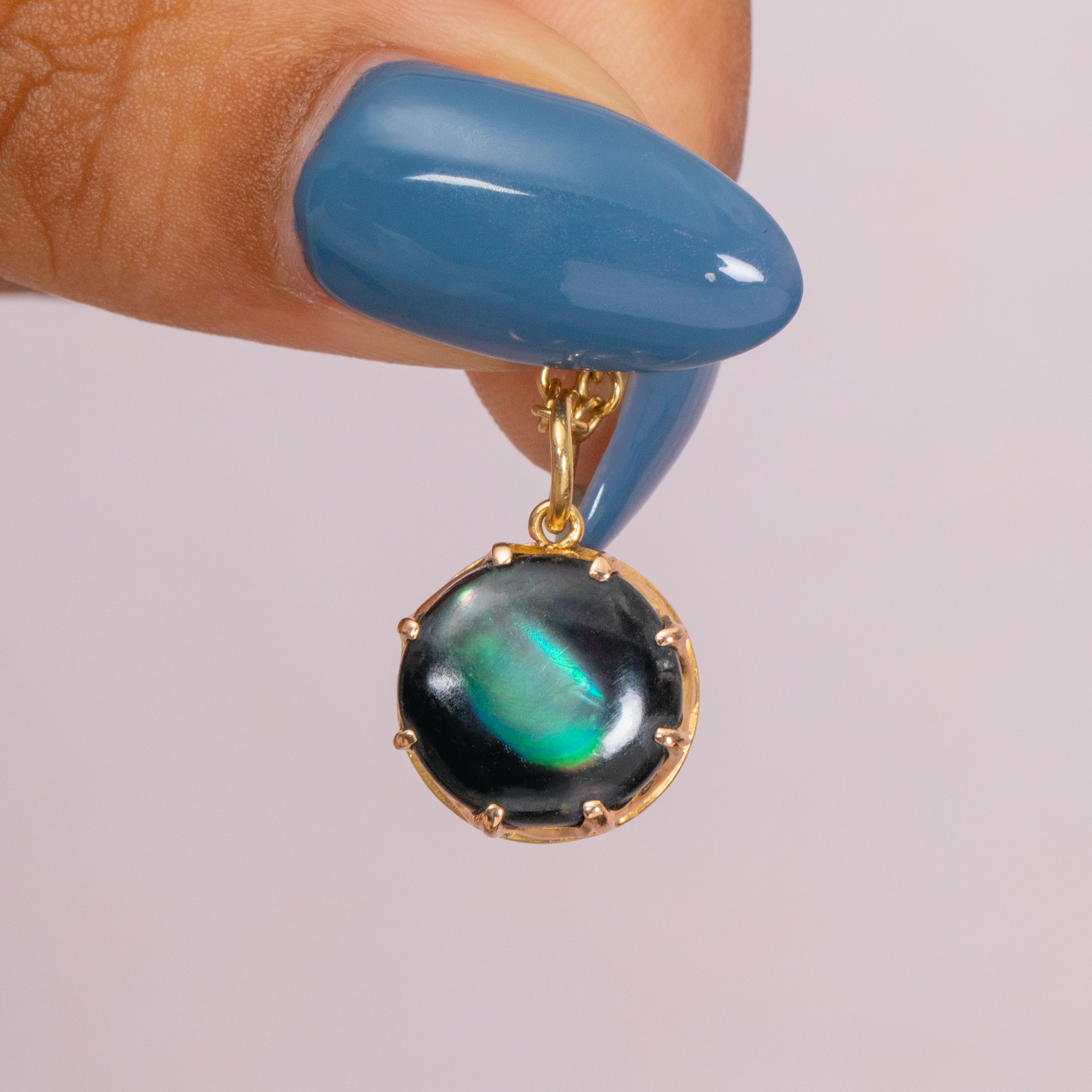 Become lost in the otherworldliness of this antique 15ct Gold Mother of Pearl charm! Akin to an aurora borealis (or Northern Lights), her jet-black core illuminates a pearlescent sheen that shimmers with ethereal tones.