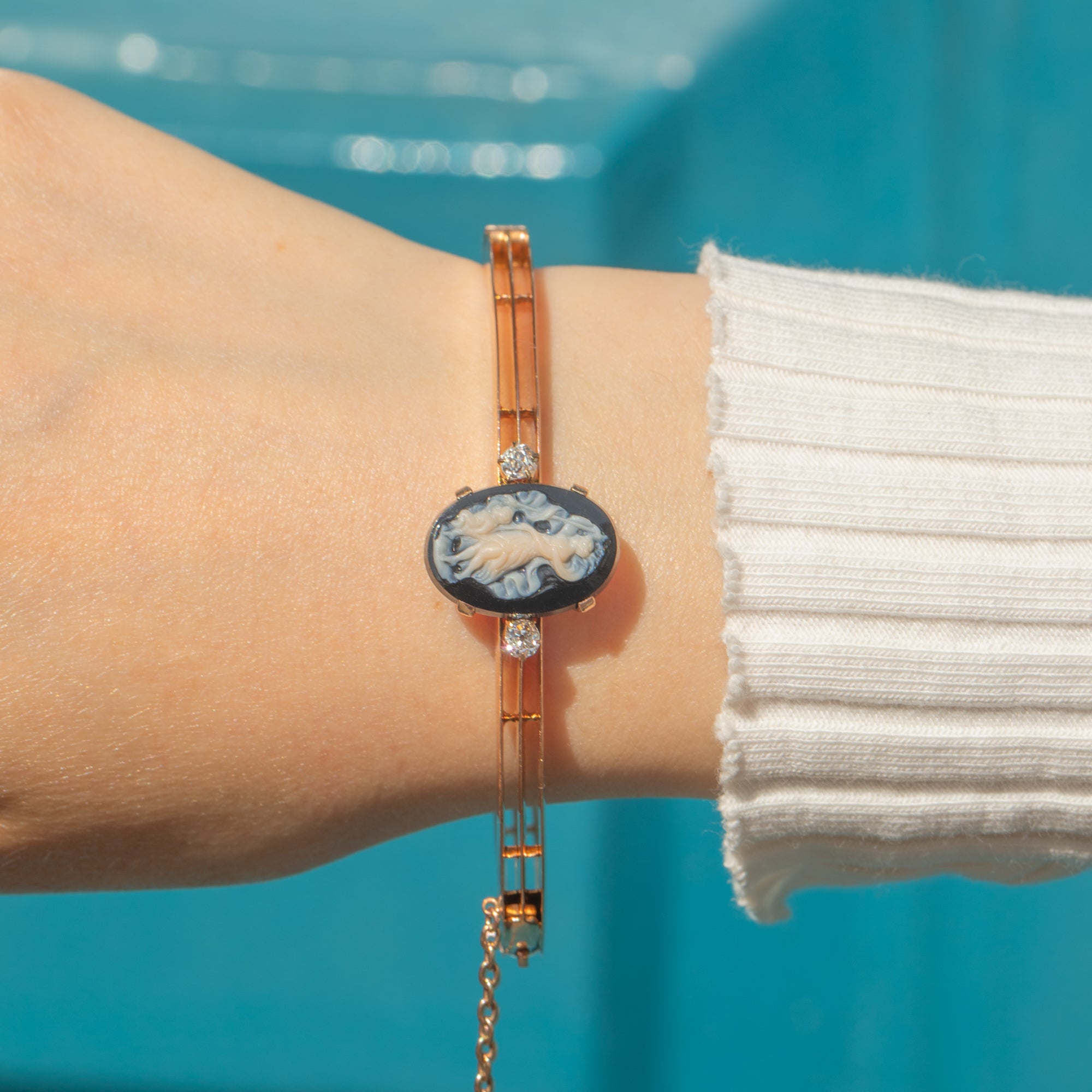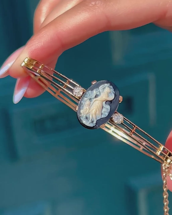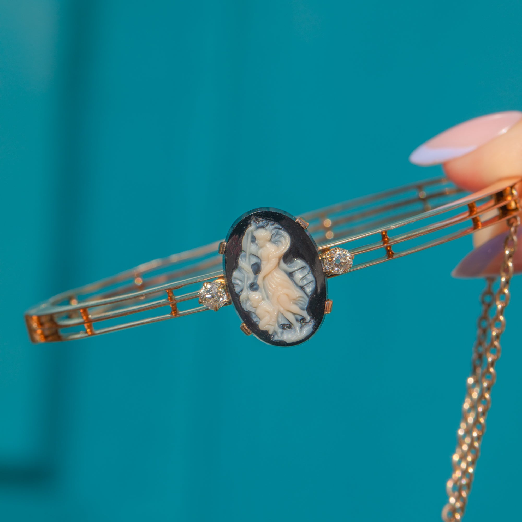 This antique 15ct Gold Onyx Cameo Diamond bangle is a true celebration of Victorian jewellery! The hand-carved Onyx displays exquisitely detailed figures, giving the piece a life-like appearance - one can only marvel at the skilled craftsmanship of this impressive bangle.