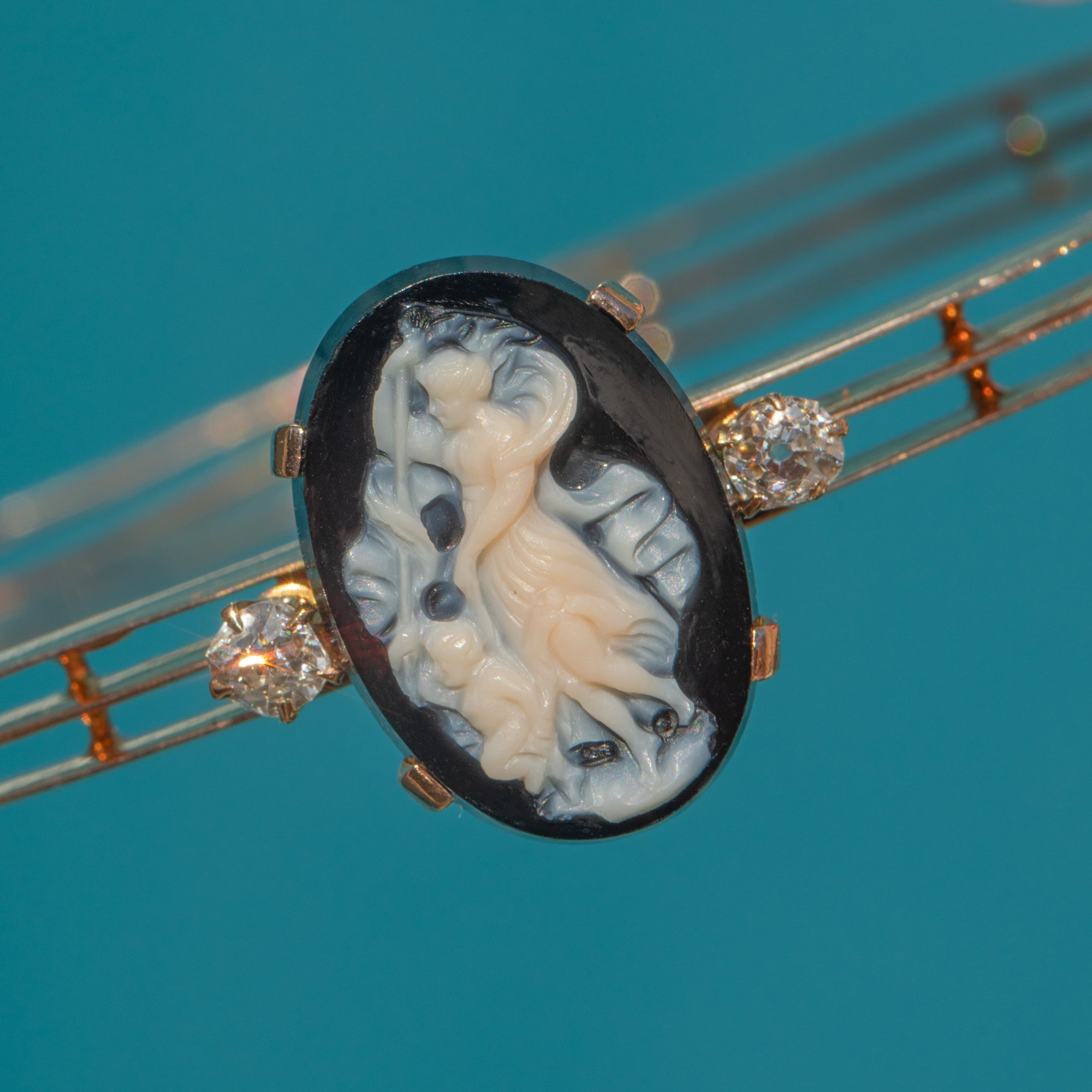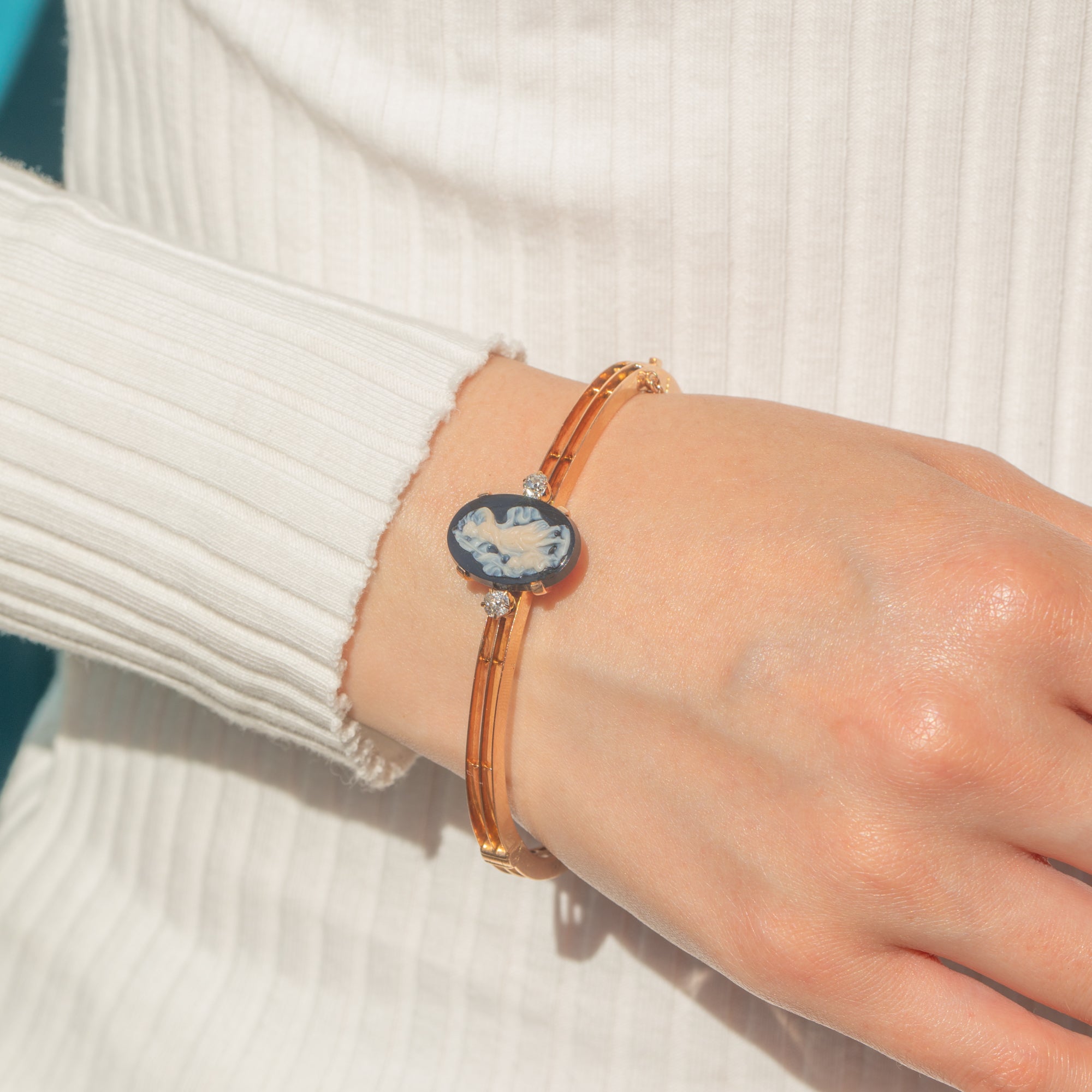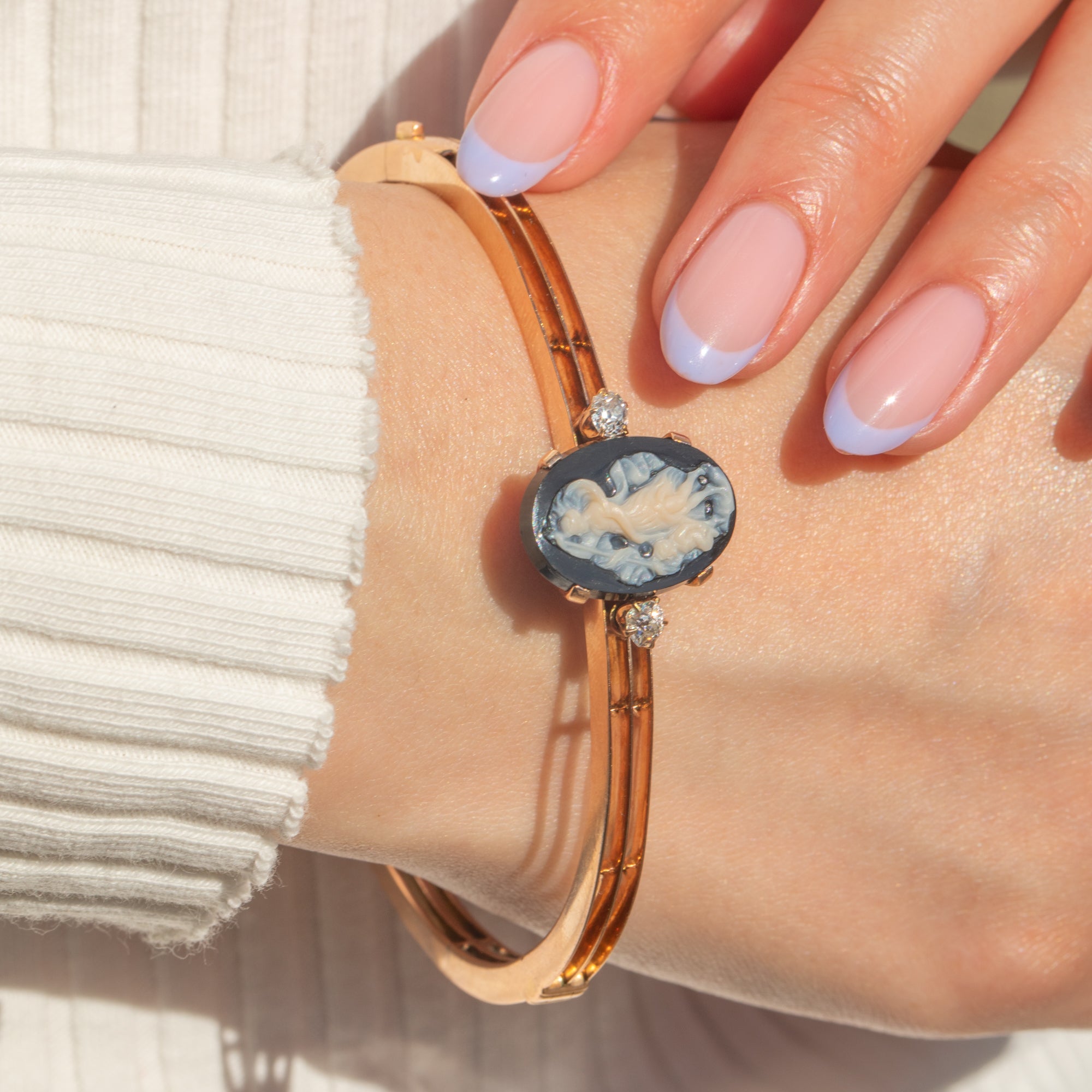 This antique 15ct Gold Onyx Cameo Diamond bangle is a true celebration of Victorian jewellery! The hand-carved Onyx displays exquisitely detailed figures, giving the piece a life-like appearance - one can only marvel at the skilled craftsmanship of this impressive bangle.