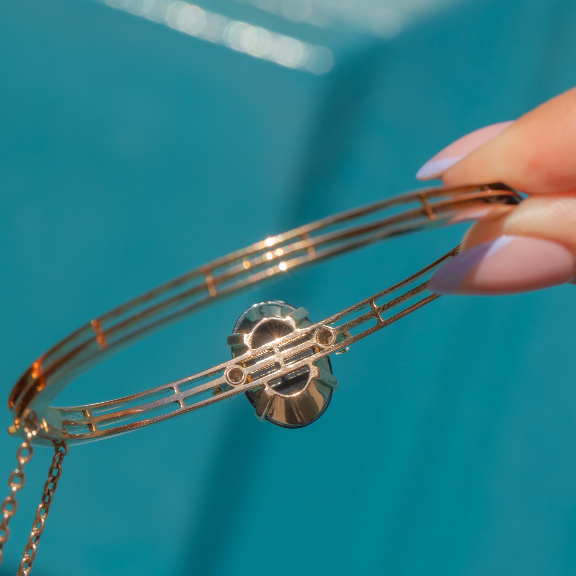 VERY GOOD-EXCELLENT: This antique 15ct Gold Onyx Cameo Diamond bangle is in wonderful condition. The Cameo is pristine, with no wear to the carved details, and the Diamonds are secure and free from flebaites or abrasions. Although the band has a few mild dings, these are only noticeable under close inspection and do not detract from the overall impact of the piece. The Gold is bright with a high-shine polish and the bangle closes securely. With the additional, solid 9ct Gold safety chain, you can enjoy wearing this outstanding antique Gold bangle with absolute confidence!