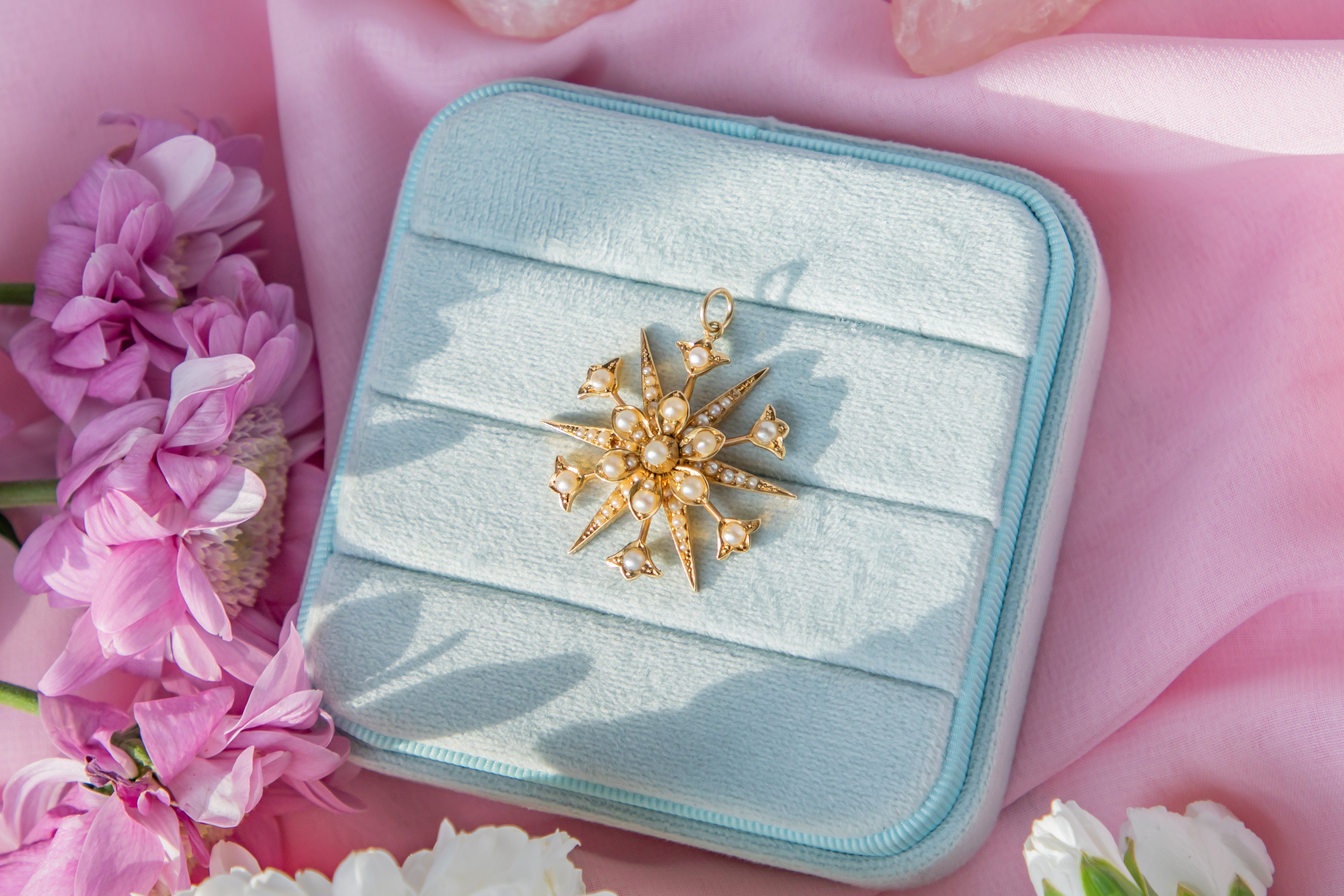 Plucked from a starlit sky, this antique 15ct Gold Pearl 'starburst' pendant is just breathtaking! Rich with celestial charm, her starburst is crafted from Gold akin to a pool of honey, inlaid with lustrous Pearls throughout.