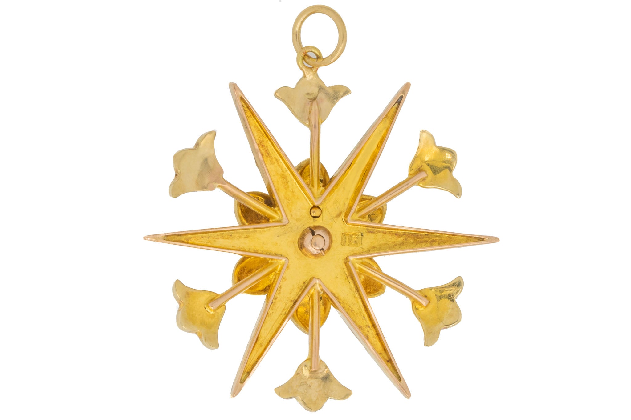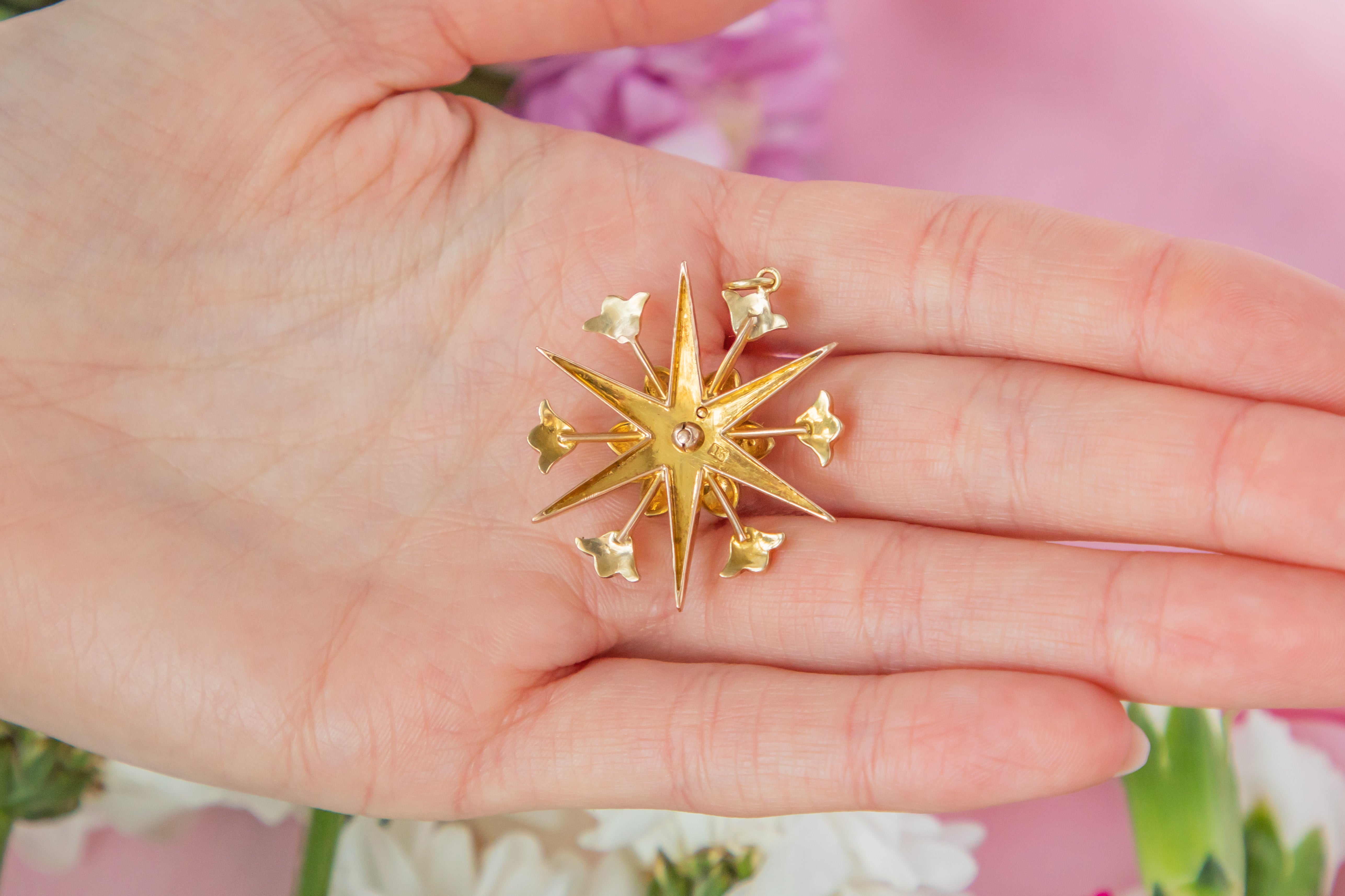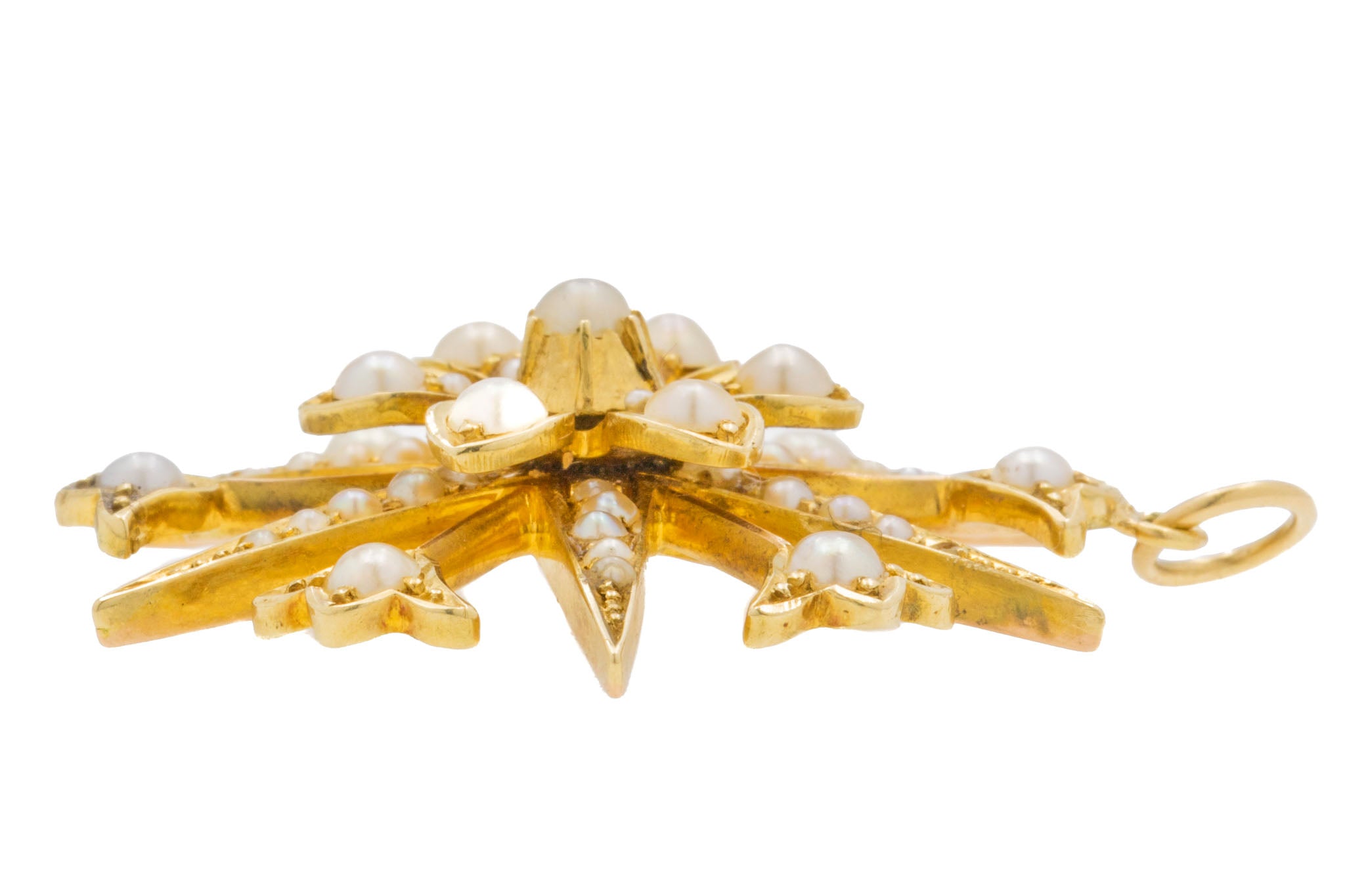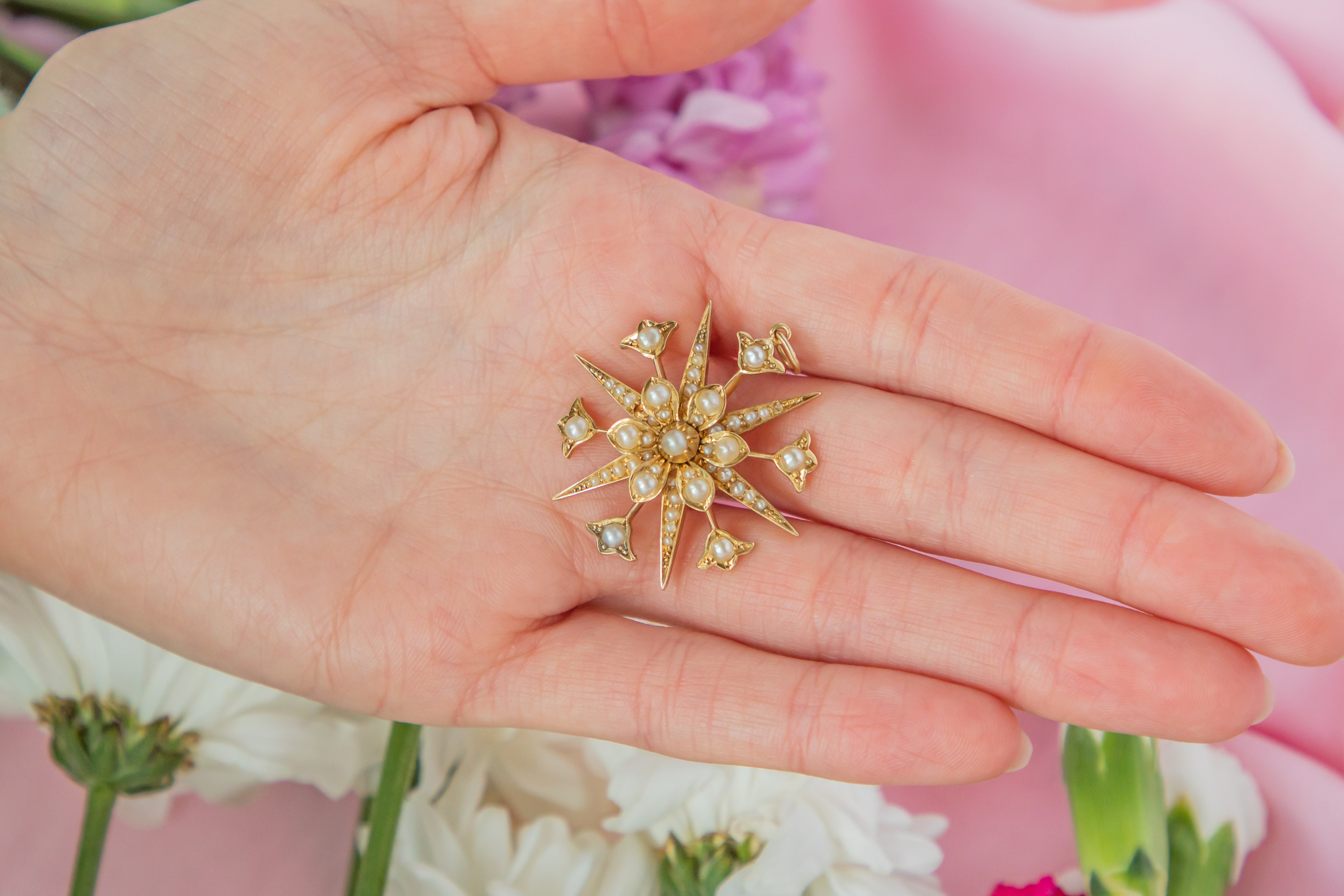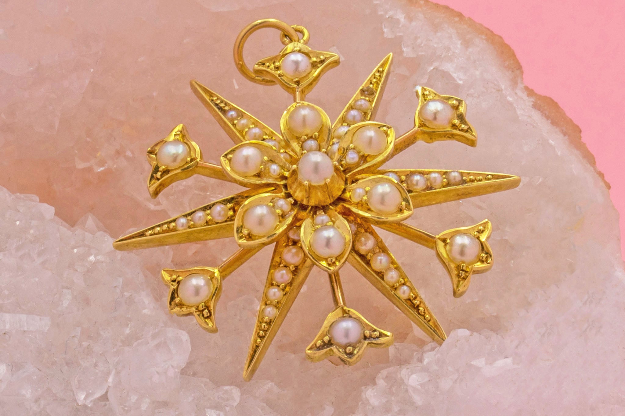 VERY GOOD. This antique 15ct Gold Pearl 'starburst' pendant is in gorgeous condition throughout. Her 15ct Gold has retained a glowing saturation and firmly holds each of her shimmering Pearls in place. There is slight surface wear to the back of the pendant, however, this is not visible when worn! With her soldered jump ring, she can be worn with the utmost confidence throughout the day. She is a definite conversation starter!
