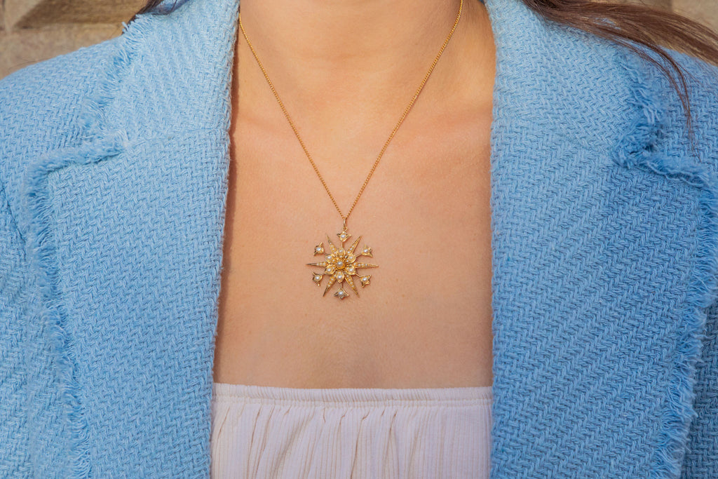 Suspended this striking Victorian Pearl pendant from a fine Gold chain and she will twinkle beneath the light as she adorns your neck. Stars have been known to be symbolic of guidance and protection, making her the perfect pendant to keep close to your heart at all times. A Victorian treasure, she will make the perfect addition to your antique jewellery collection!