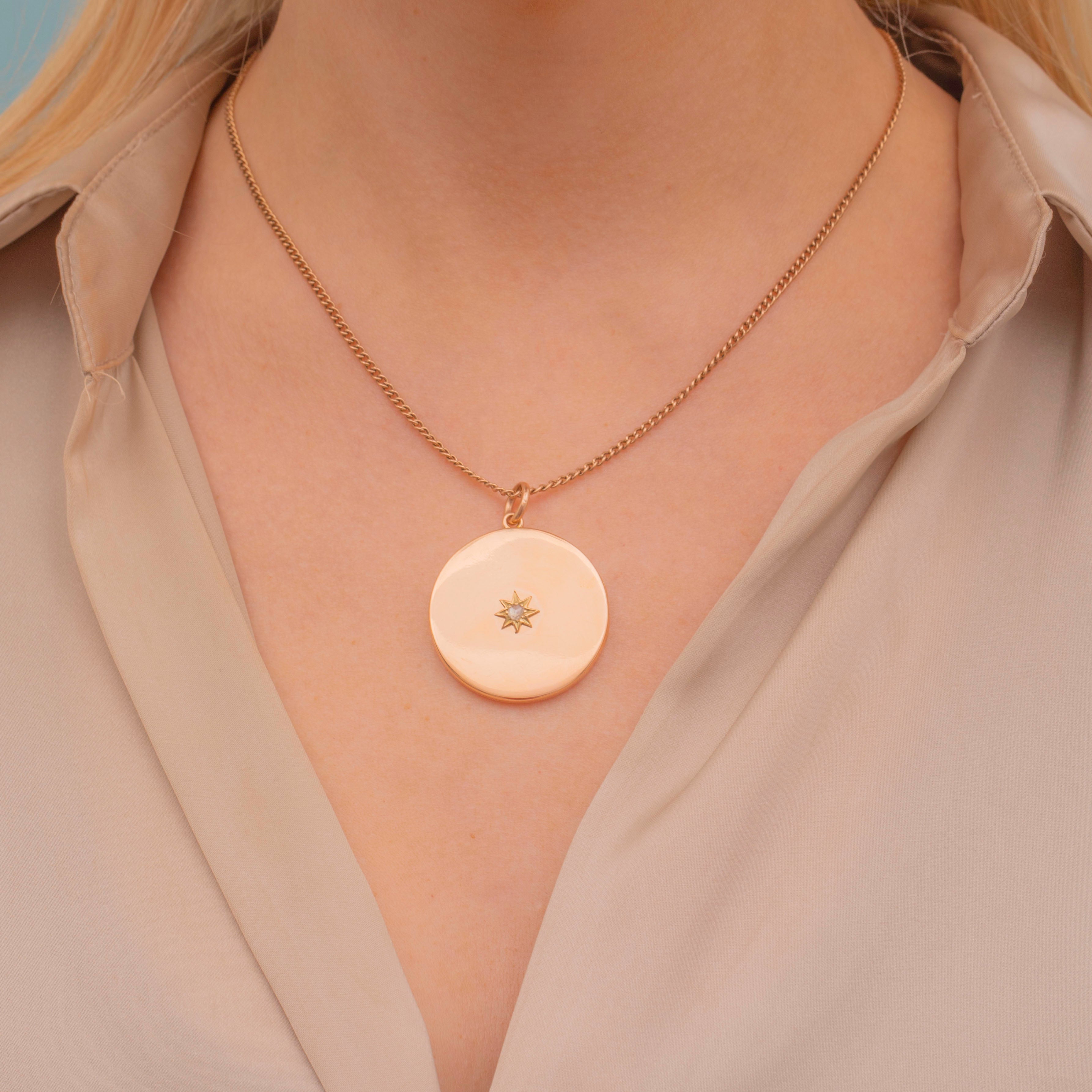 Crafted from sumptuous 15ct Gold, this large celestial locket features a twinkling rose-cut Diamond flush set within a bold star. With space to fit a large photo inside, you can keep your treasured loved ones close to your heart!