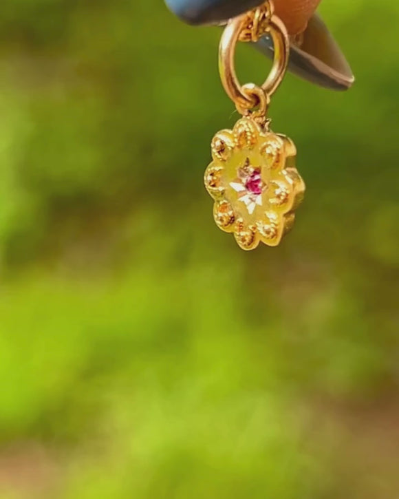 This exquisite antique 15ct Gold Ruby flower charm will bring undeniable femininity to your repertoire! At its centre lies a captivating Ruby, gleaming with deep crimson hues, reminiscent of a flower in full bloom.