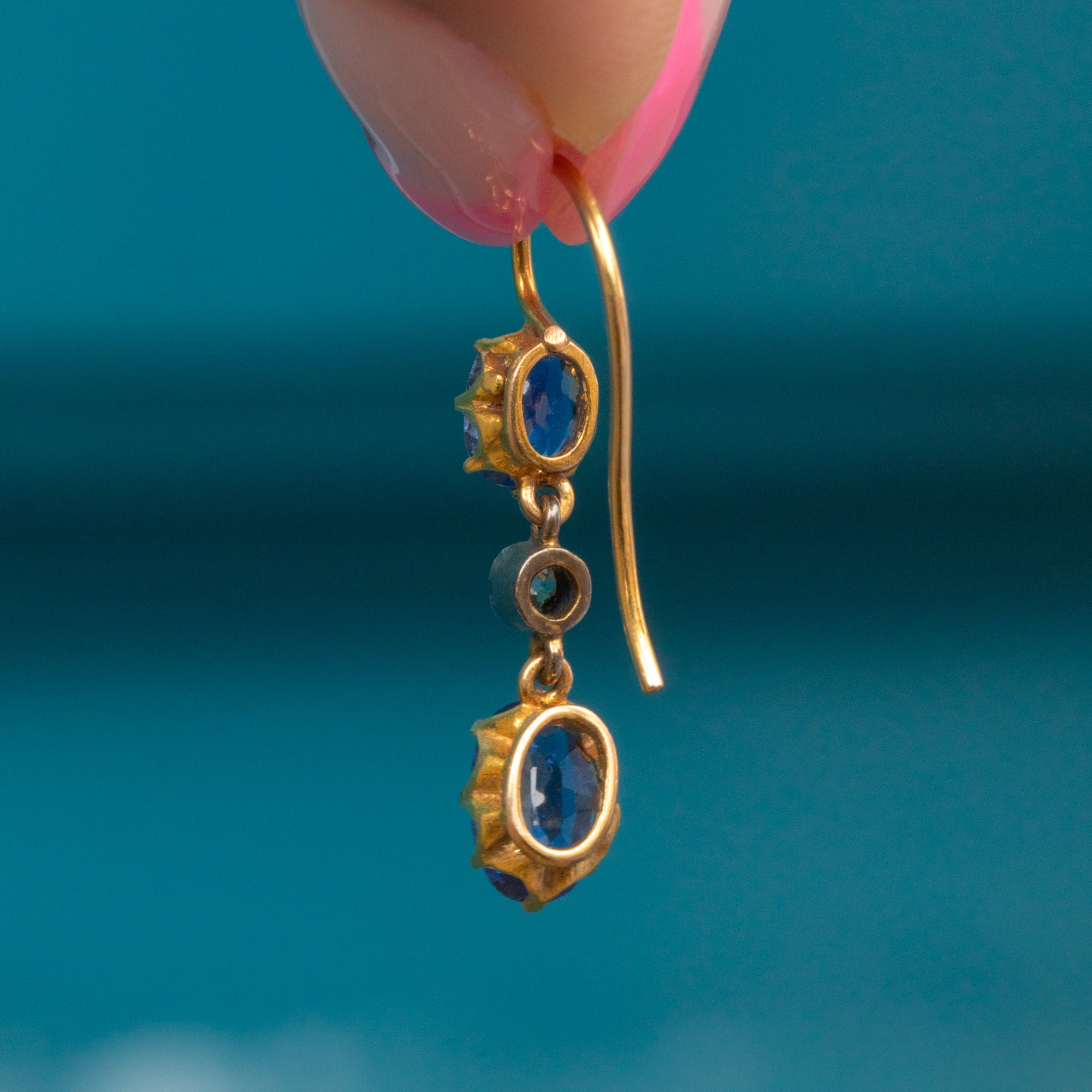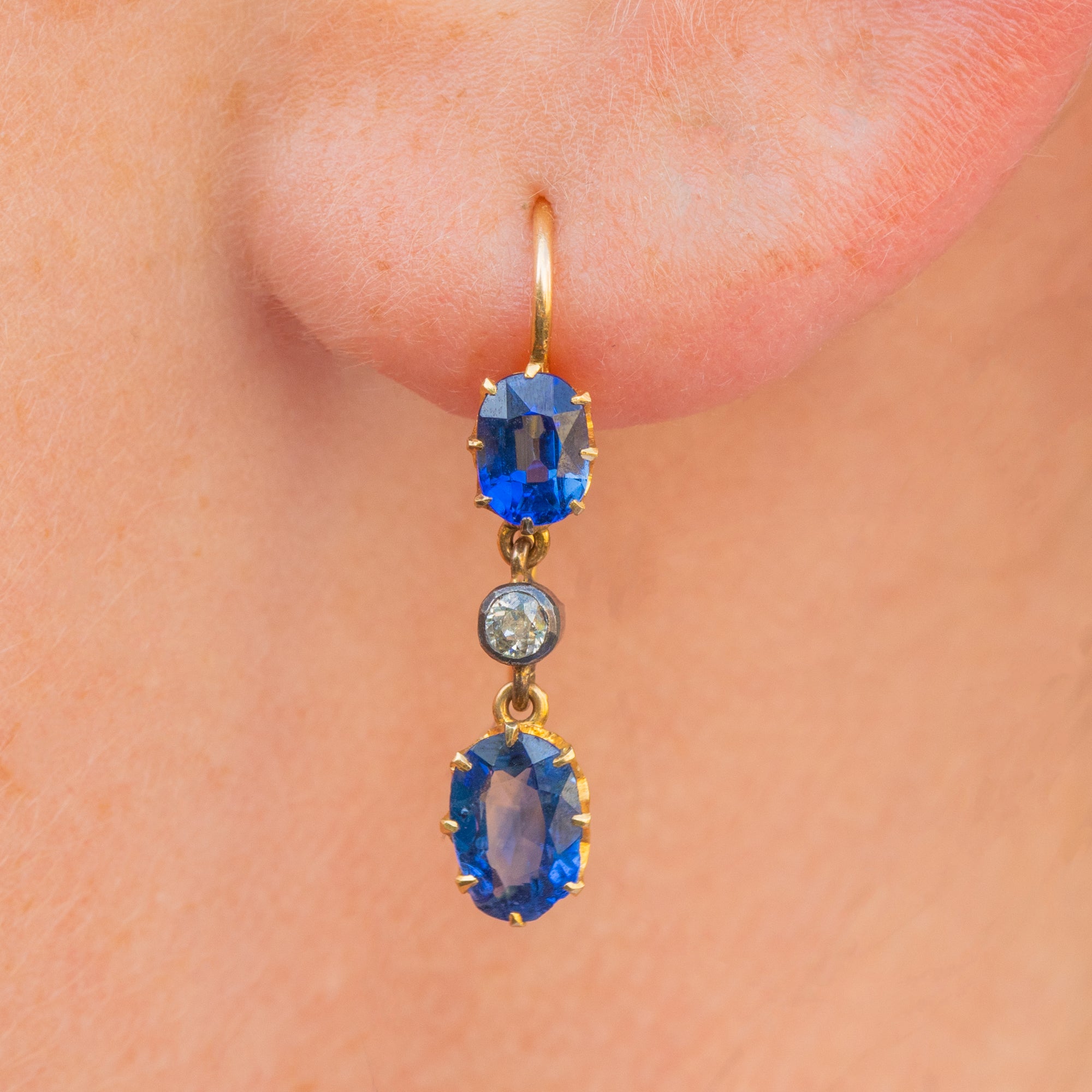 Antique 15ct Gold Sapphire Diamond Drop Earrings, 2.16ct Sapphires
