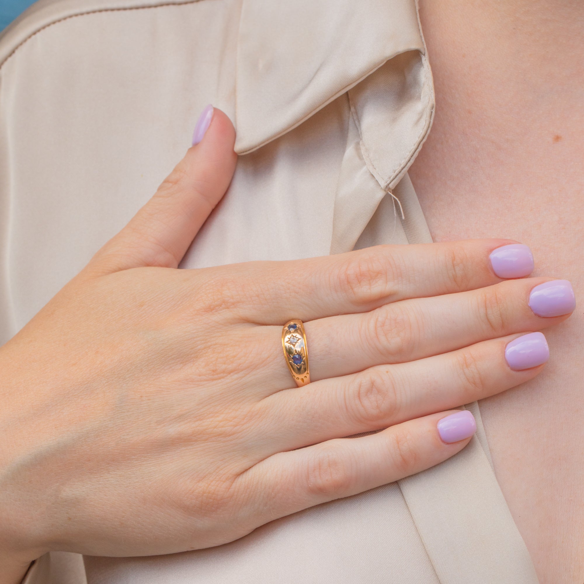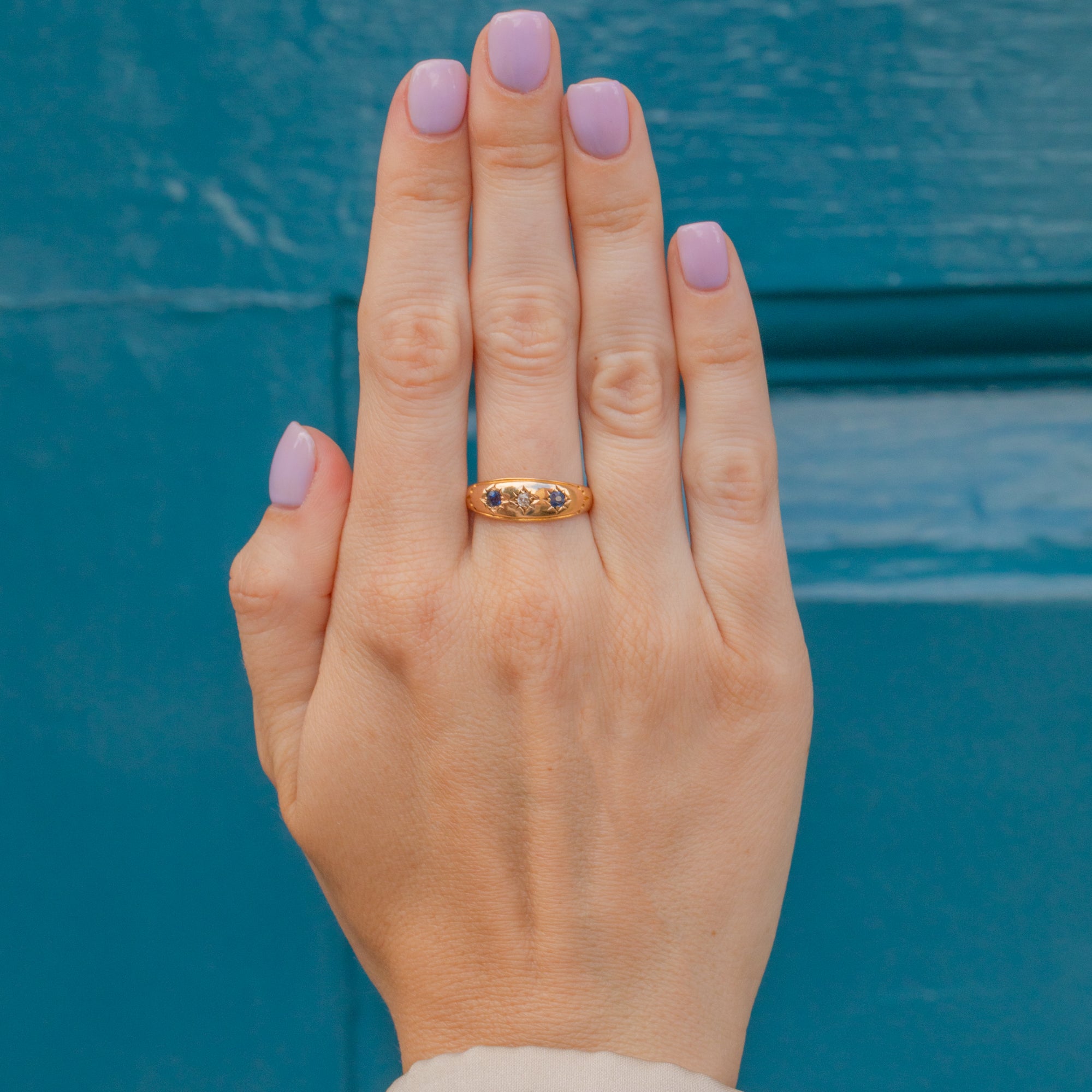 No longer used as a ring stopper, but worn in appreciation of her sheer beauty, this antique 15ct Gold Sapphire Diamond gypsy ring is a must-have! Inlaid with a star set Diamond flanked between two midnight blue Sapphires, this gemstone duo brings elegance.