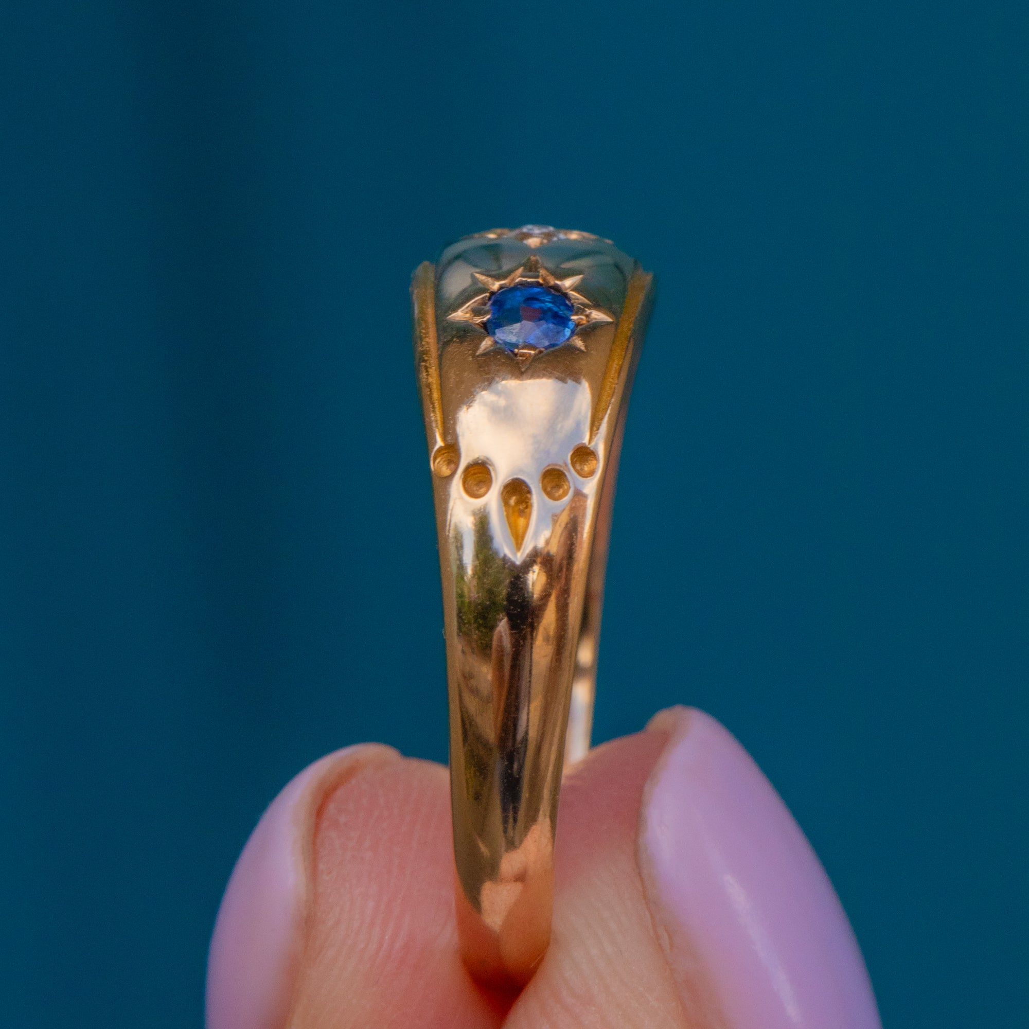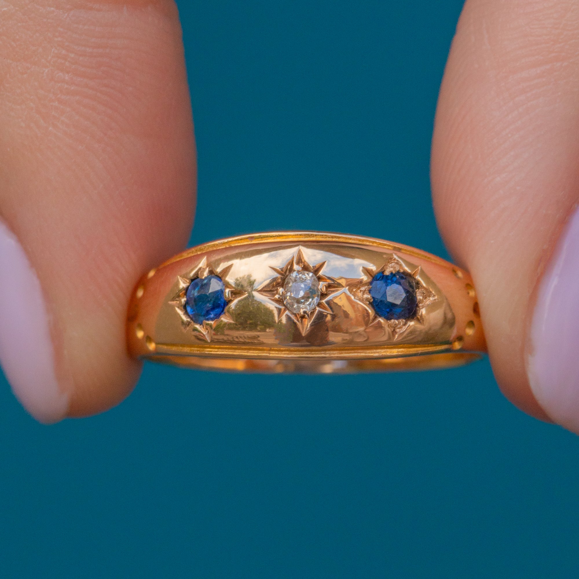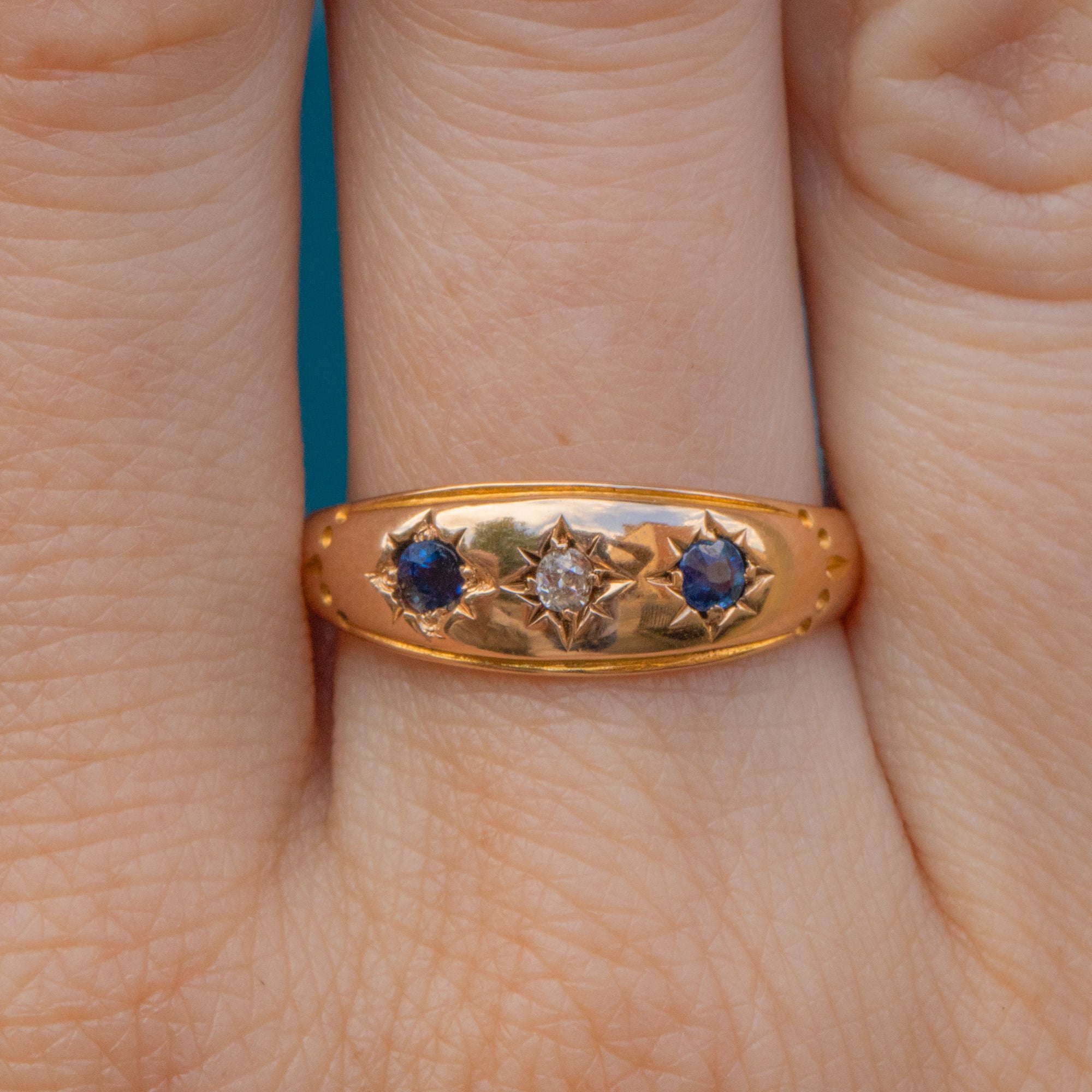 VERY GOOD-EXCELLENT. This antique 15ct Gold Sapphire Diamond gypsy ring is in very good to excellent condition! The Sapphires and Diamonds sit secure within their star settings with the colours offsetting beautifully against one another. To the culet of one Sapphire there is a small chip but nothing untoward. The Gold throughout has gorgeous reflective qualities and her perfectly round form allows for this Victorian Sapphire ring to be worn in comfort and confidence!