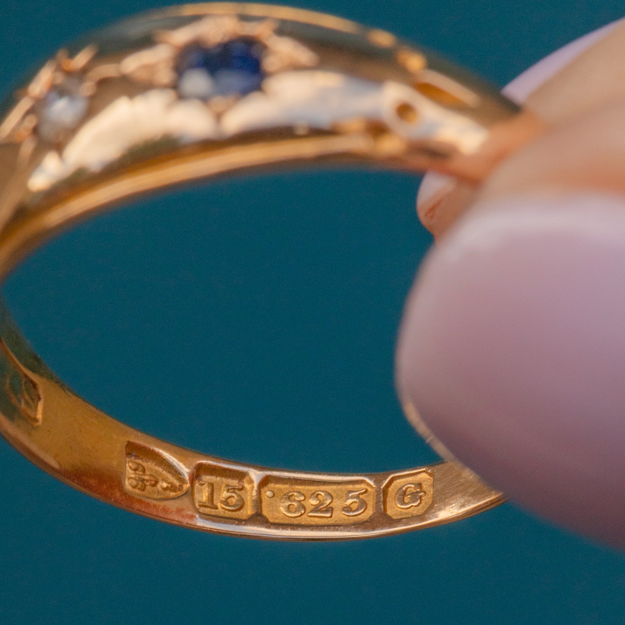 MATERIALS: Tests as 15ct Gold throughout, Sapphire, Diamond.