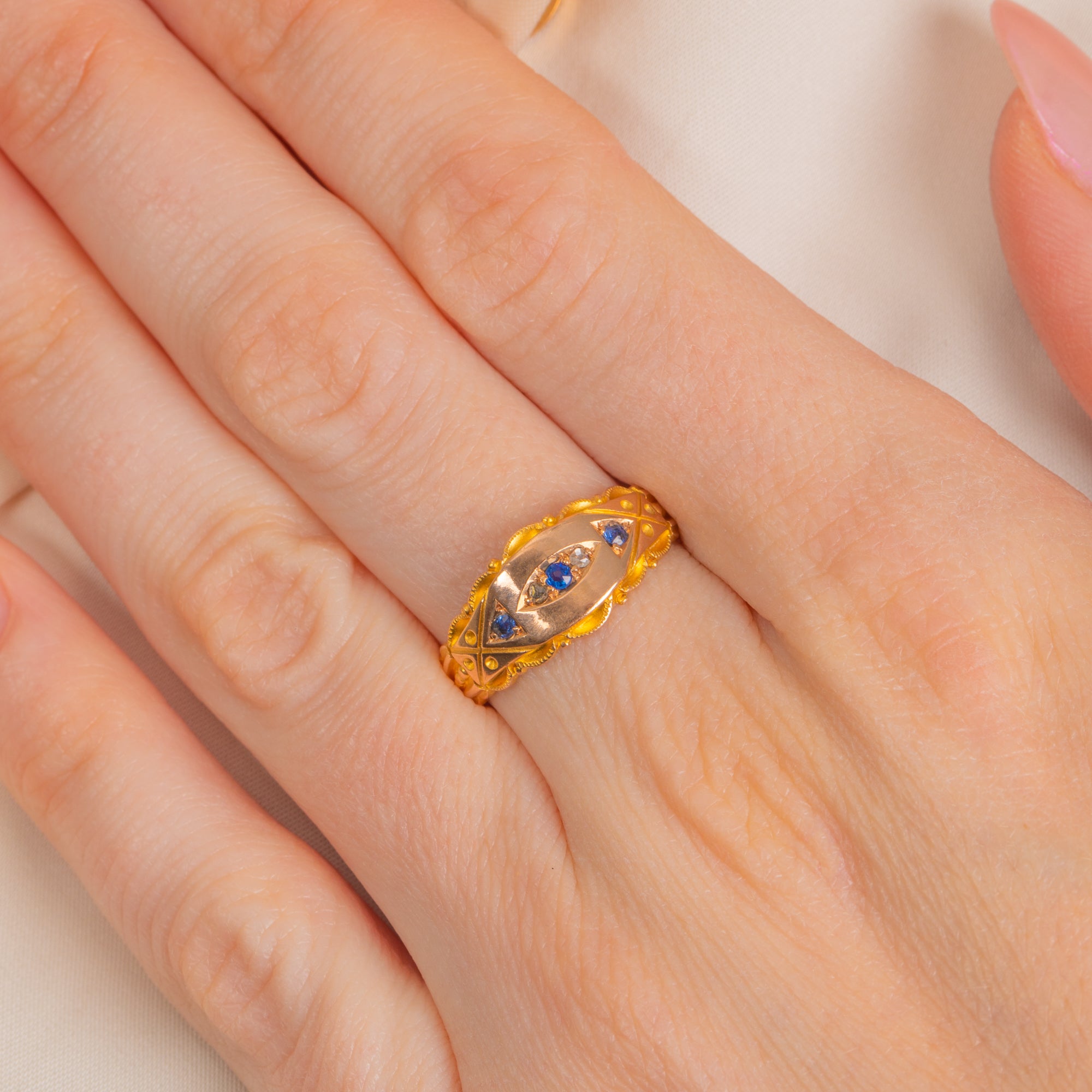 EXCELLENT. This antique 15ct Gold Sapphire Diamond gypsy ring is in excellent condition. This piece has a lovely selection of antique gemstones and is fully hallmarked to the year 1902. The ring has only minor surface wear which is only noticeable under a jeweller's loupe. The gemstones are all held securely in their flush settings and the band has retained its shape remarkably well over the past century.